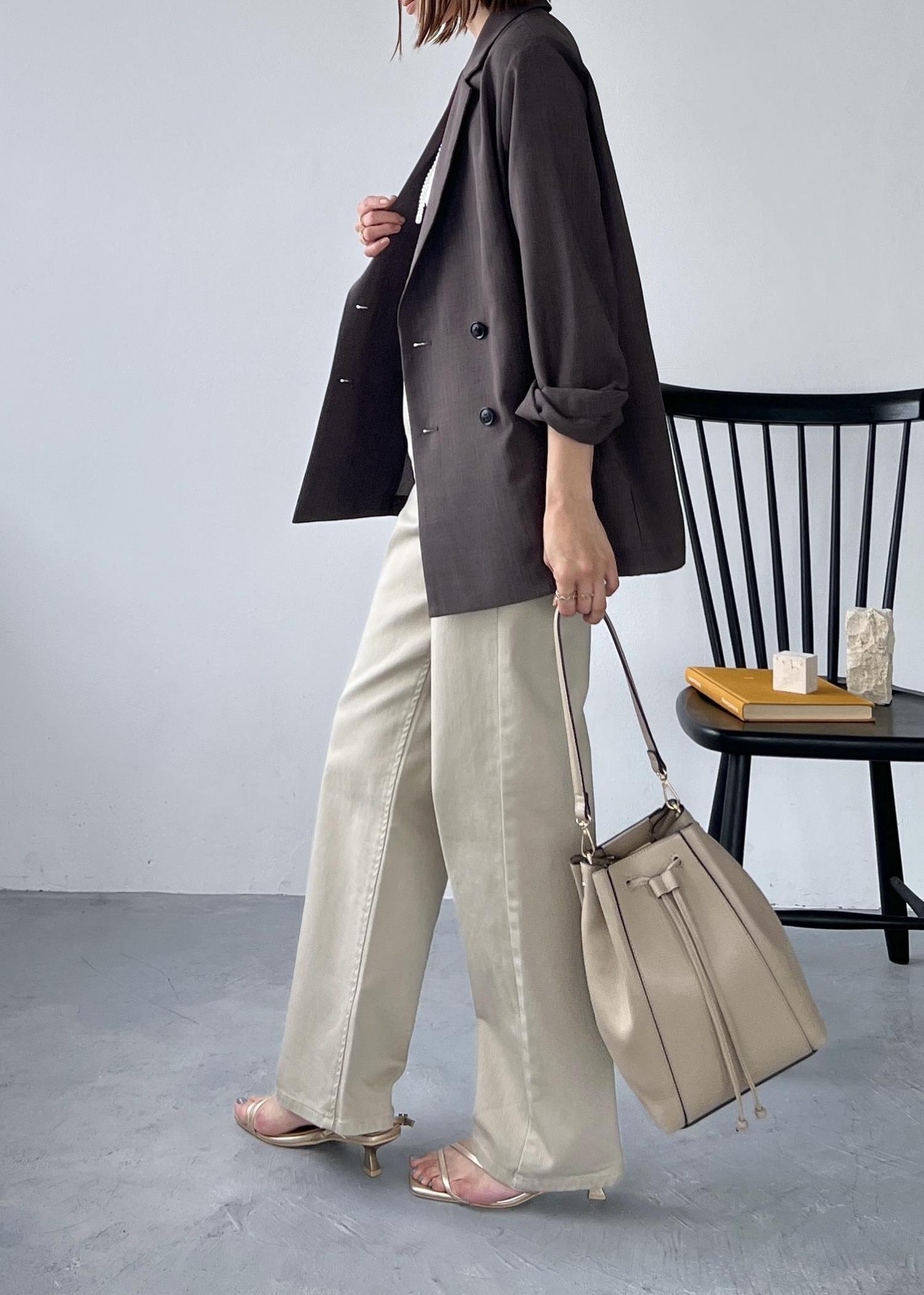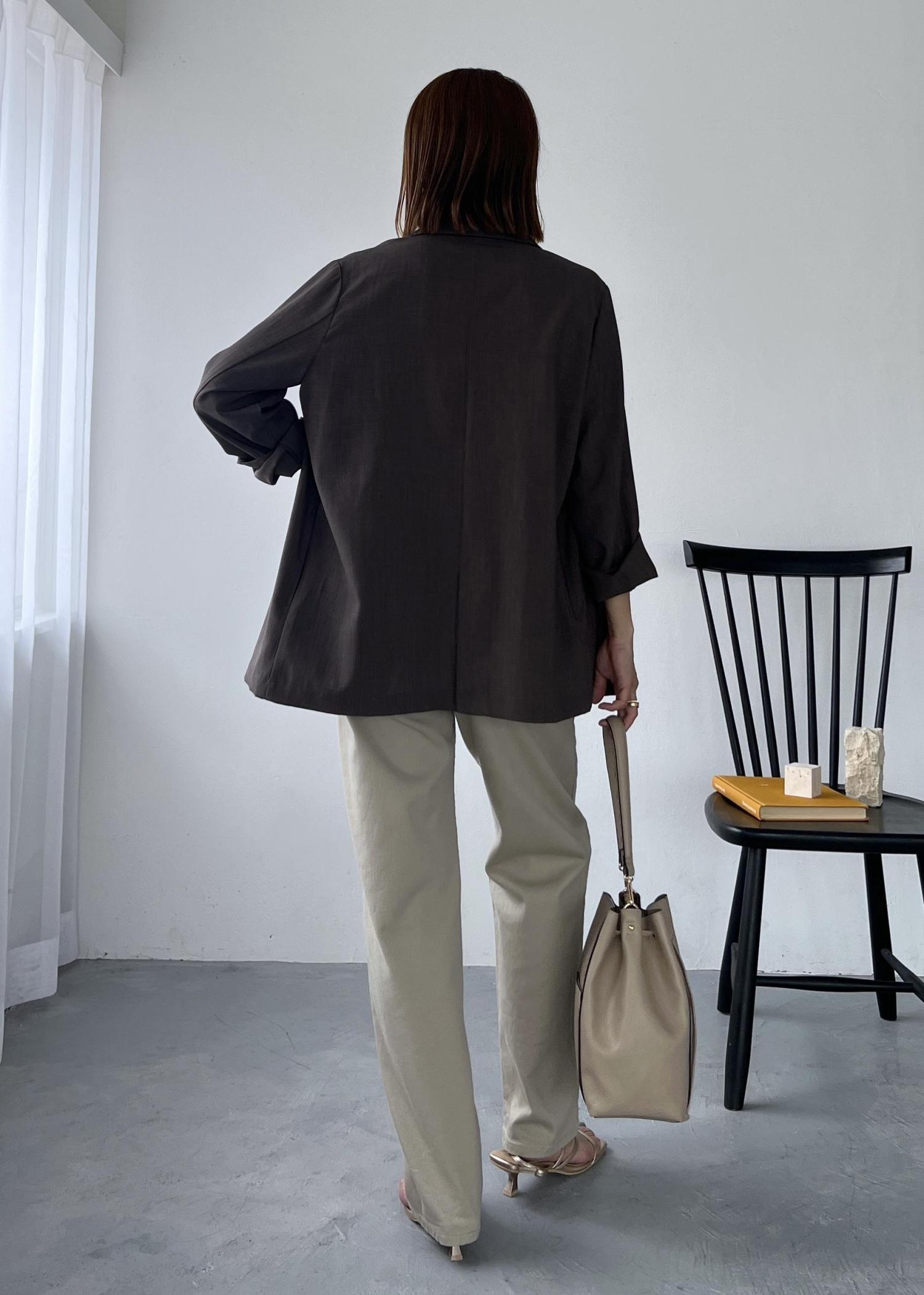 さらっと軽く羽織りやすい麻調素材のジャケットは、ブラウンで大人カジュアルコーデに。