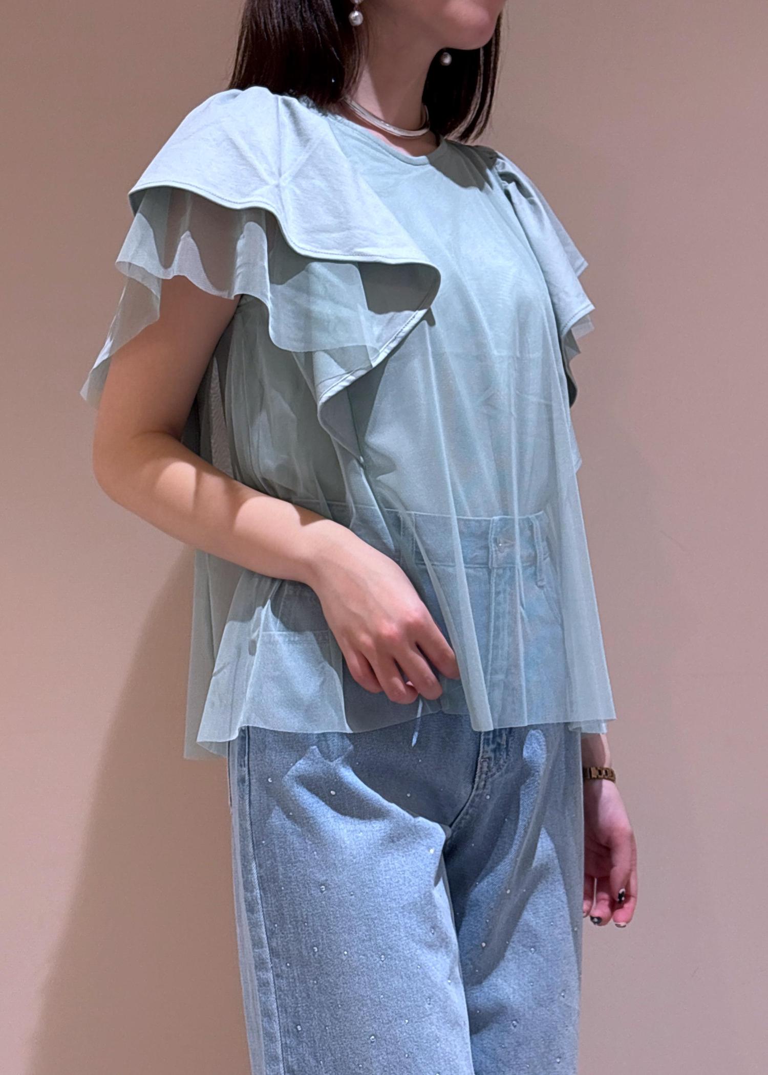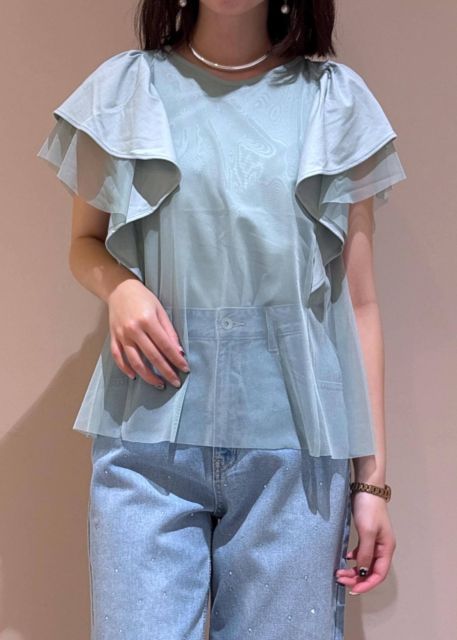 ROPÉ PICNIC【UVカット・接触冷感】Cutee チュールレイヤード風フリルトップスライトグリーン / 38¥3,993レビュー袖フリルが二の腕のカバーになります。