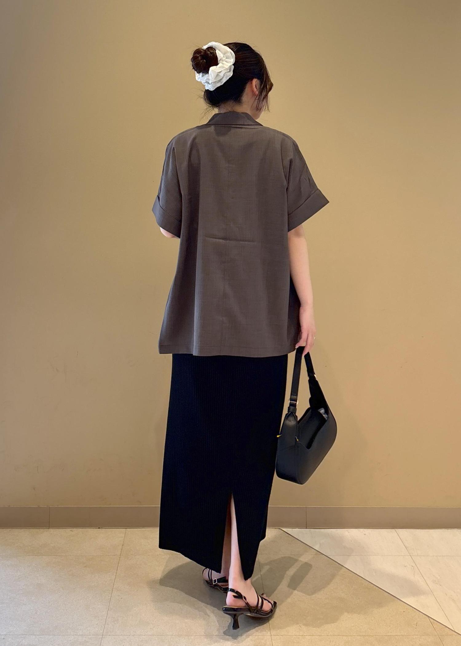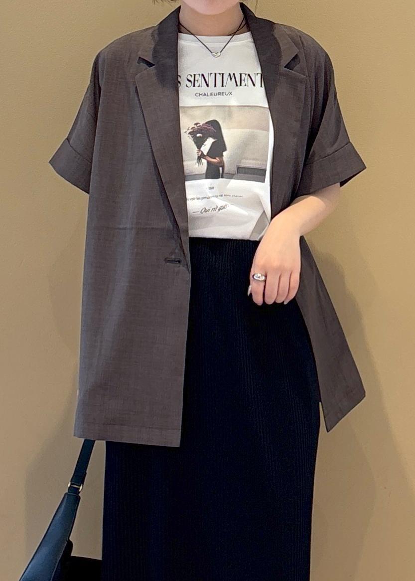 オーバーサイズのジャケットにはIラインスカートが相性◎落ち着いたトーンでまとめた大人カジュアルスタイルです。