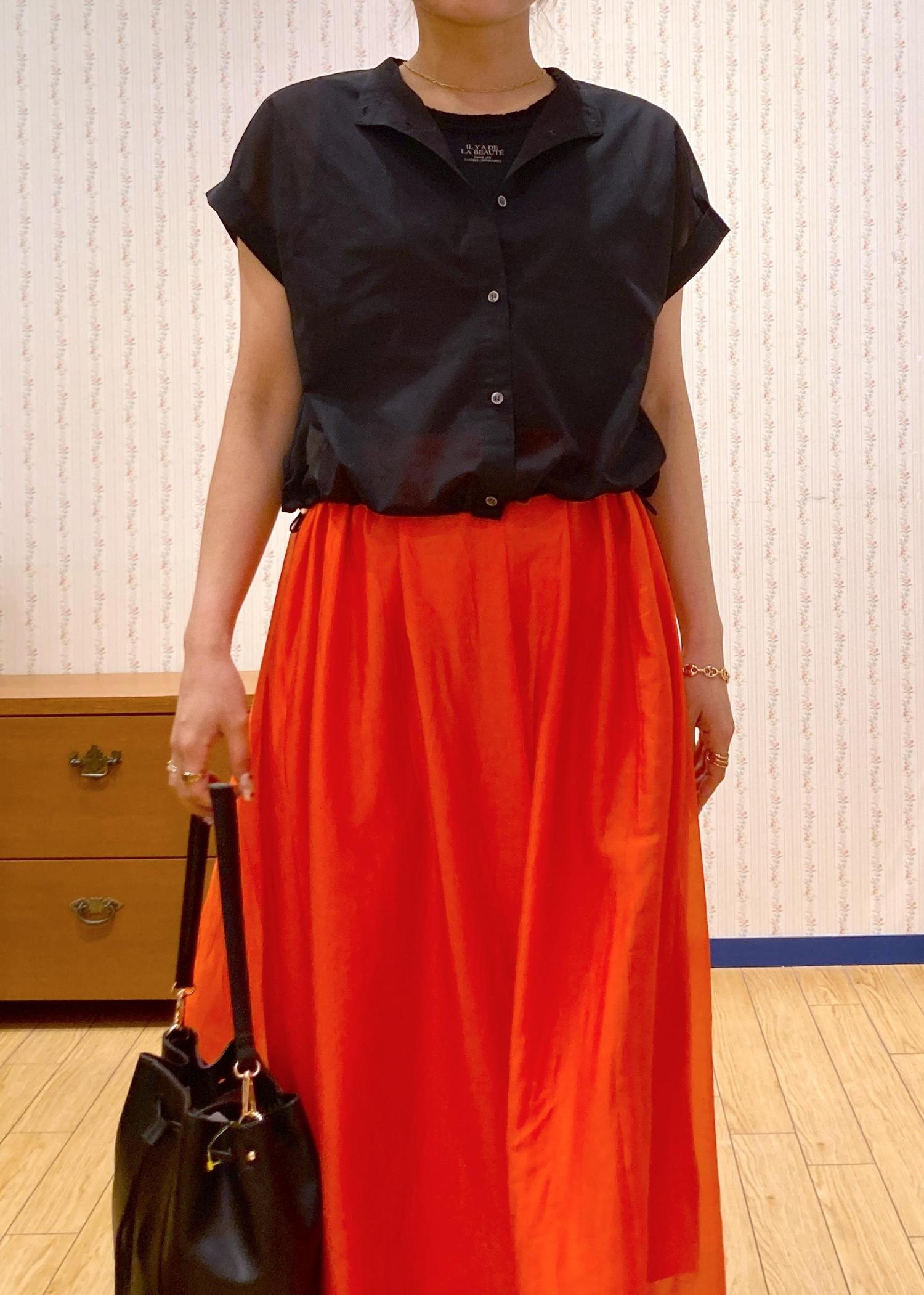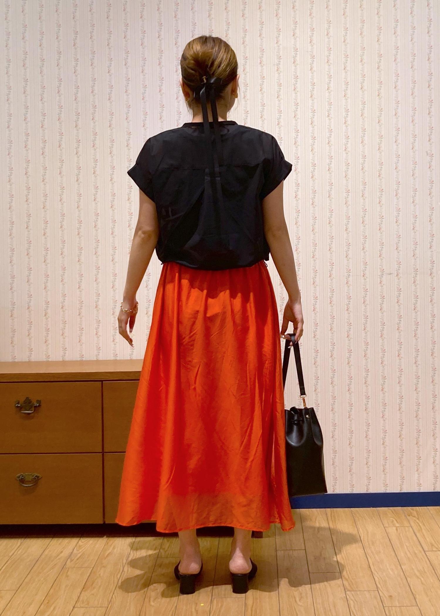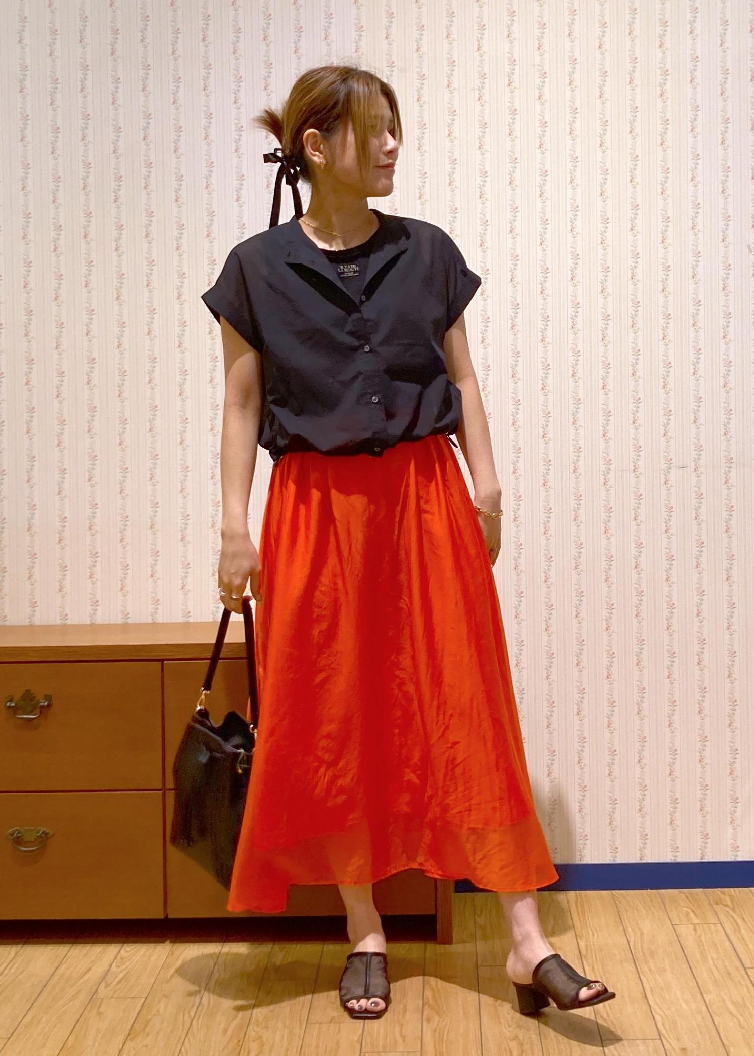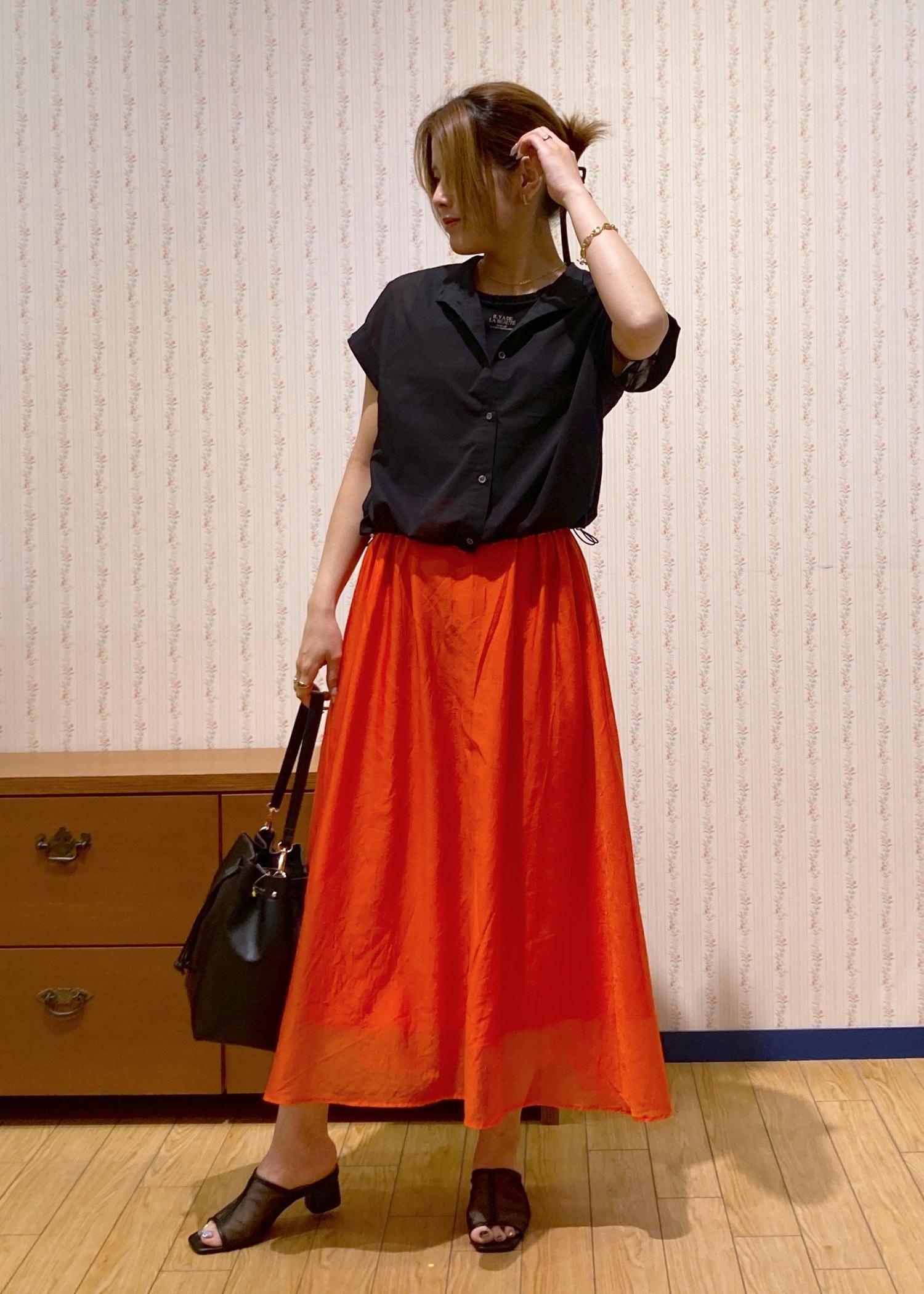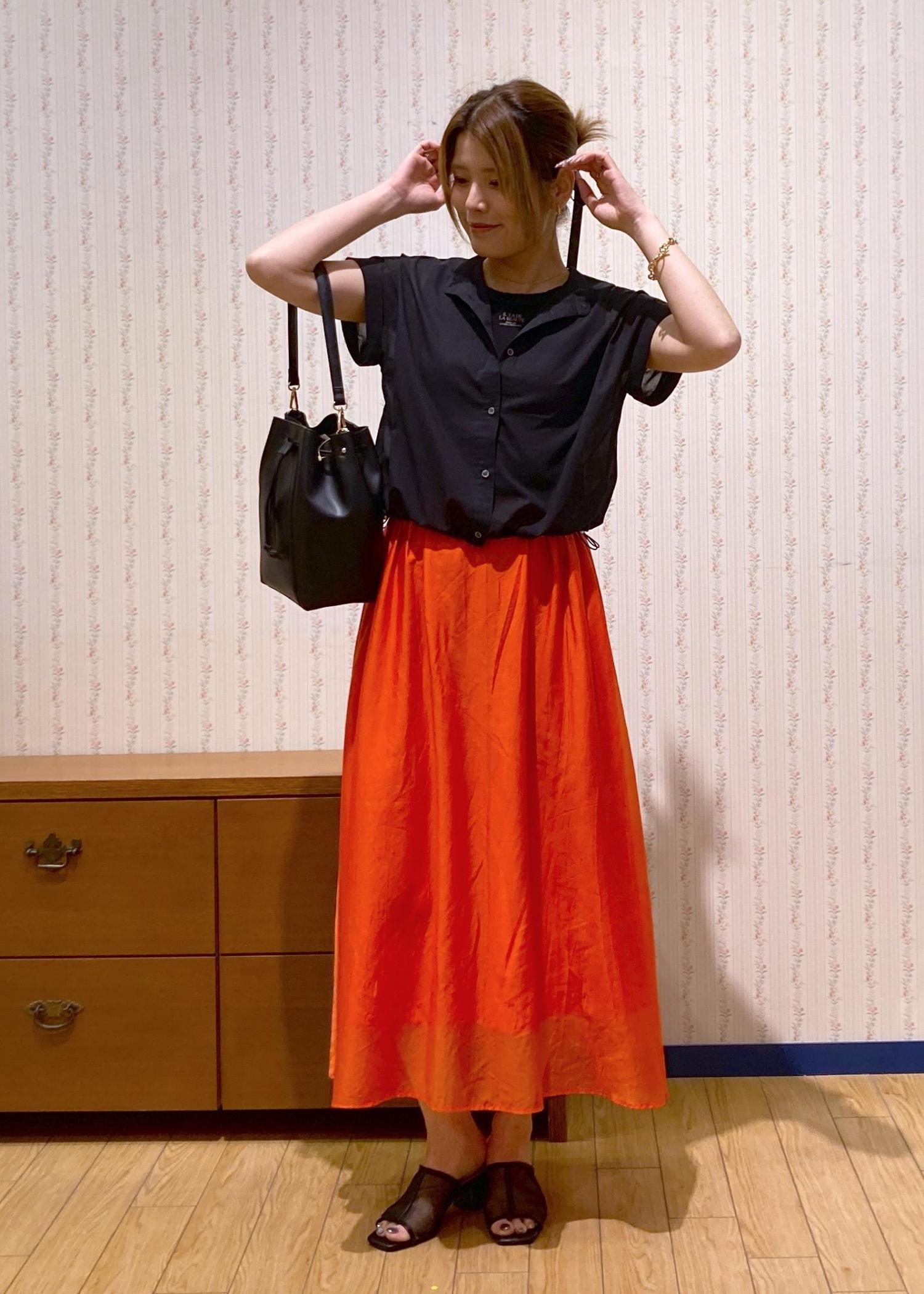 全体をブラックでまとめて、オレンジのスカートを差し色に使ったモード感のある綺麗めコーディネート。