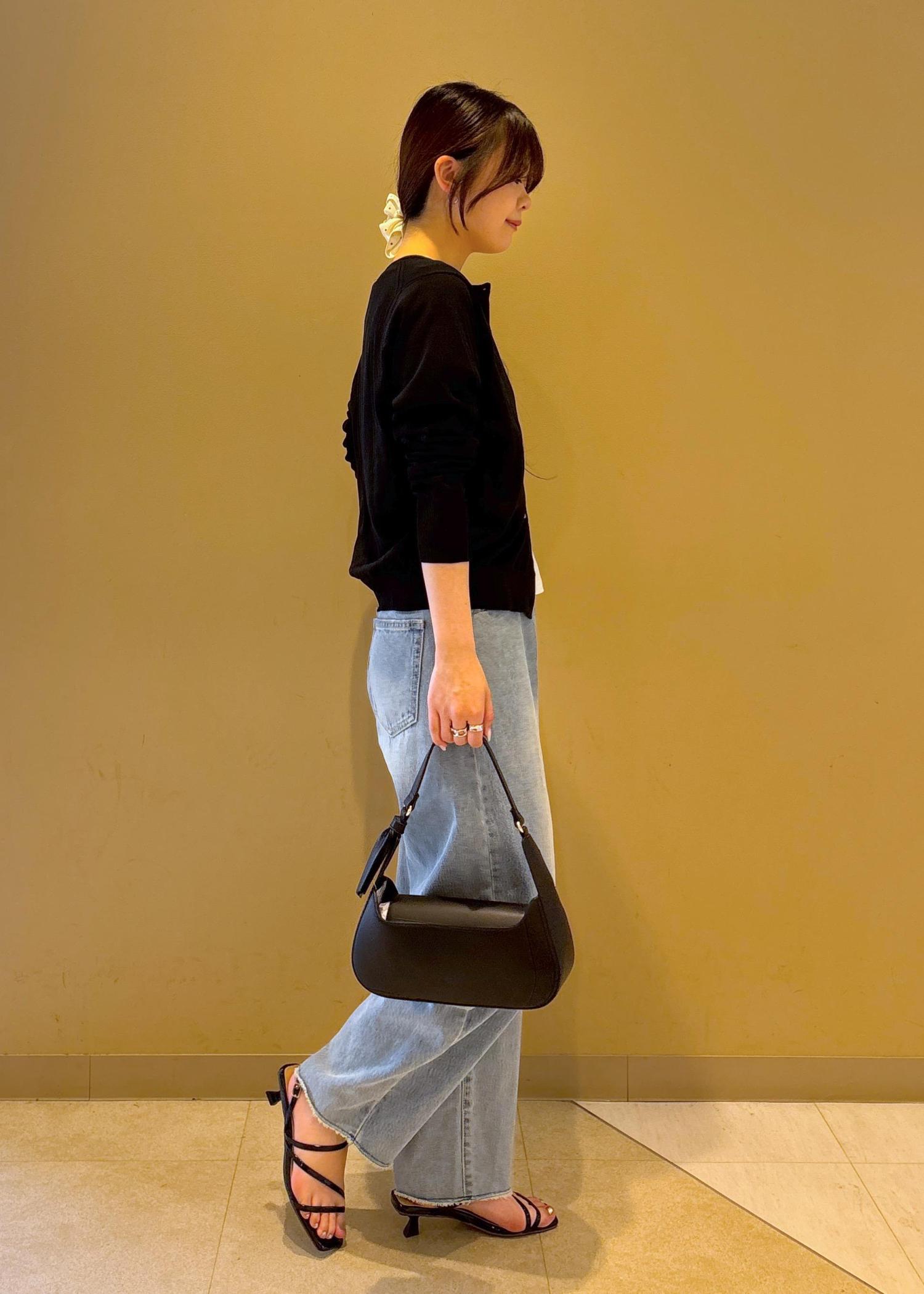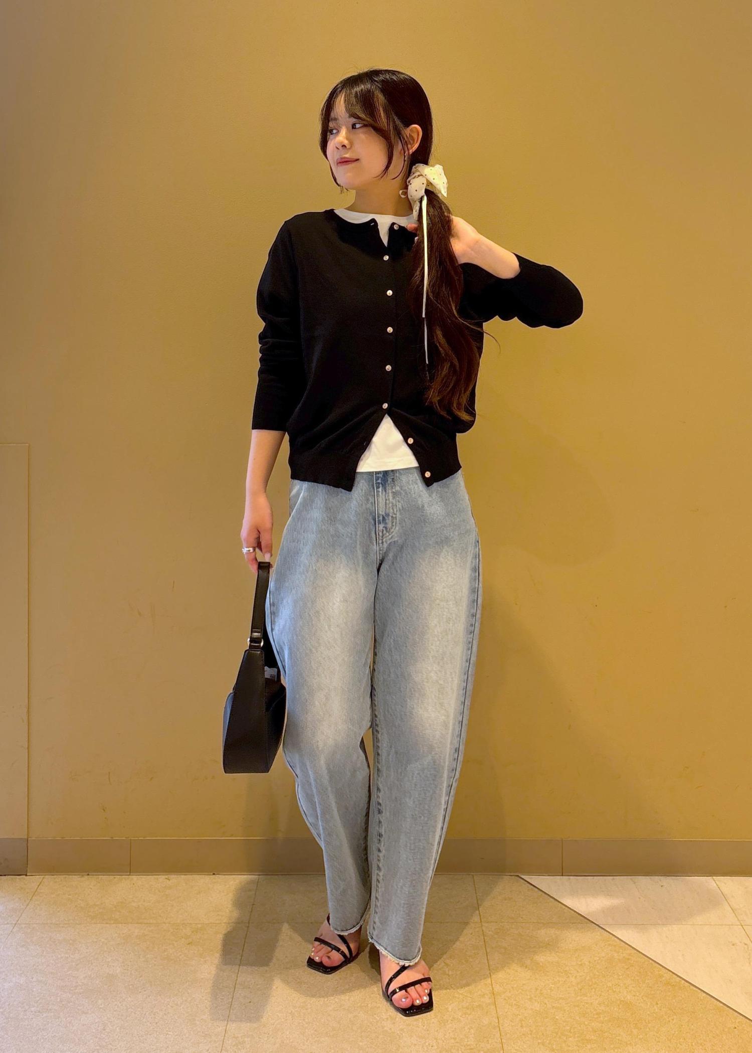 ベーシックアイテムを揃えたヘルシーな雰囲気のコーディネート。カーデは上下のボタンを開けてインナーを見せると今っぽい抜け感が出て◎ドットのシュシュがアクセントです♡