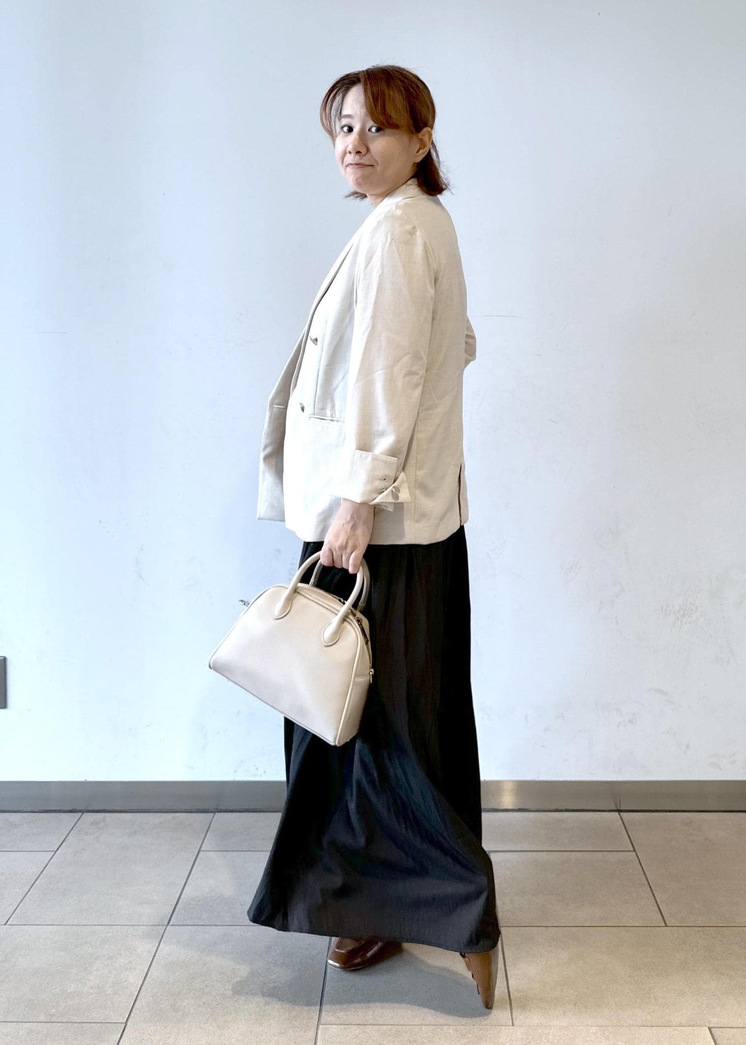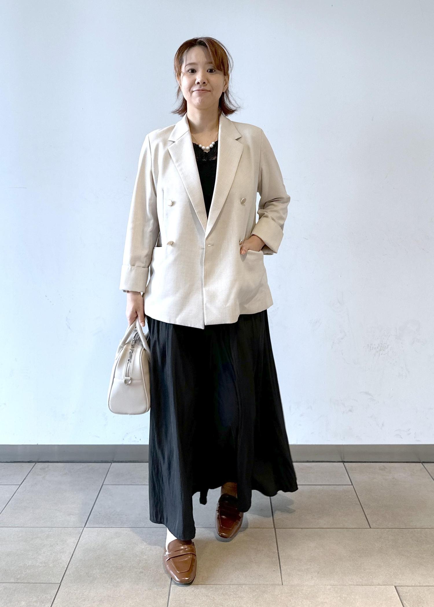 ベージュのジャケットにきっちり感を出しつつもスカーチョで少しラフに。