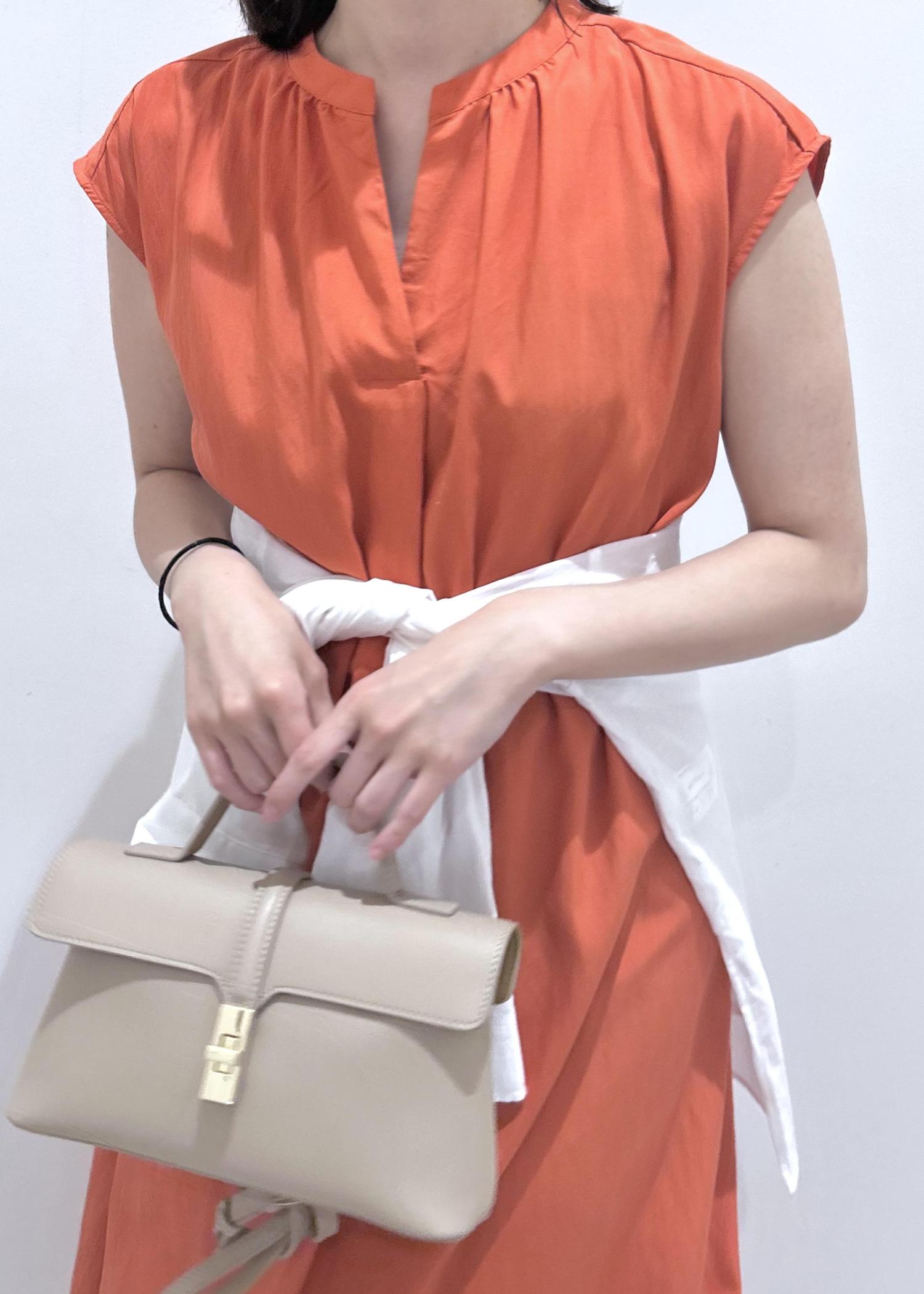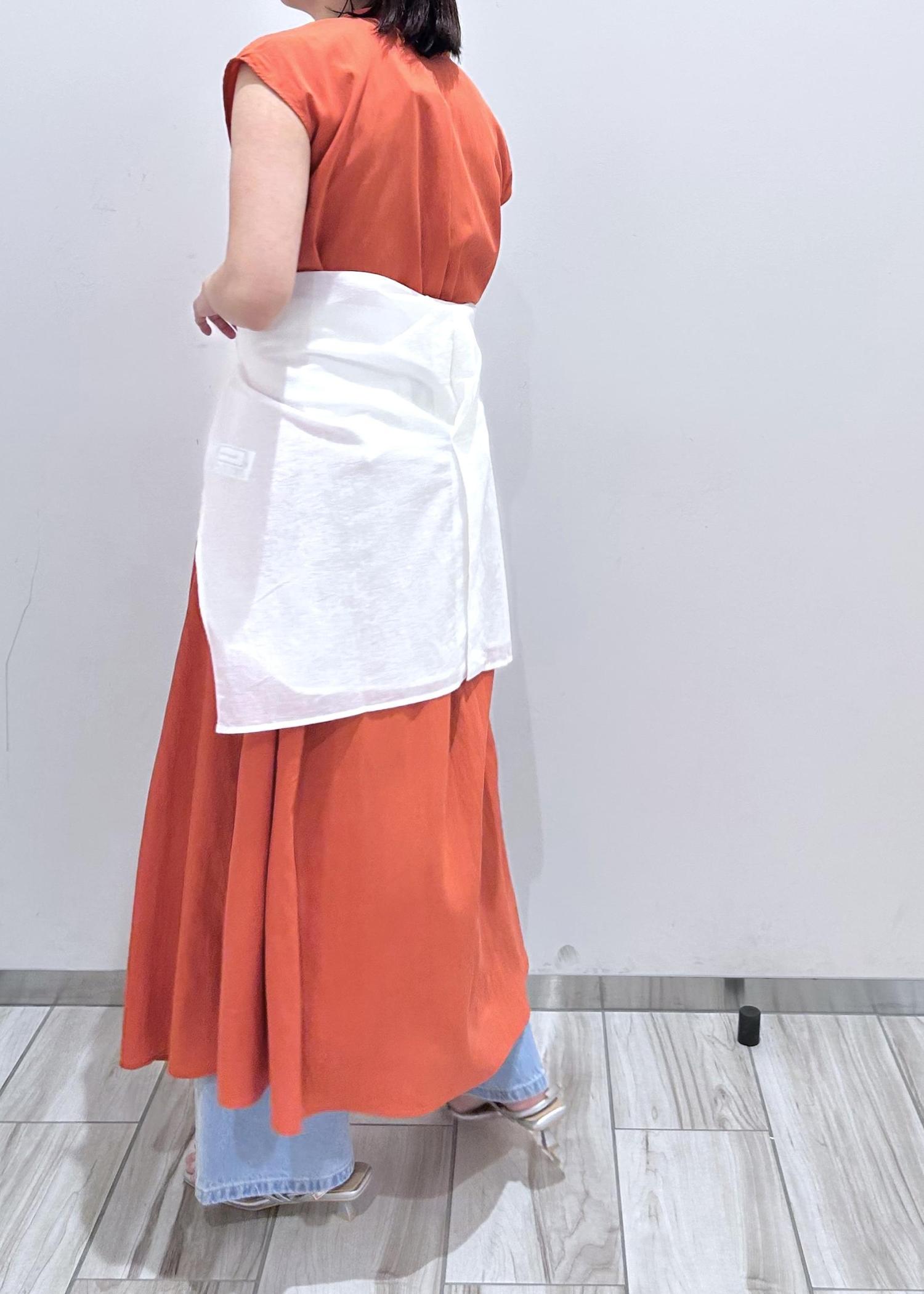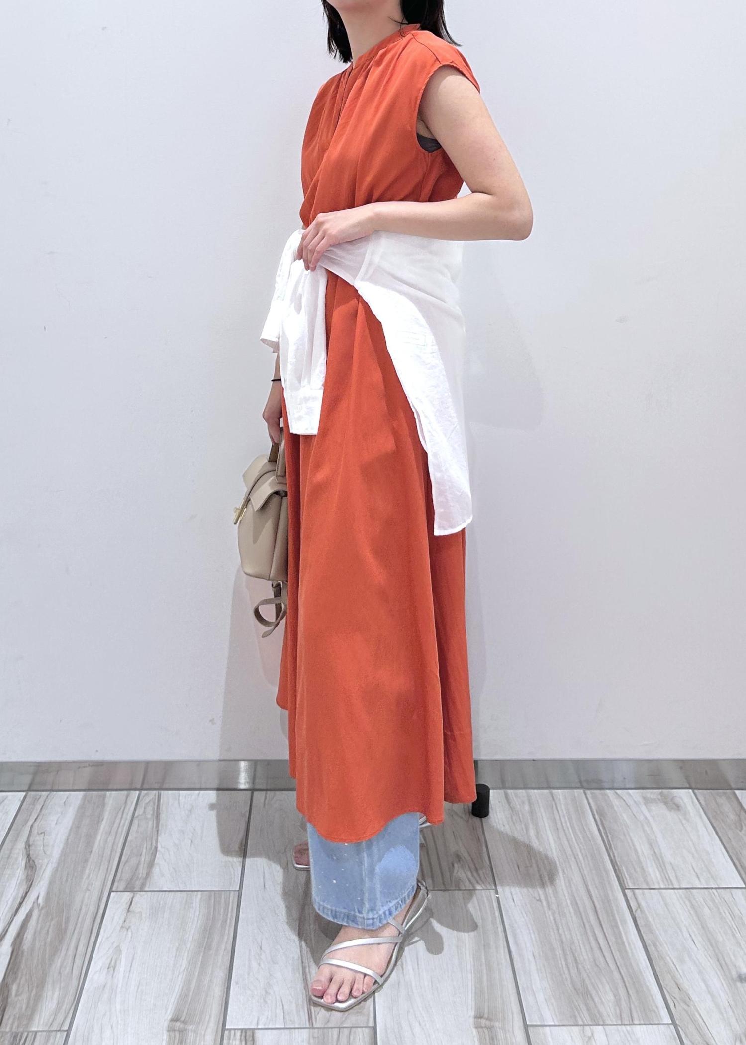 鮮やかなオレンジのフレンチスリーブワンピースにデニムをレイヤードし、白シャツを腰巻きした旬のこなれカジュアルコーデ。