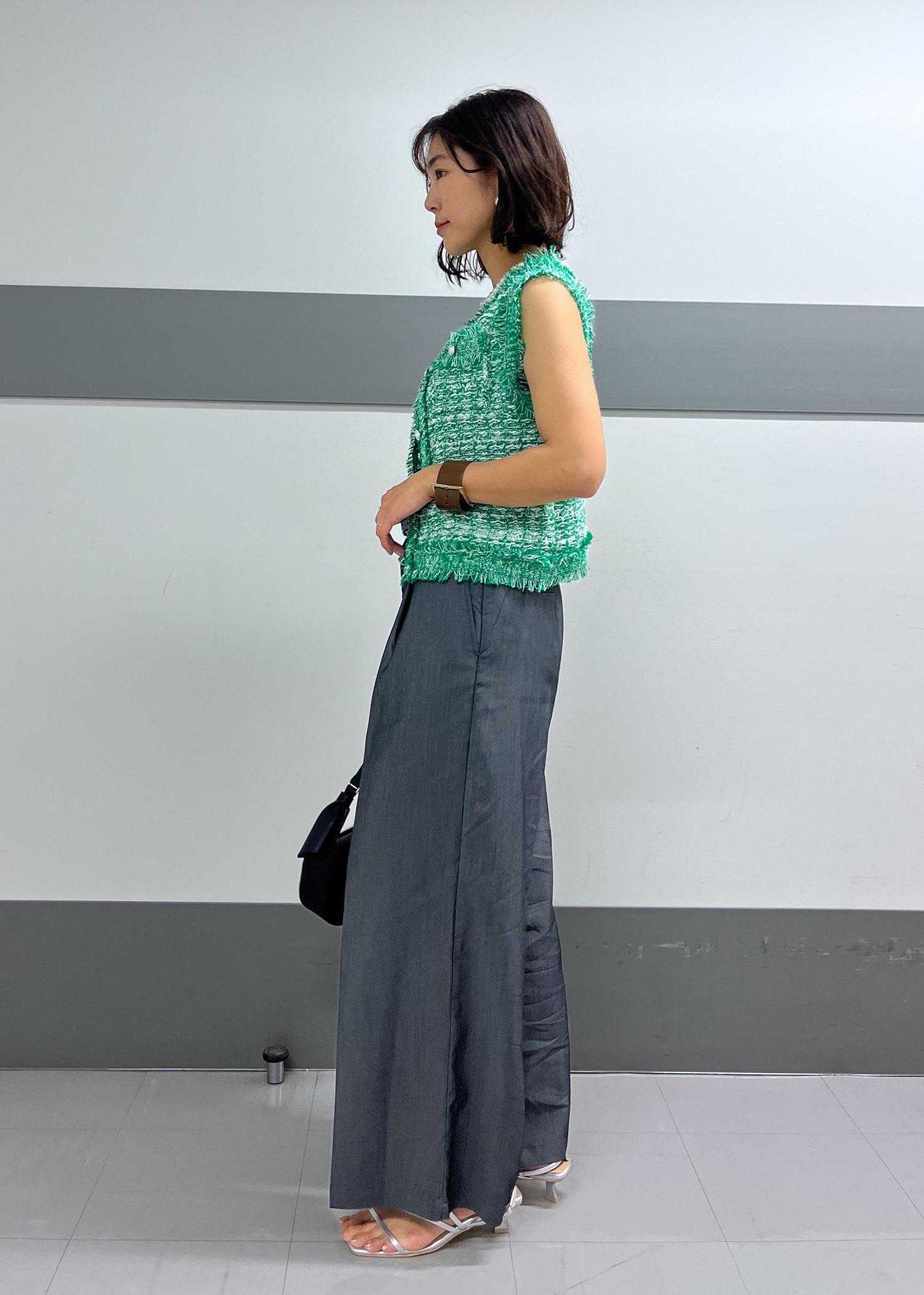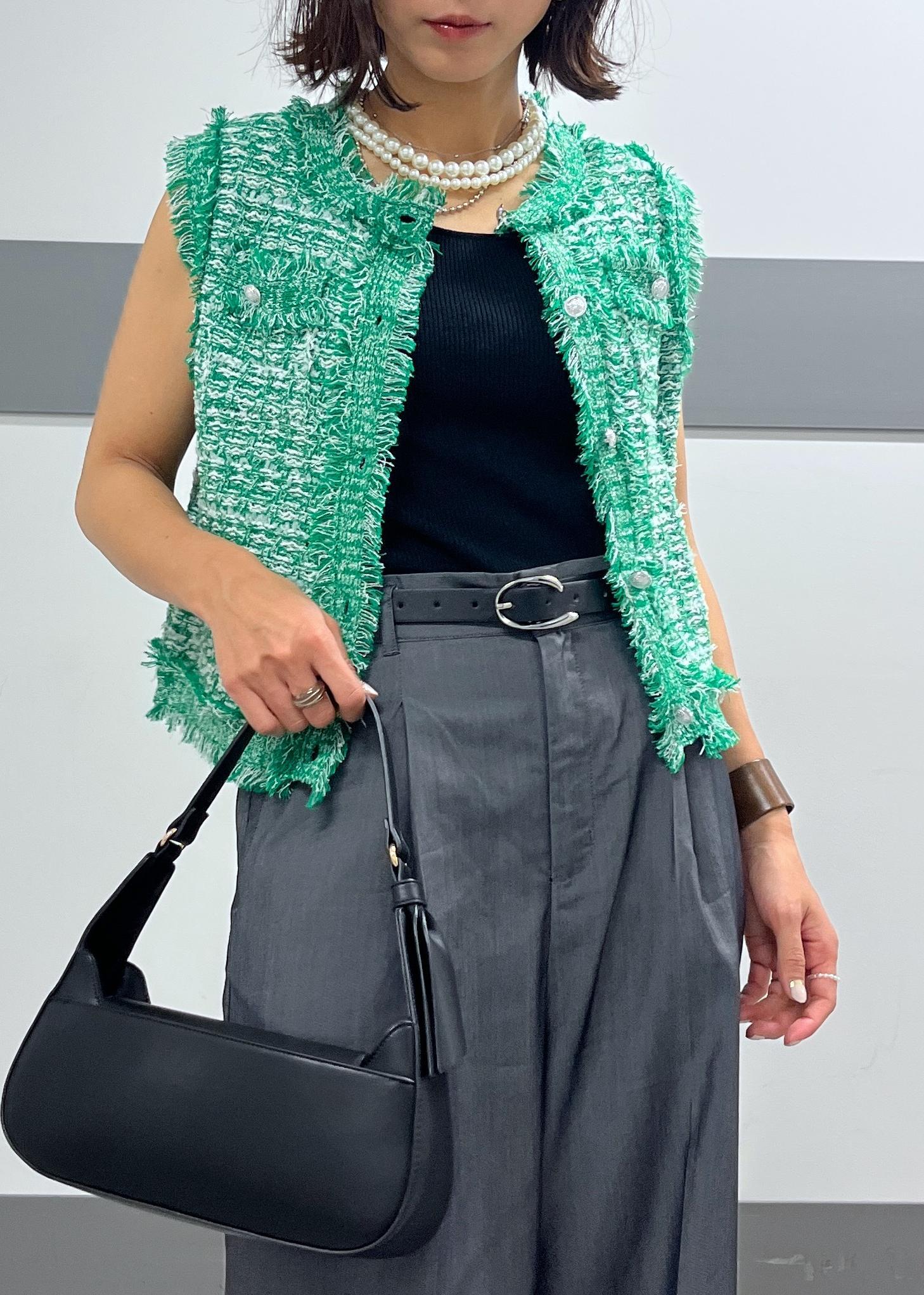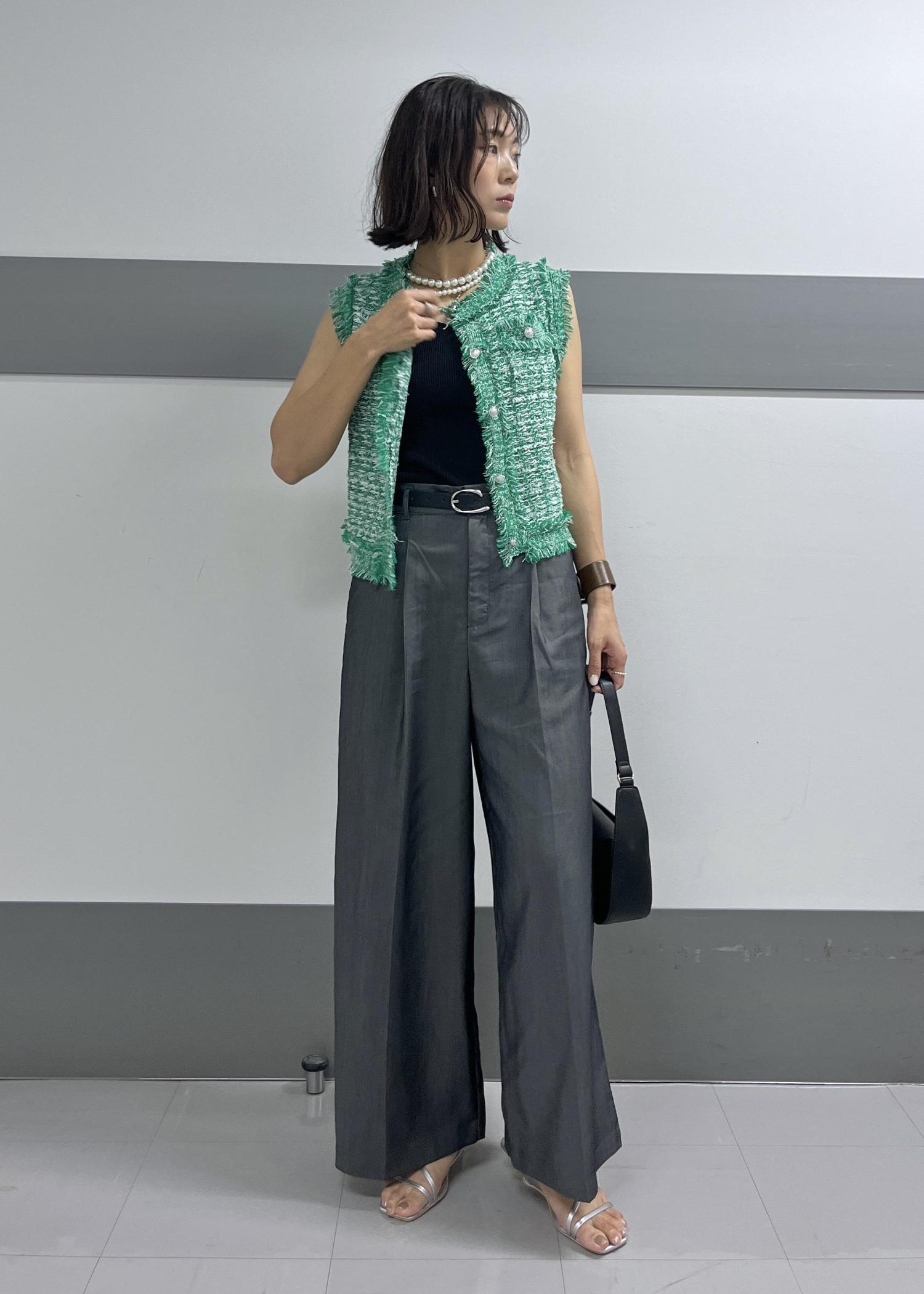 カラーツィードでもブラック系やワイドパンツ、レザーバッグ等スタイリッシュ要素のあるアイテムで合わせることで『大人かっこいい』スタイルで着用できます♪