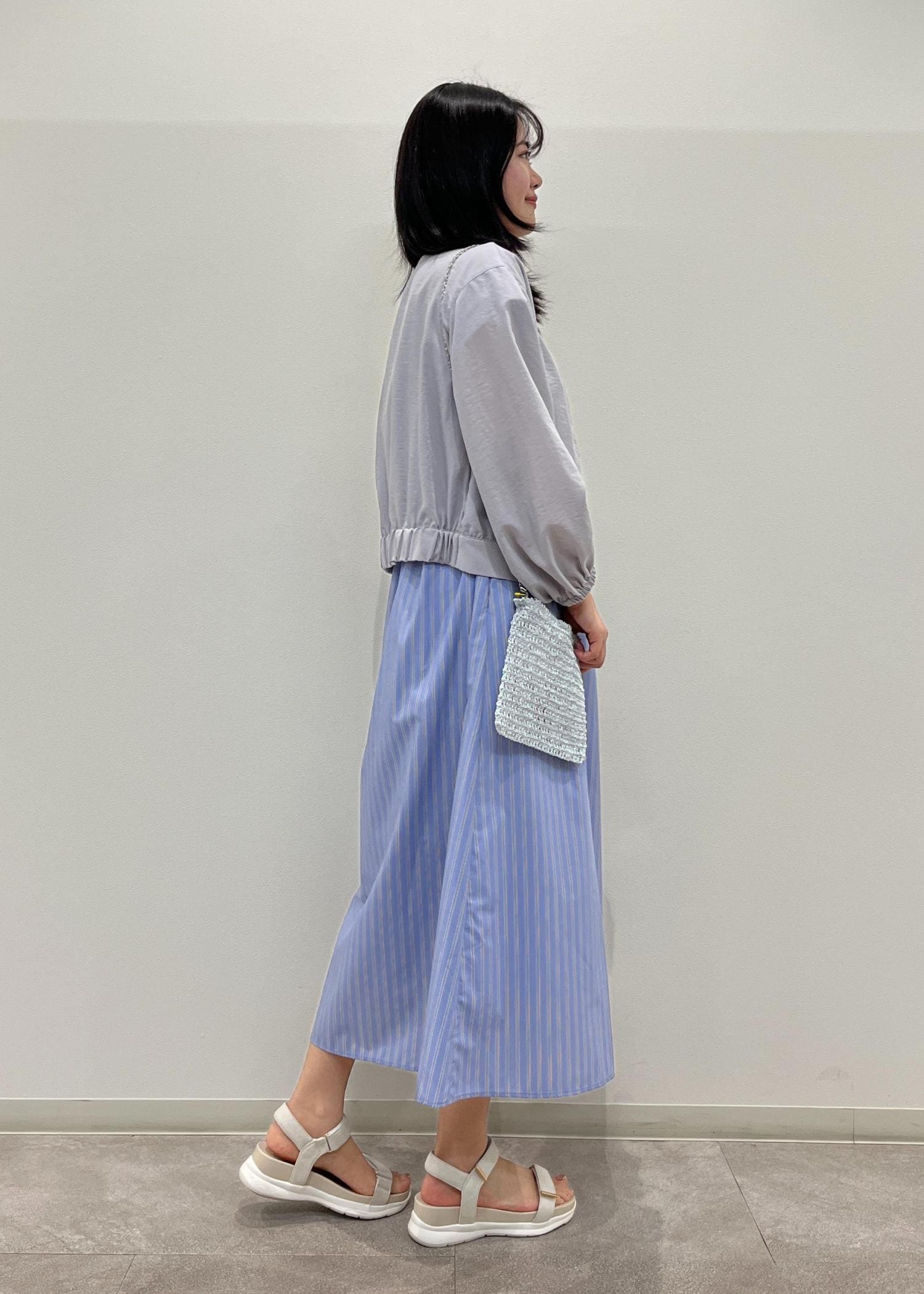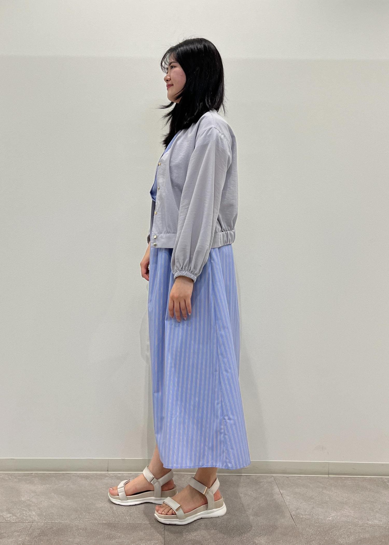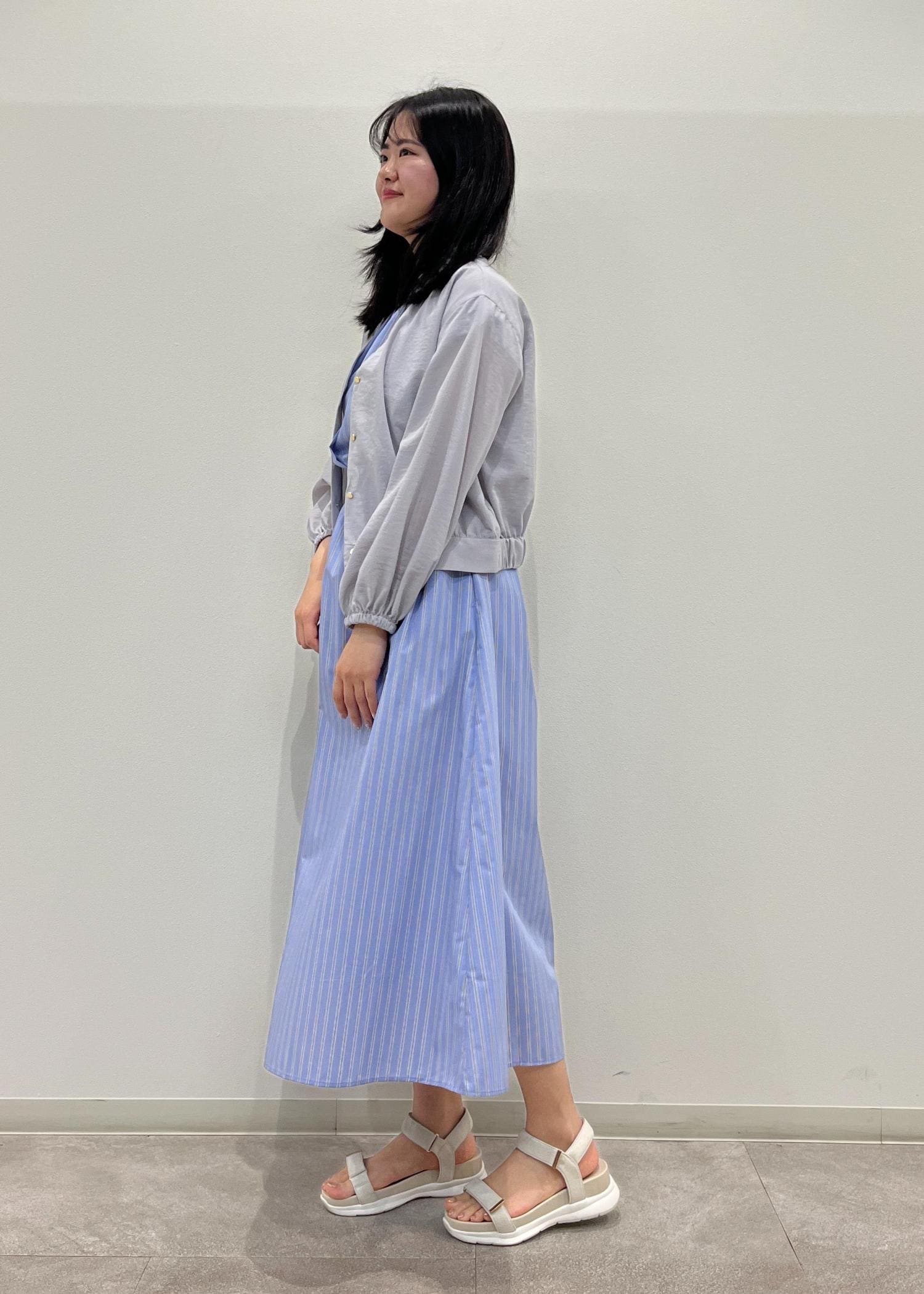 ブルーの爽やかなワンピースにきれいめなブラウスカーディガンを合わせました。
