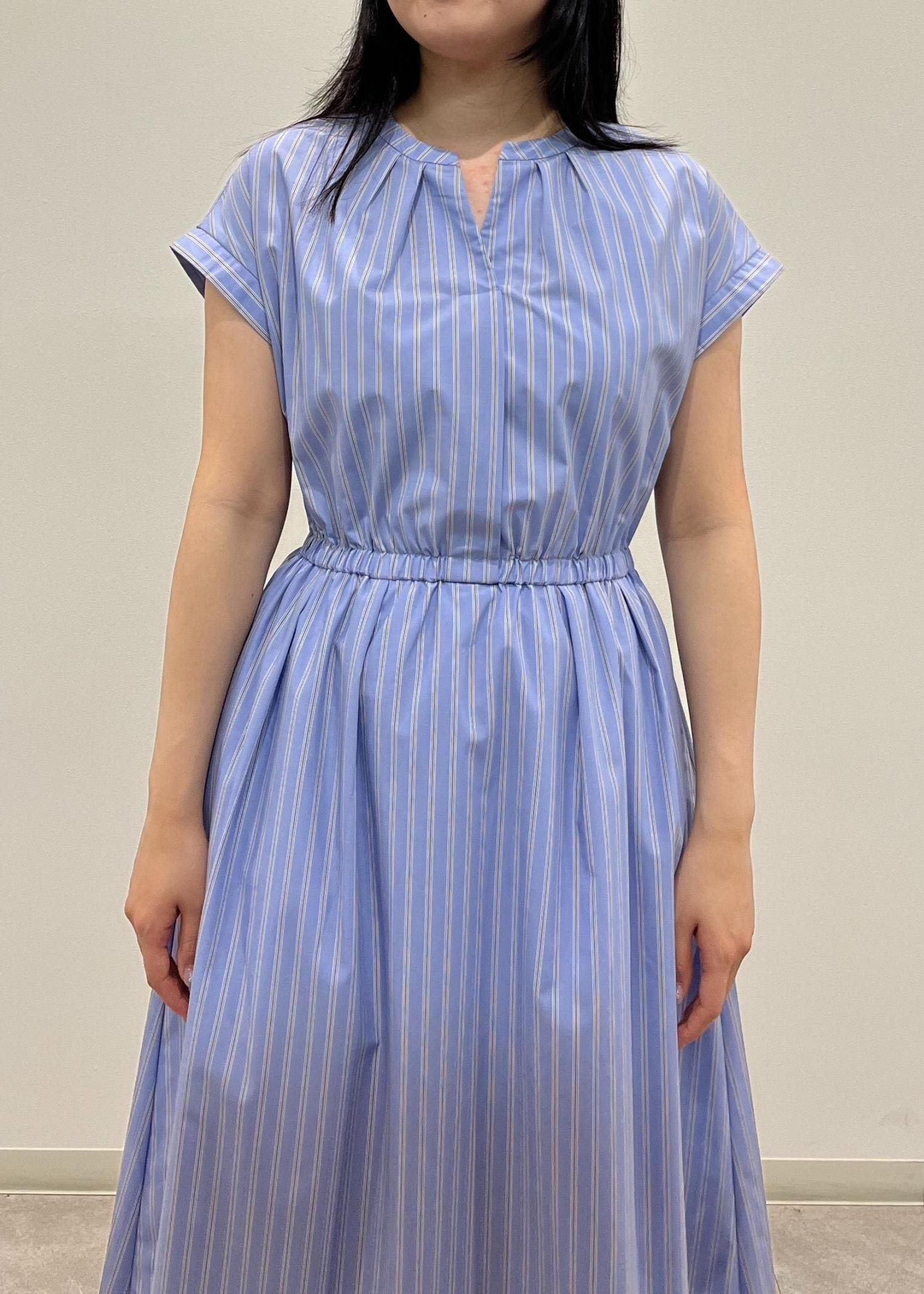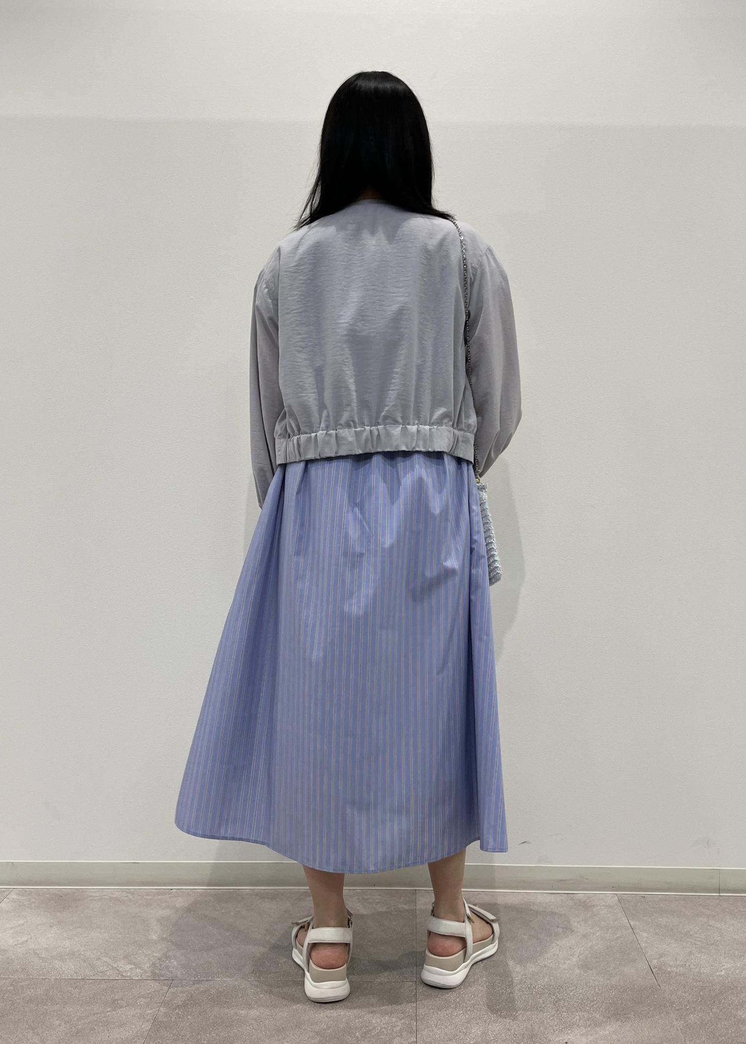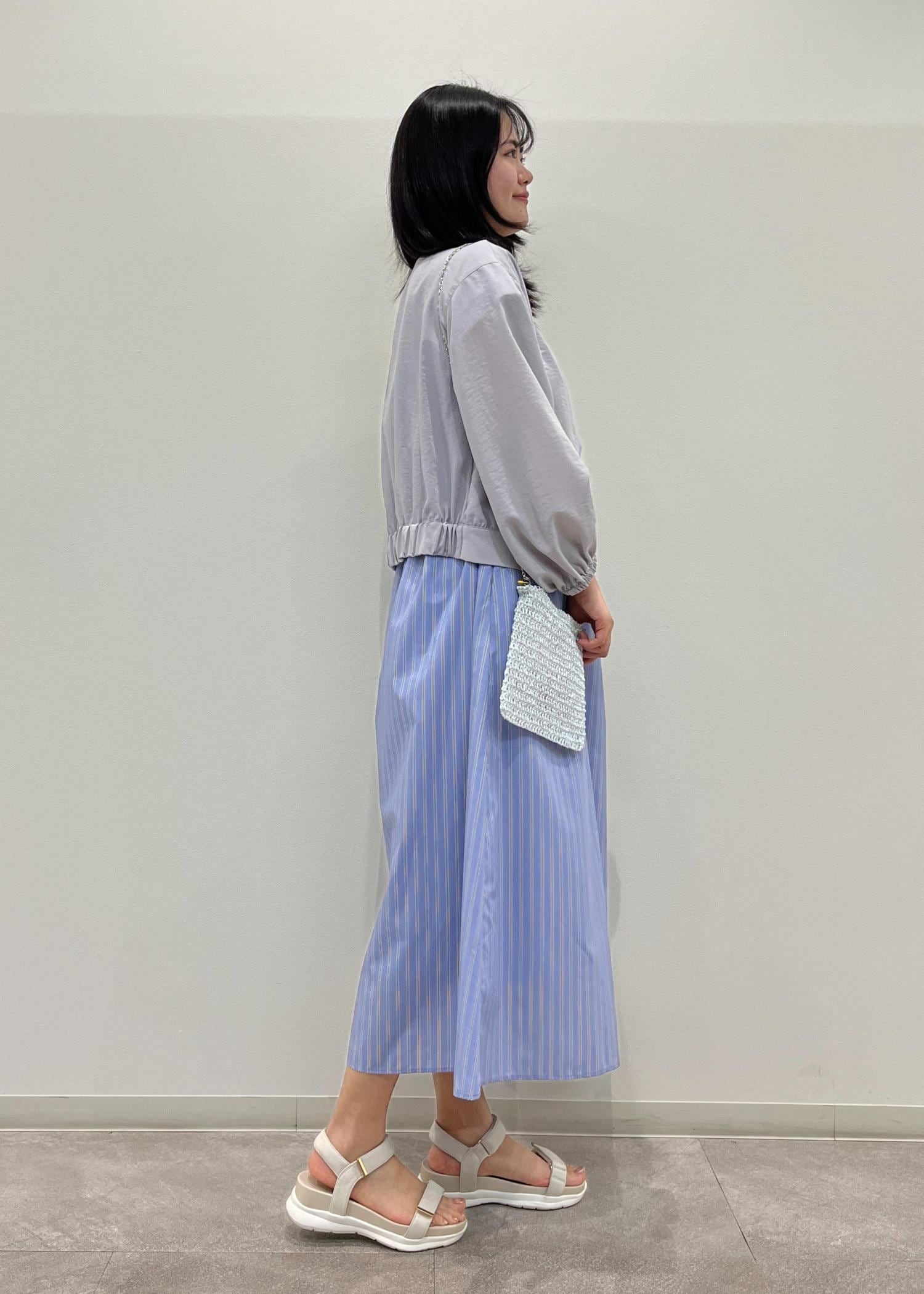 ブルーの爽やかなワンピースにきれいめなブラウスカーディガンを合わせました。