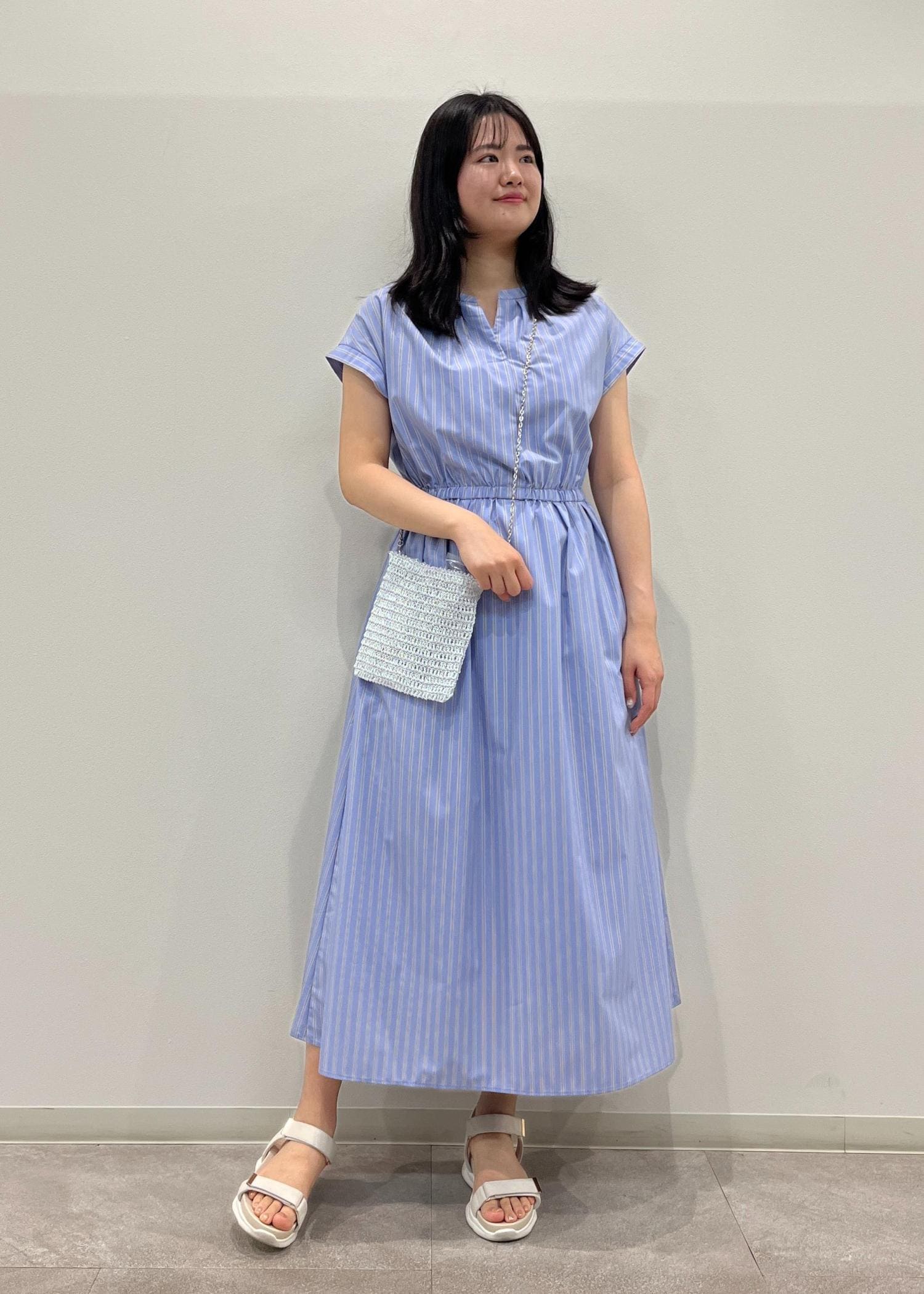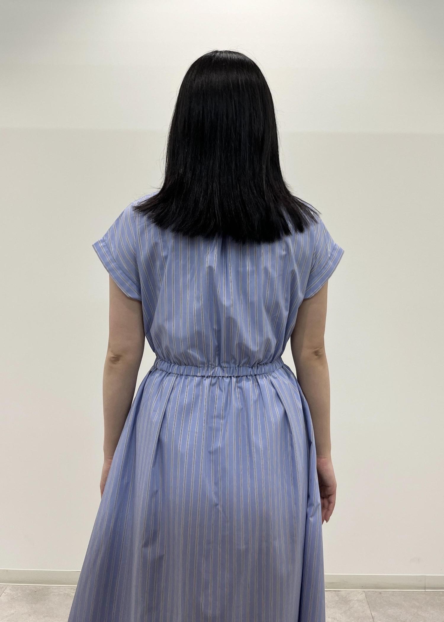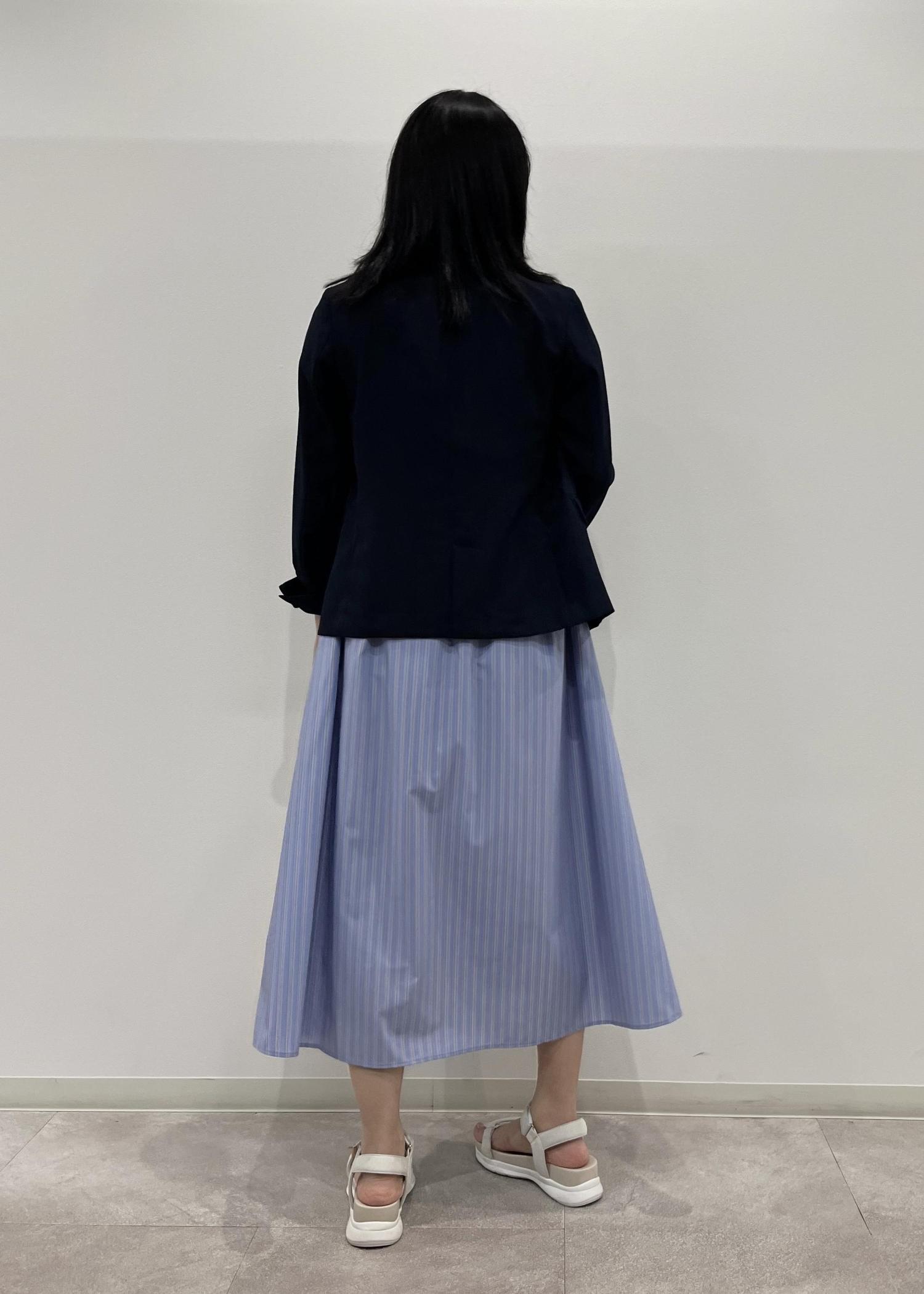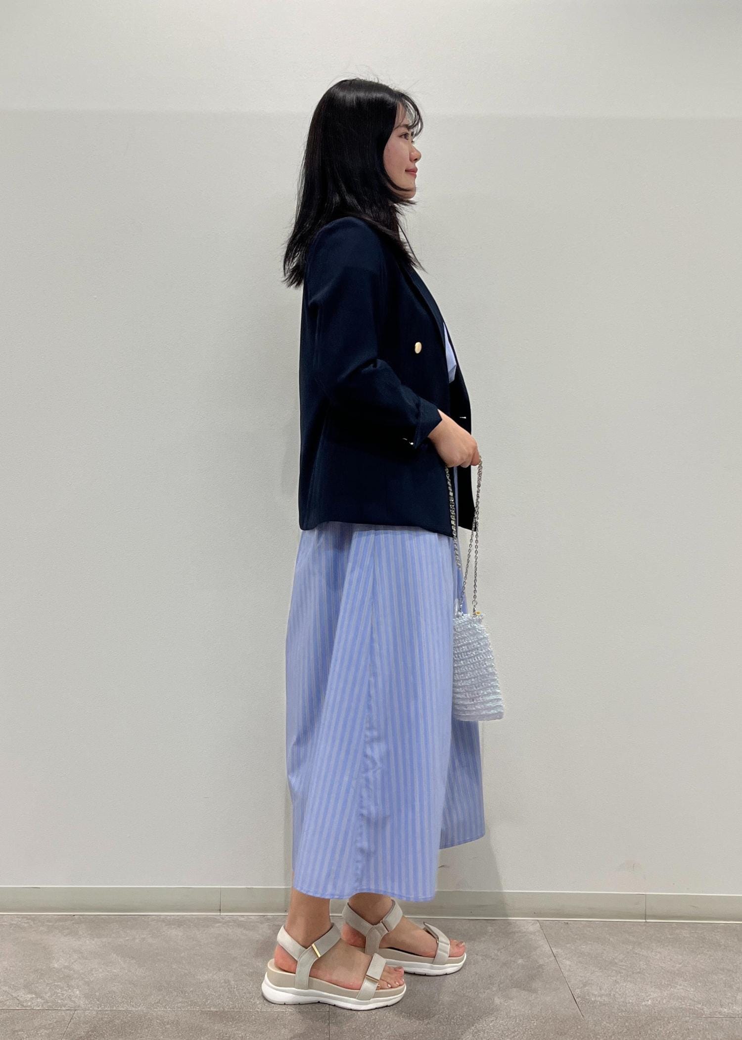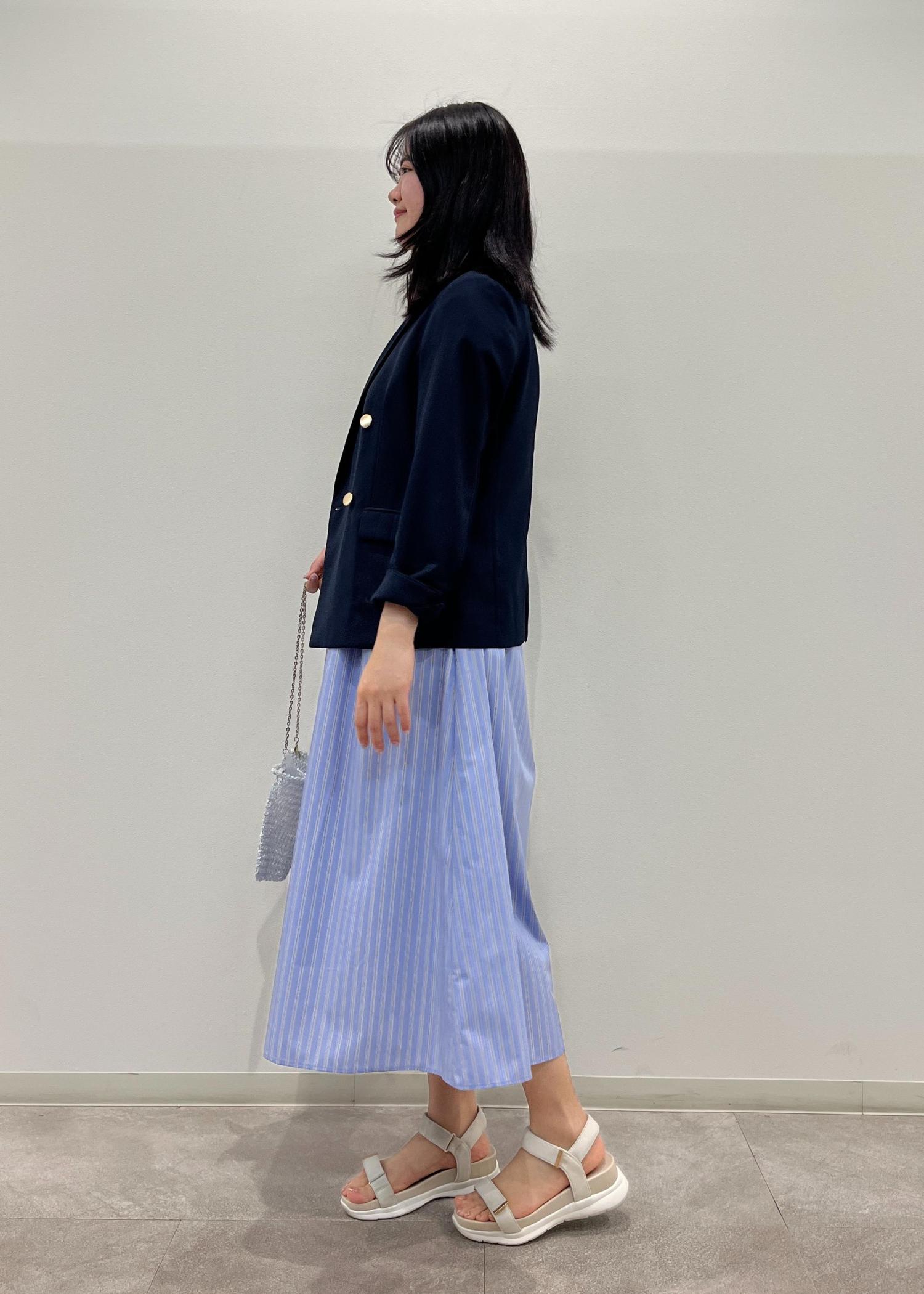 ブルーのシャツワンピースにネイビーのジャケットを合わせて夏らしいコーディネートにしました。