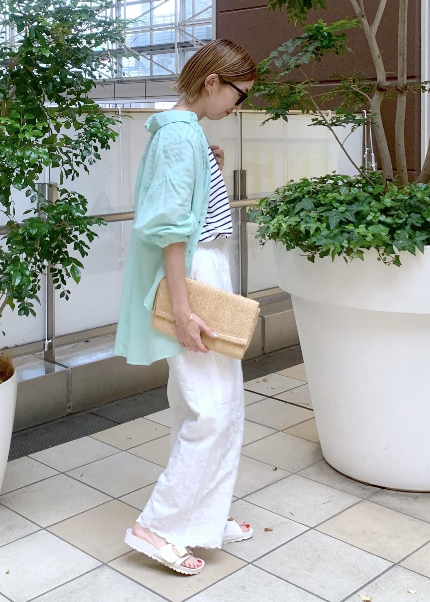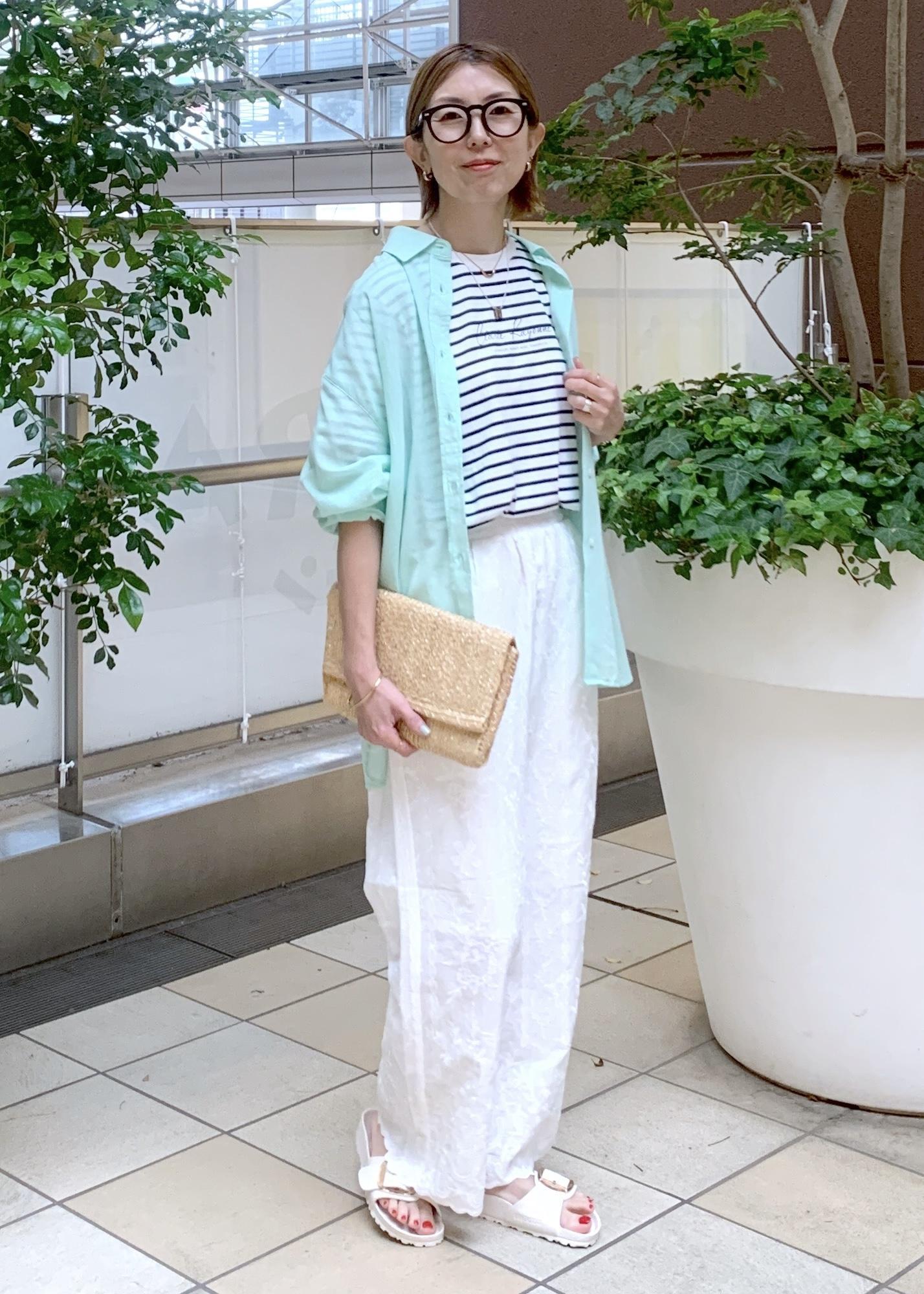 インナーにボーダーtシャツを合わせた初夏におすすめのスタイリング。