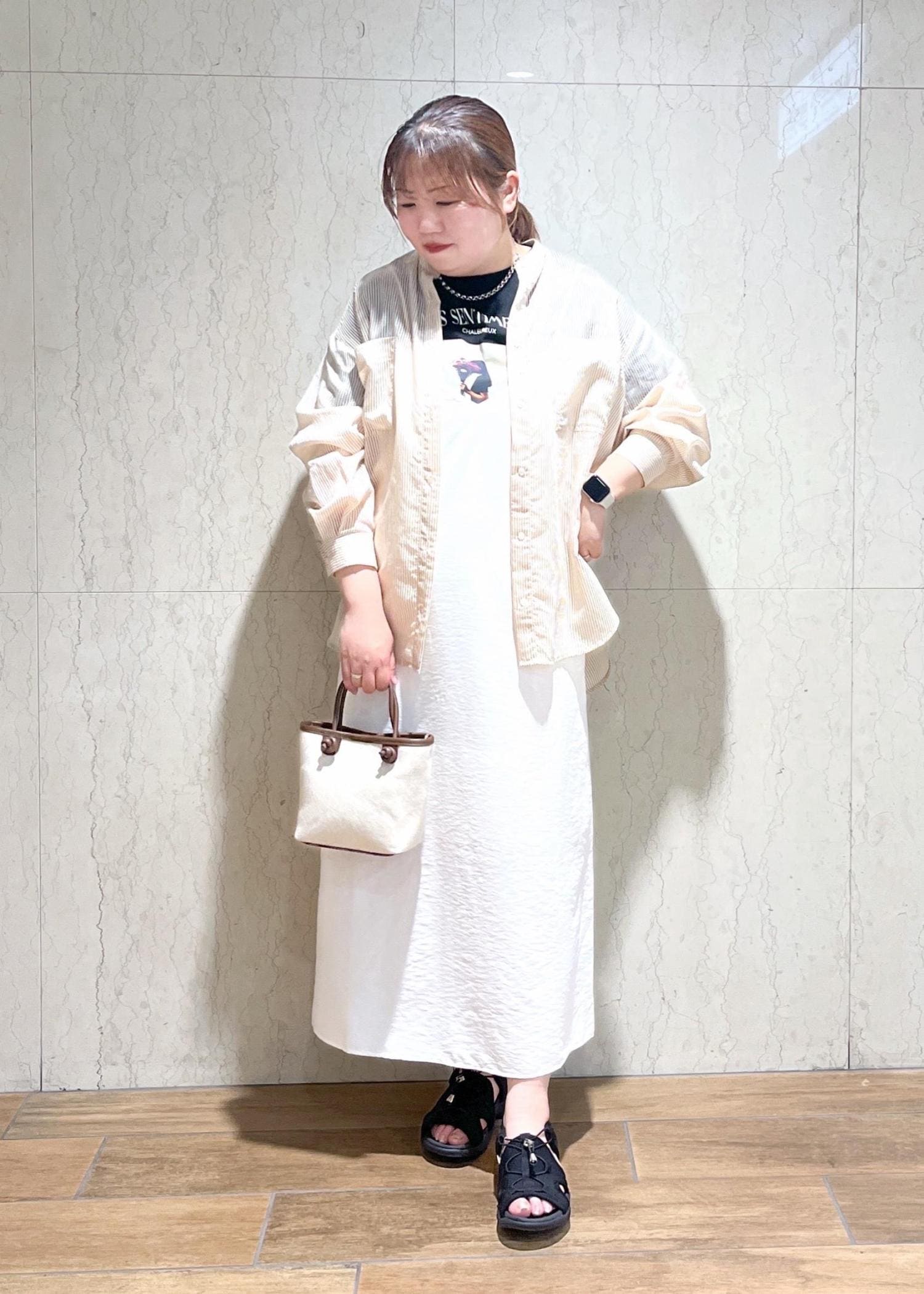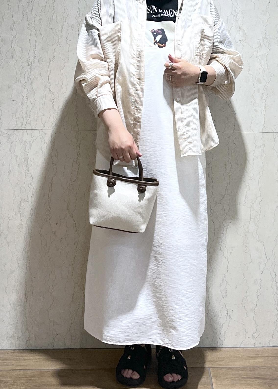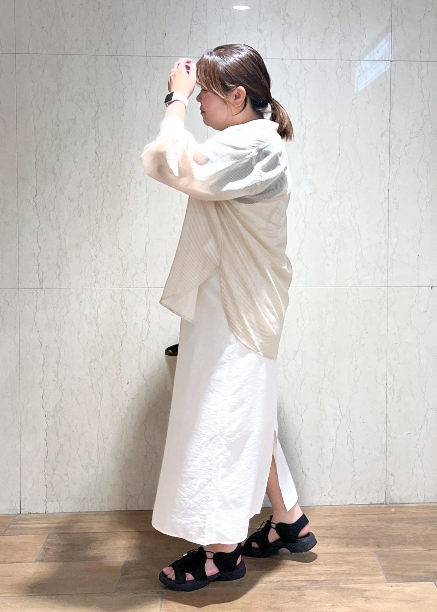 キャミワンピースとシアーシャツを合わせた大人カジュアルコーデです。