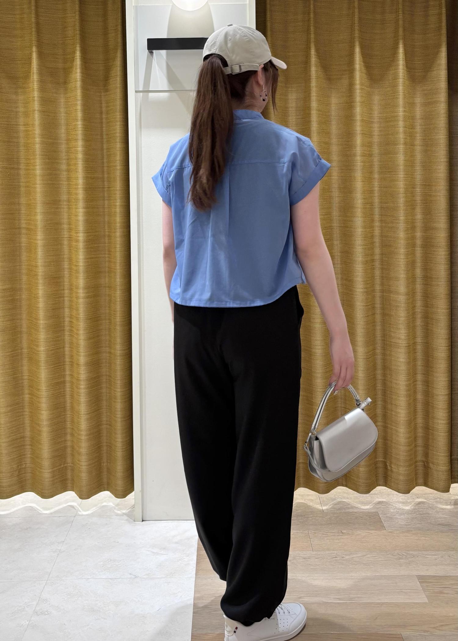 ショート丈のカジュアルシャツに、丈長のパンツで脚長効果を主張しています。