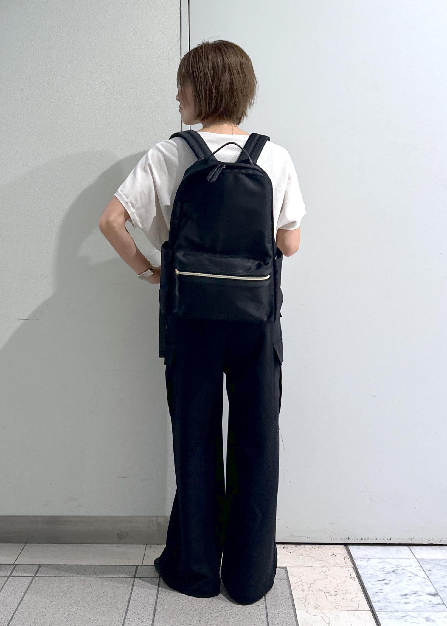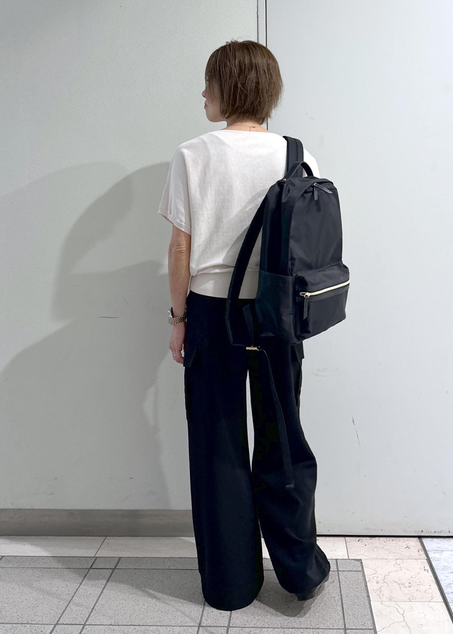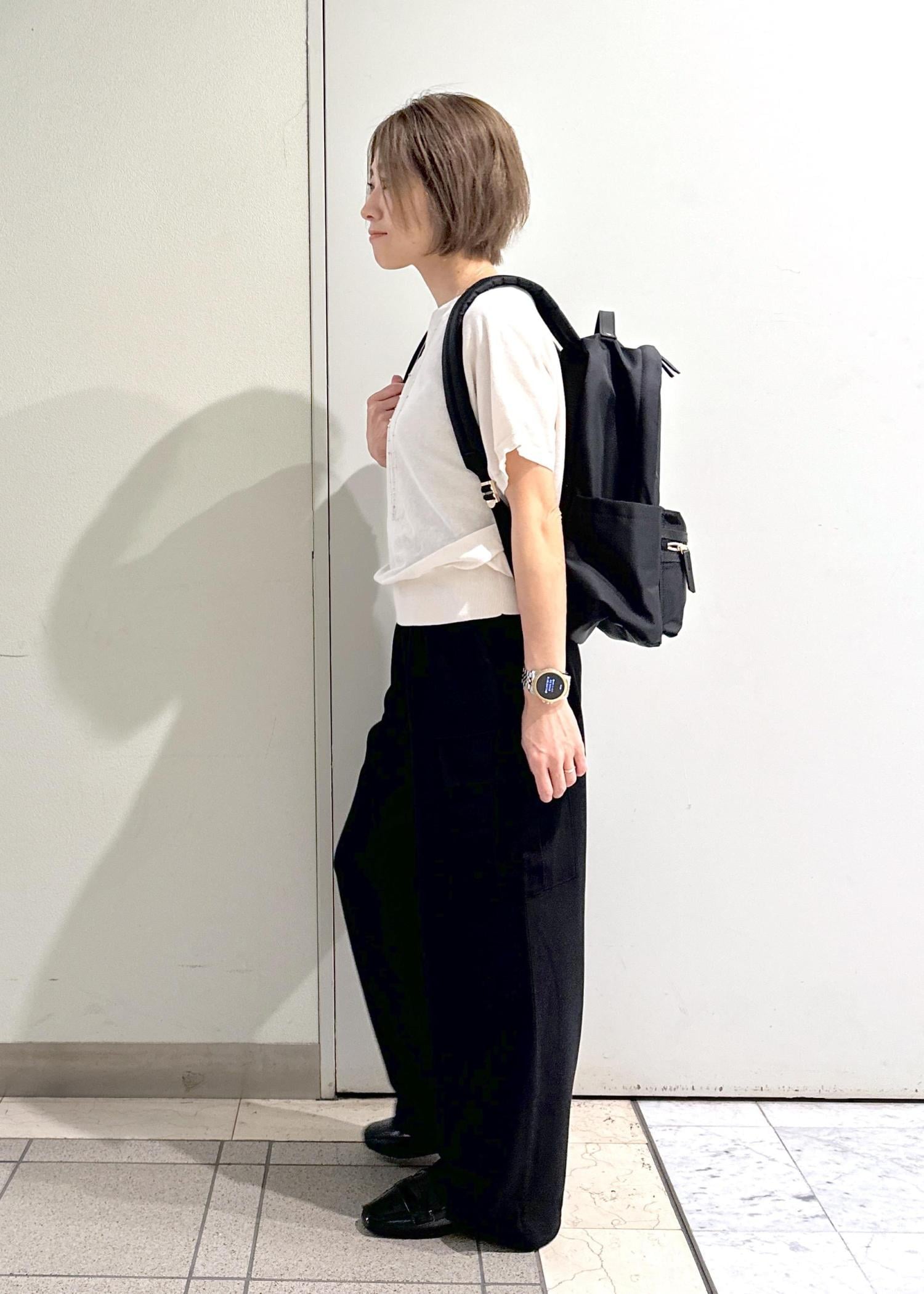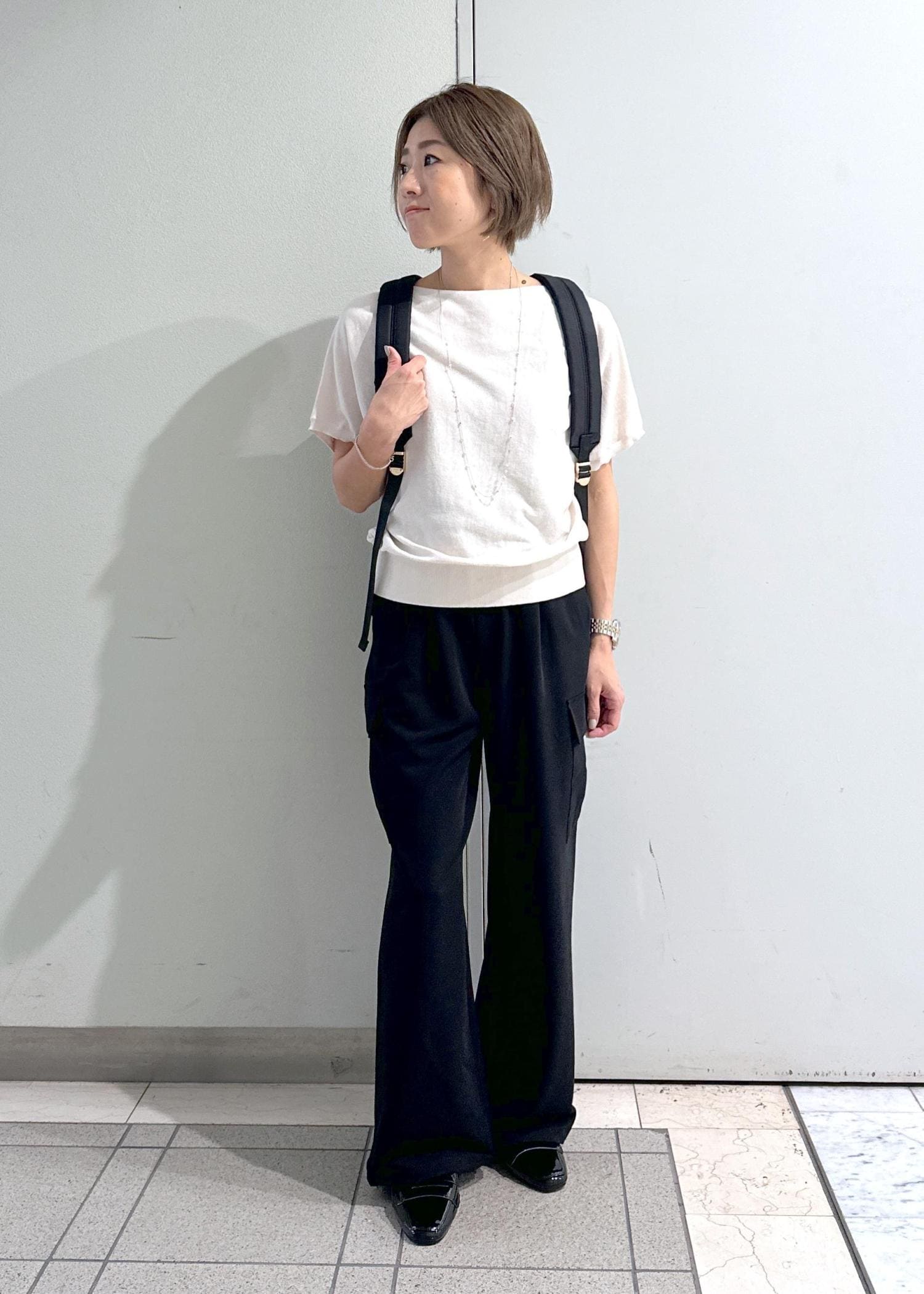 裾はお好みで絞れるので、コーディネートに合わせて変えると印象も変わります。 -