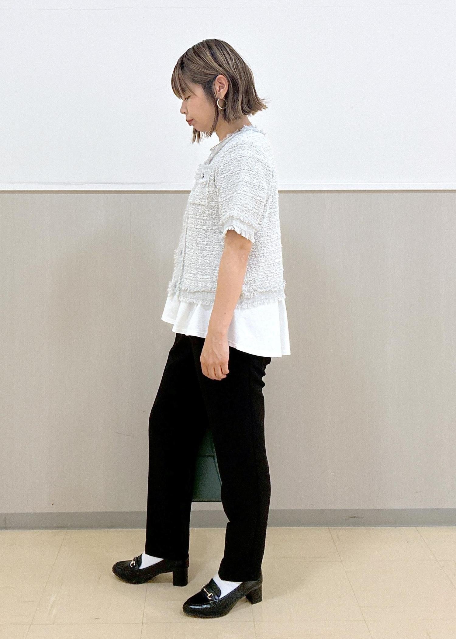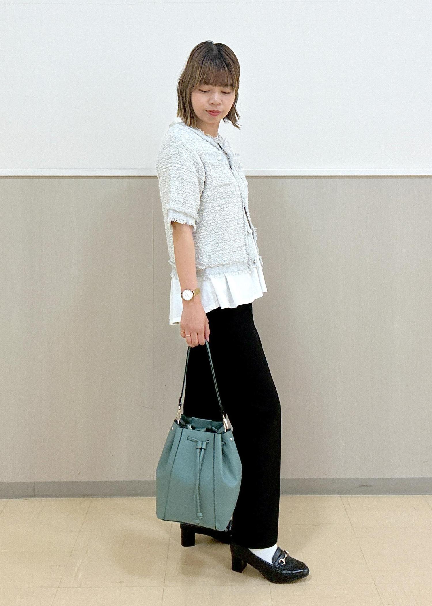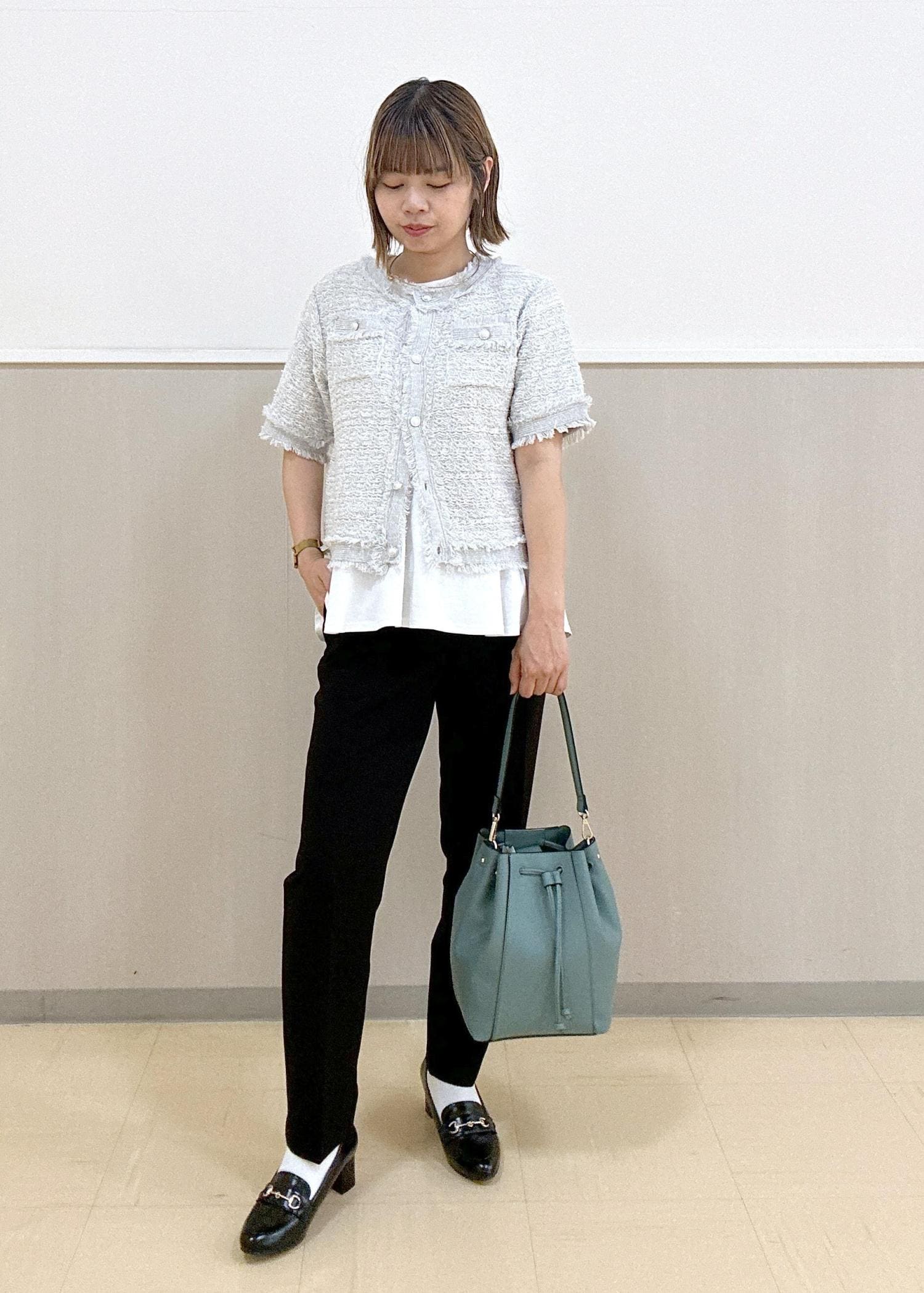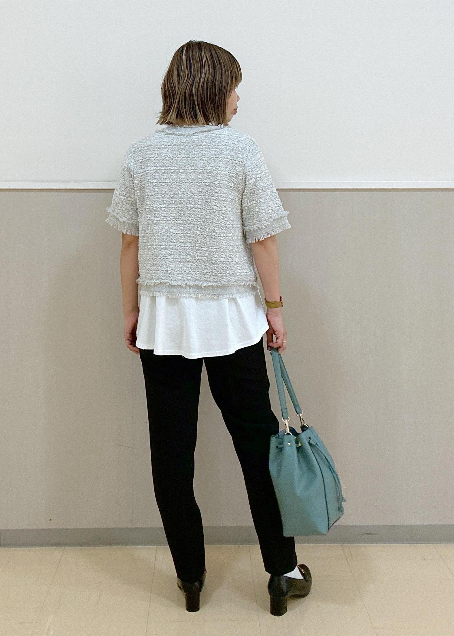 爽やかなグレーのツイードライクカーディガンをメインに、