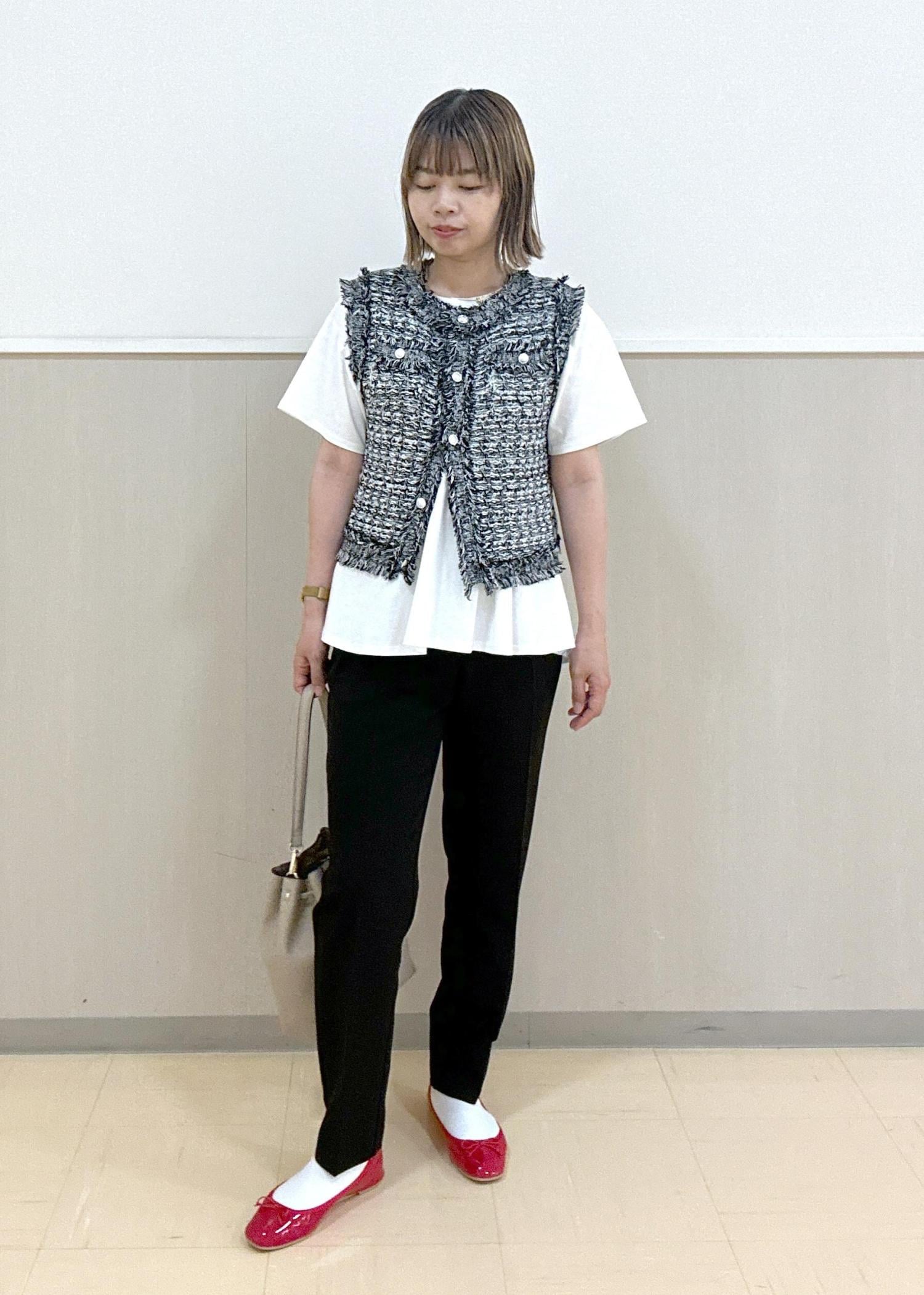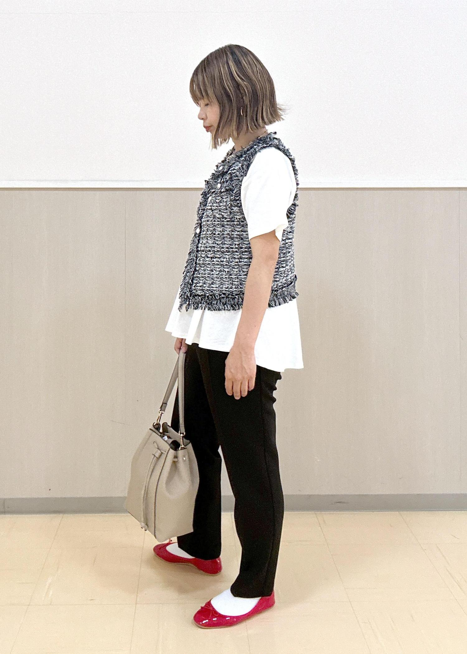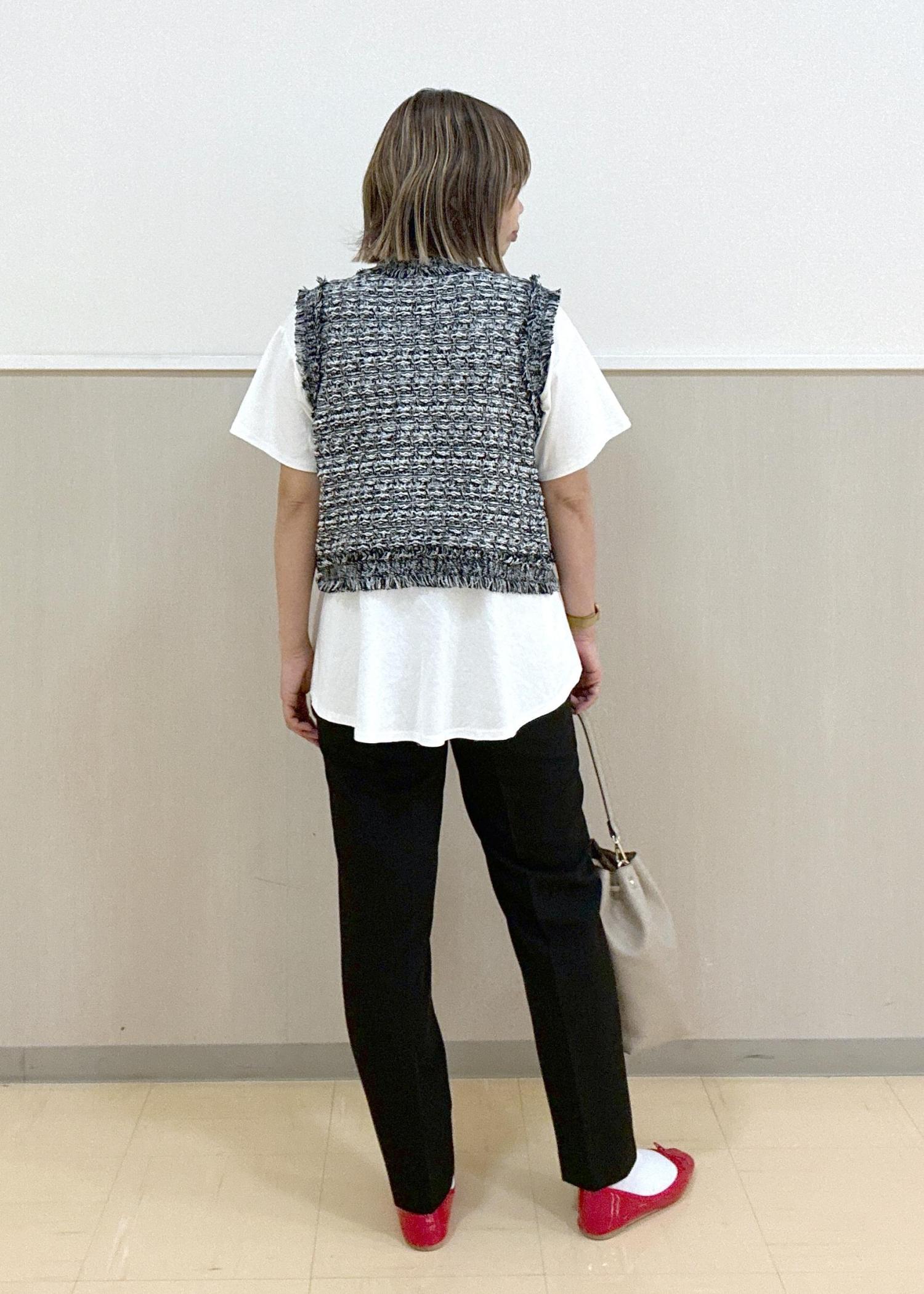 ブラック系のツイードライクジレとブラックのテーパードパンツでかっこよくスッキリとしたスタイリング。