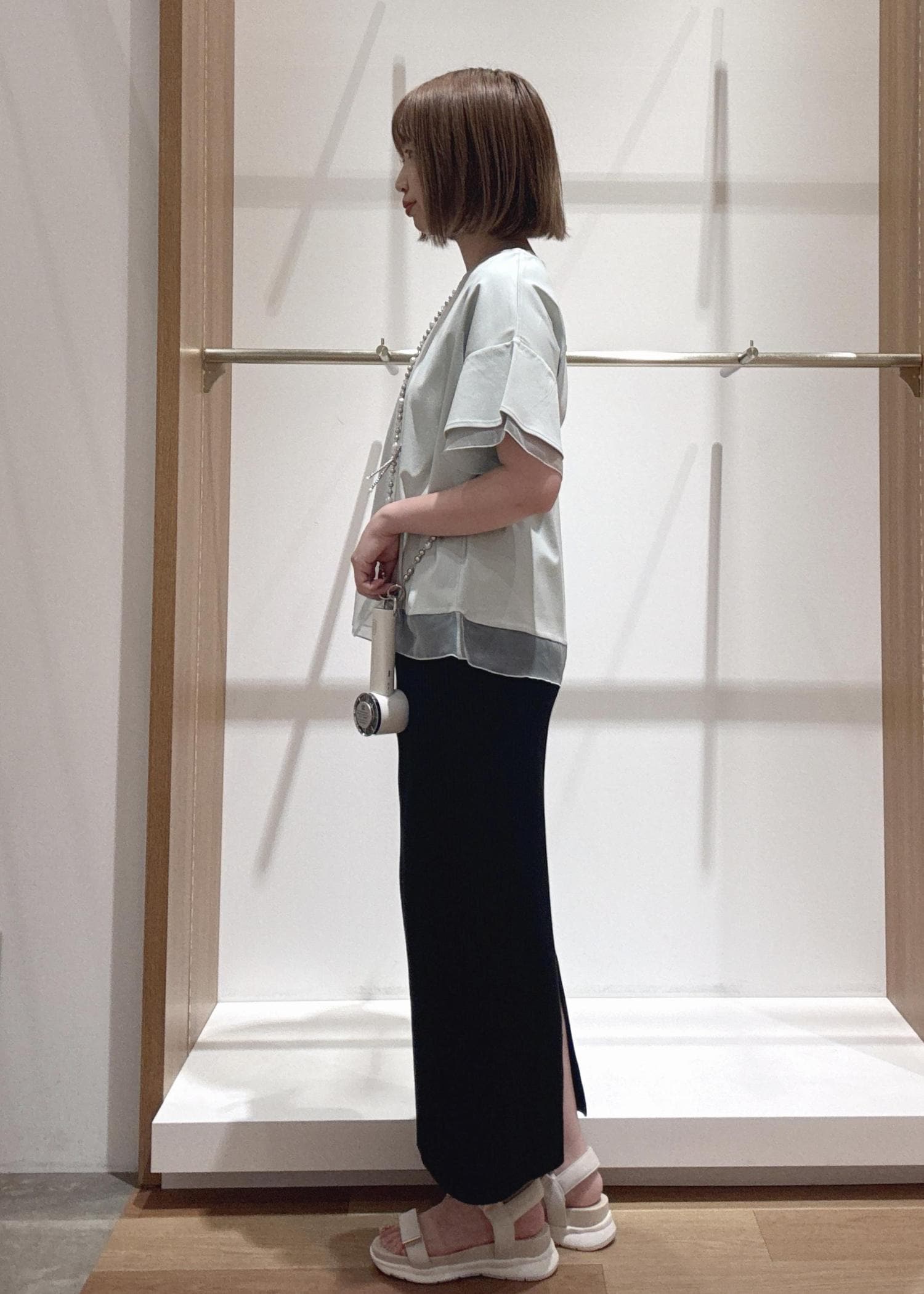 暑い時期に大活躍間違いなしのひんやりファンとストラップを組み合わせて夏のお出かけコーデです。