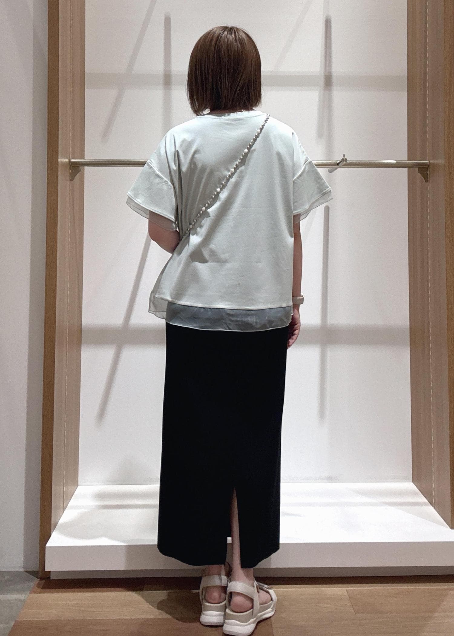 淡いグリーンのトップスに黒のスカートで締めてバランスをとりました◎