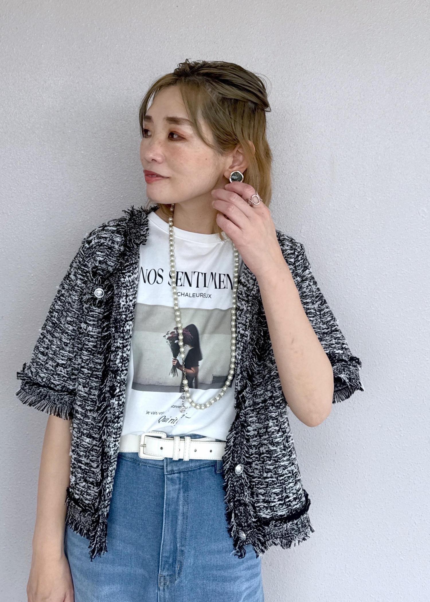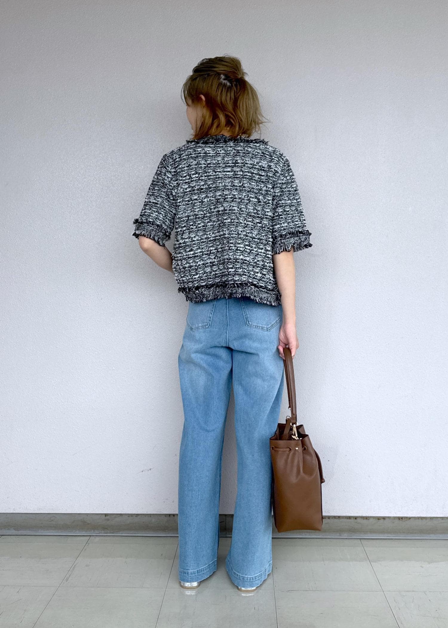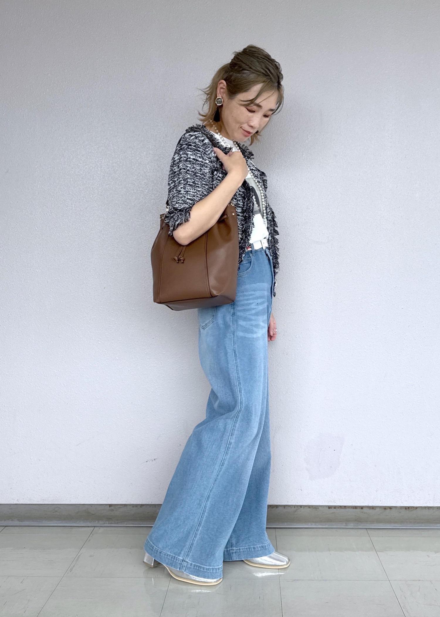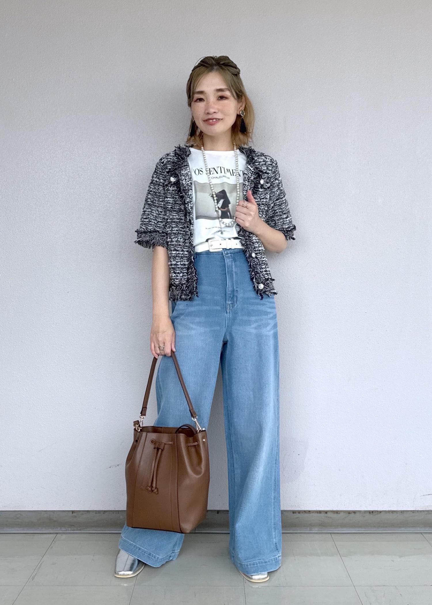華やかなサマーツイードジャケットにワイドデニムを合わせた大人カジュアルなスタイルです。