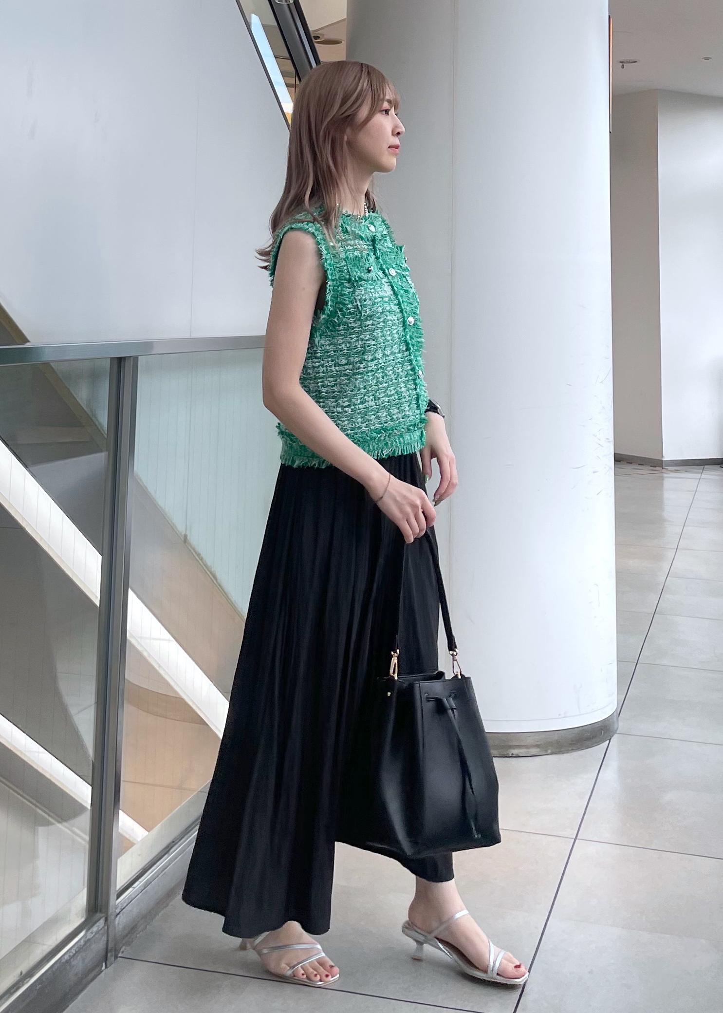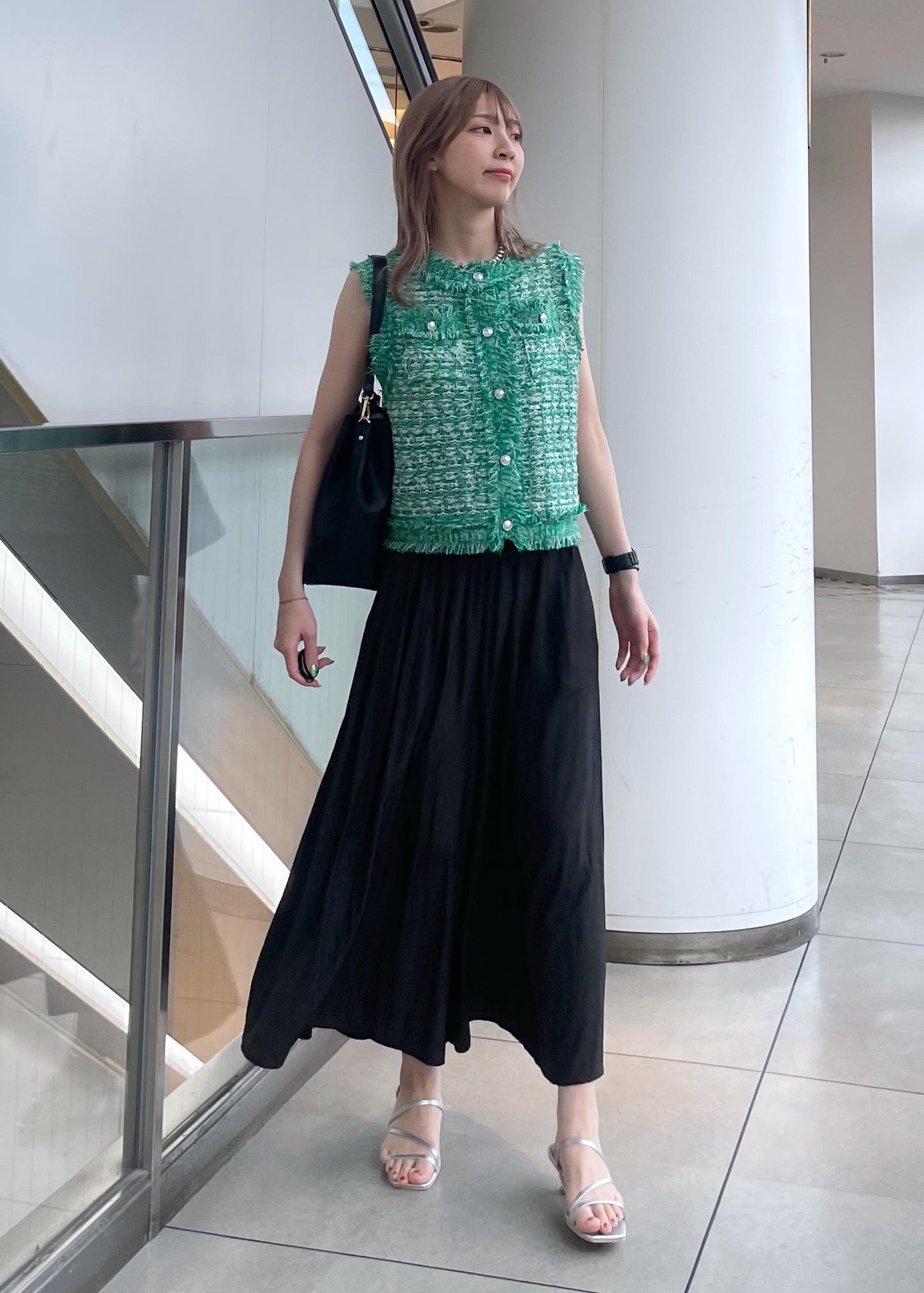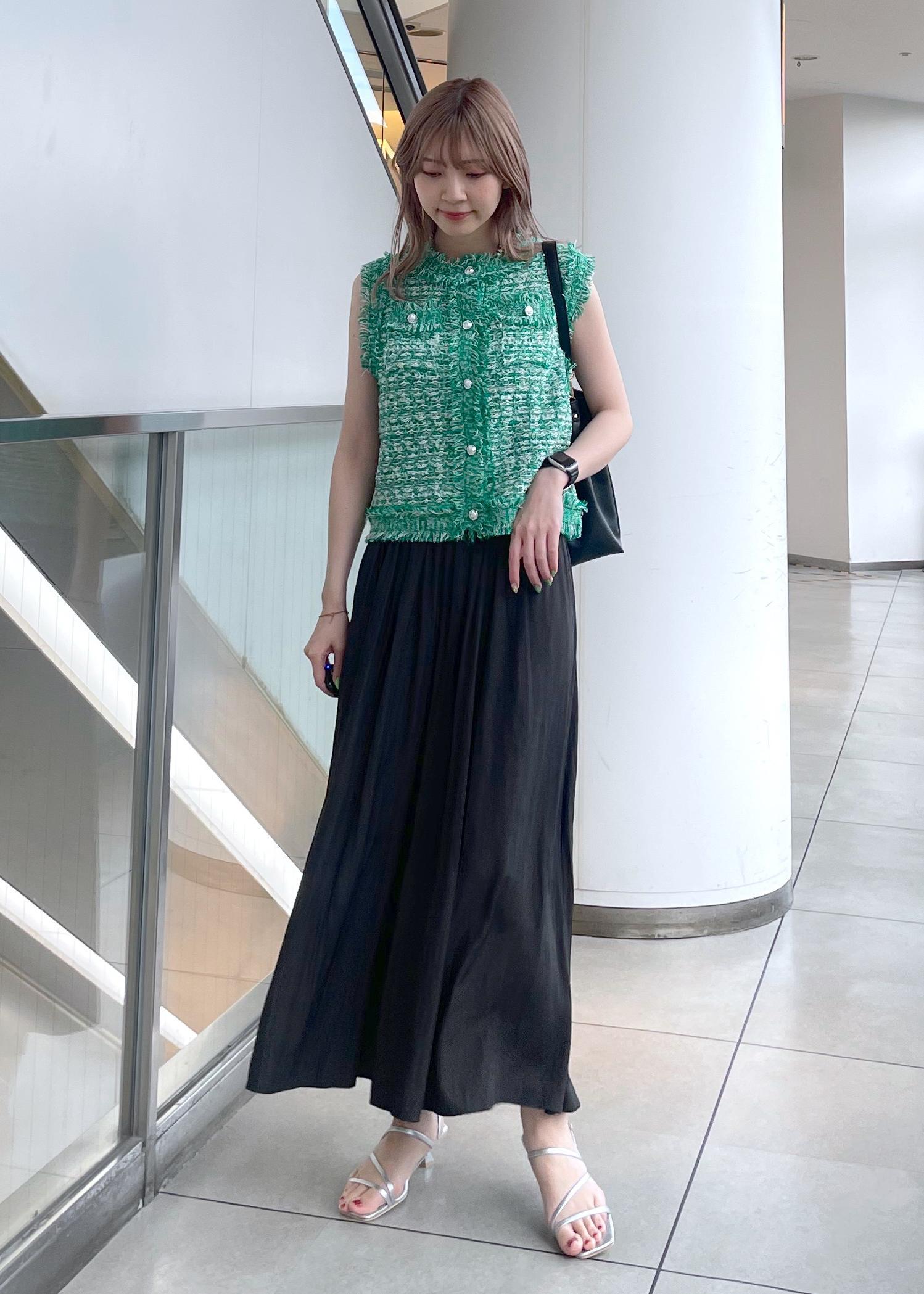綺麗みえするツイードジレとスカーチョをあわせて、お出かけにもピッタリなスタイルにしました。