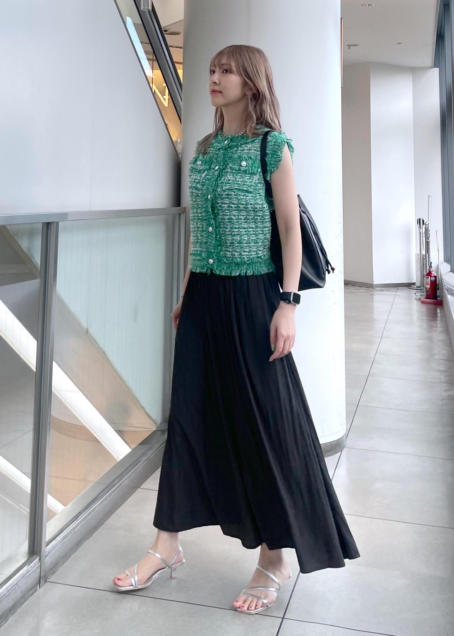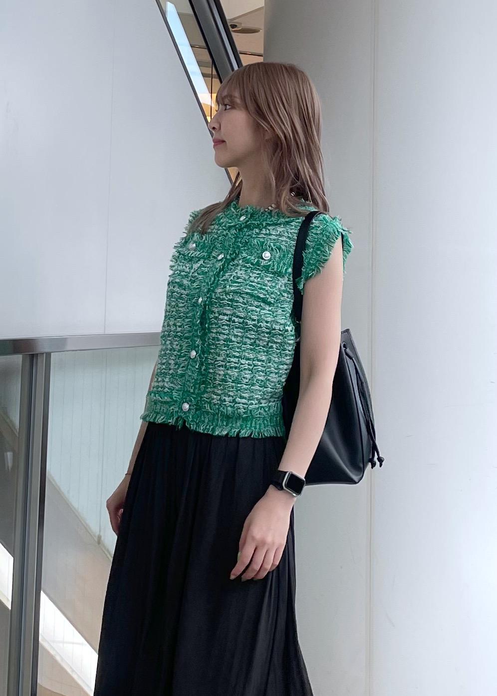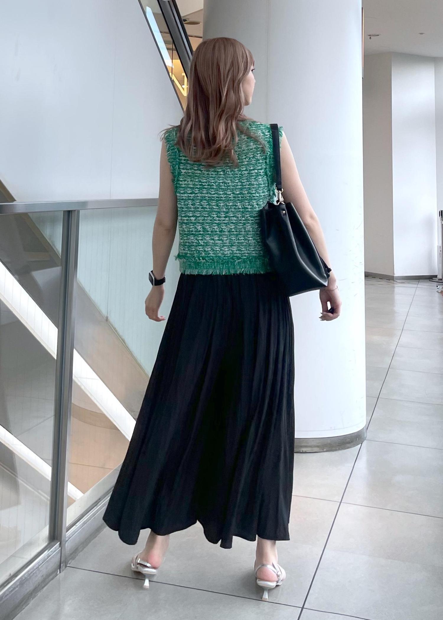 綺麗みえするツイードジレとスカーチョをあわせて、お出かけにもピッタリなスタイルにしました。