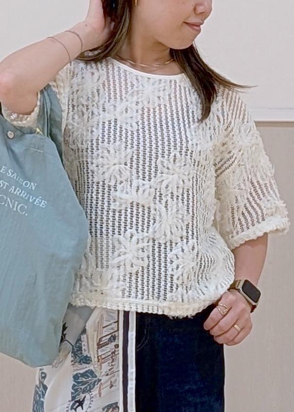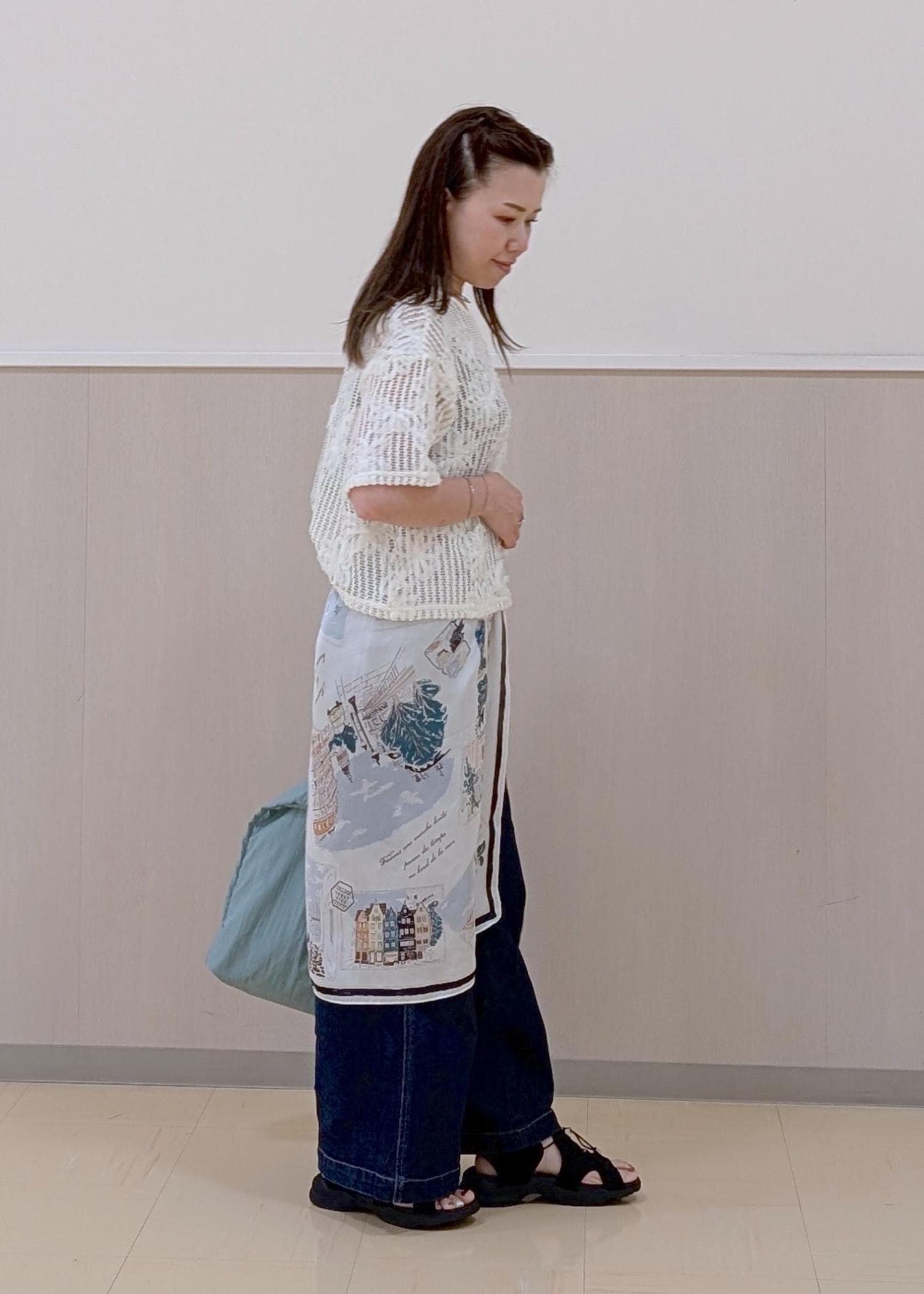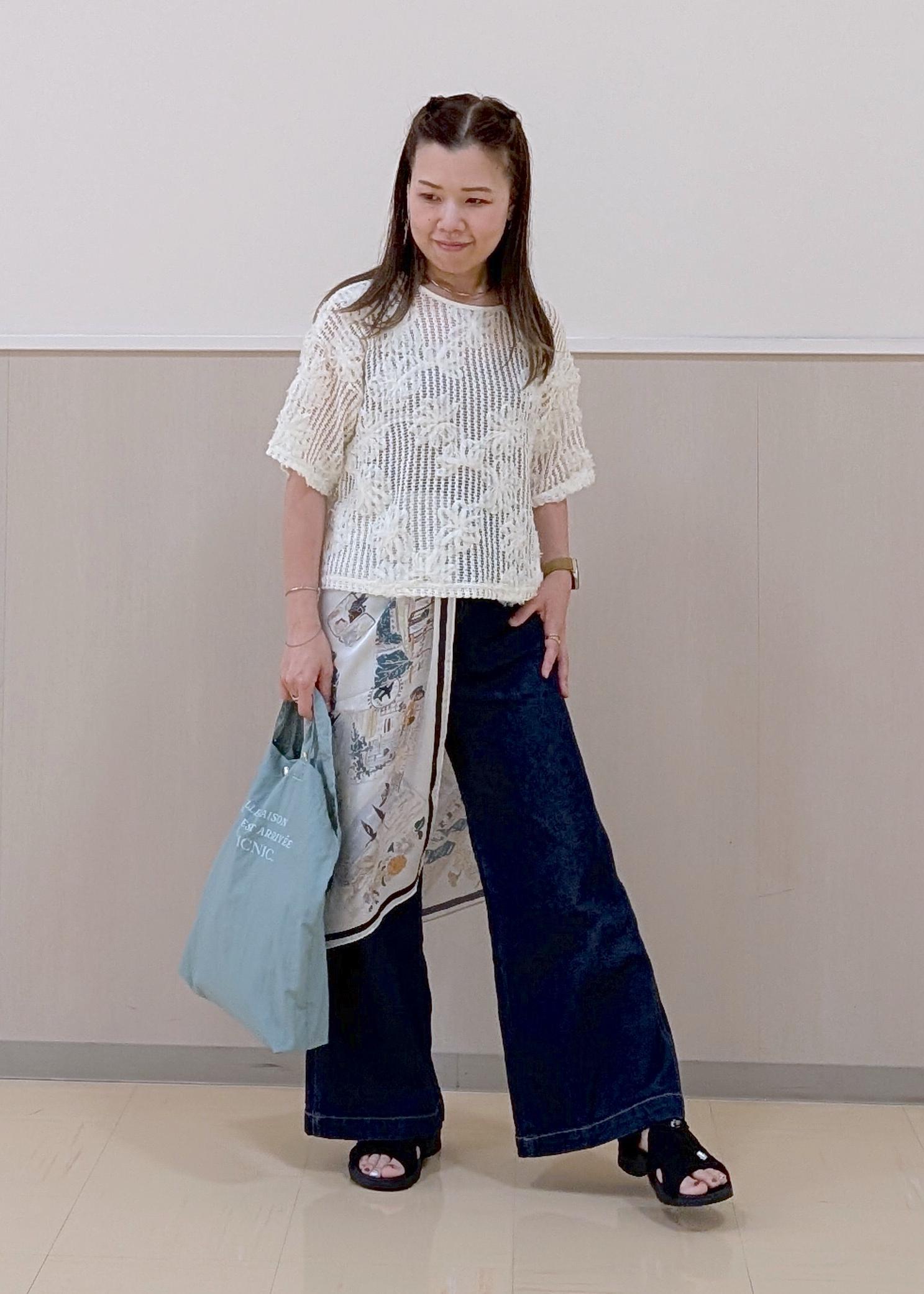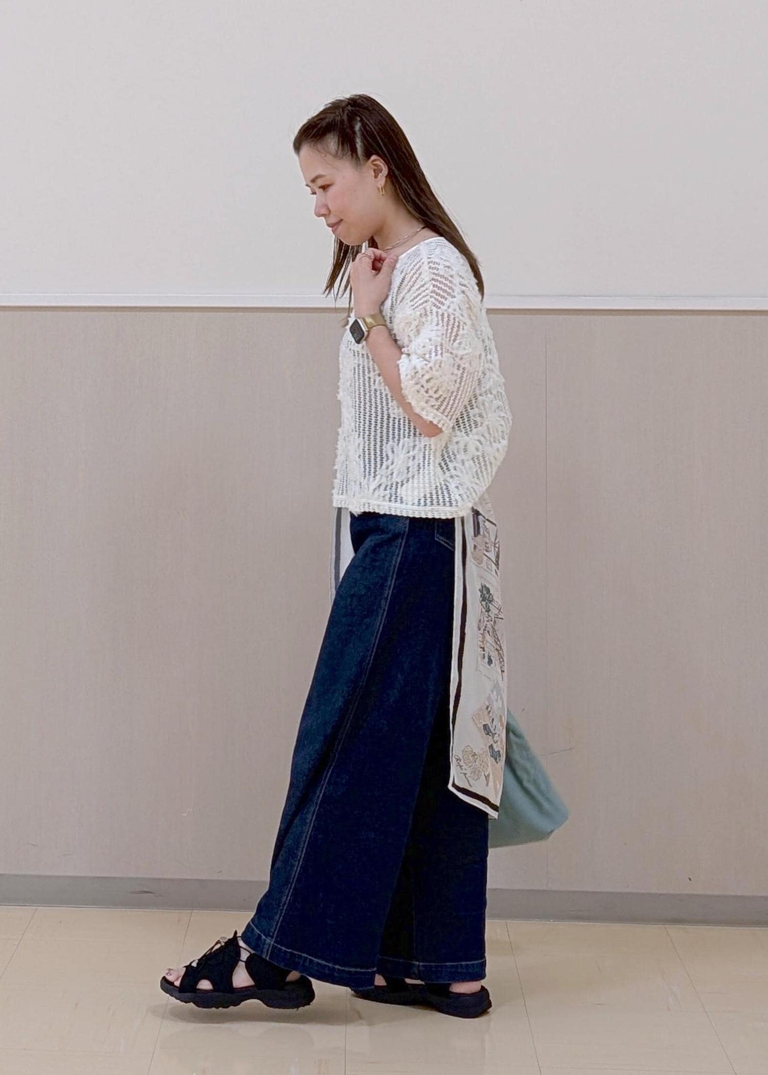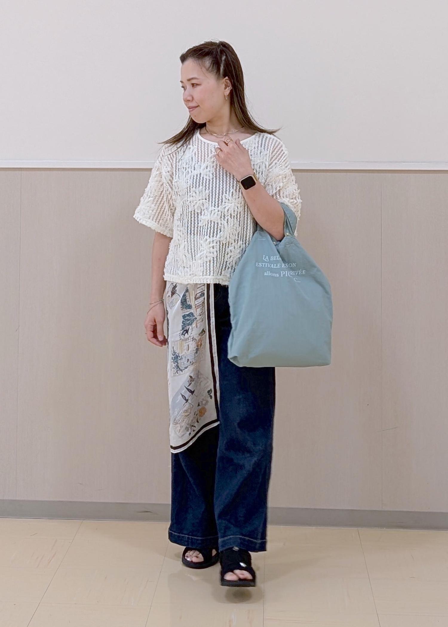 刺繍の透け感あるトップスとデニムでシンプルなスタイリングに、腰巻きのスカーフを合わせることでワンランク上のお洒落コーディネートの完成です♪
