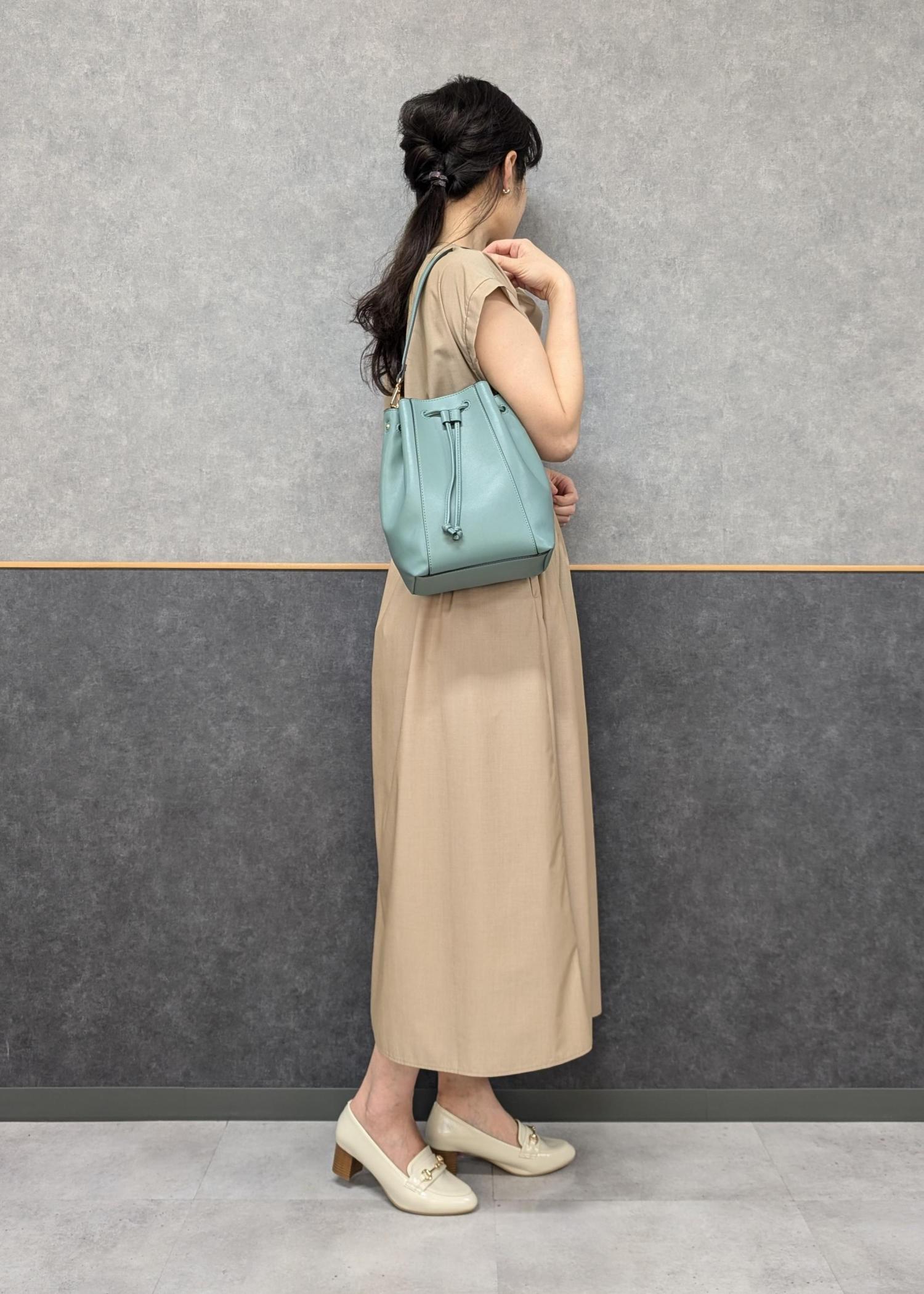 シンプルで品と可愛らしさもあるワンピースが主役のコーディネート。夏らしい差し色として、緑のバッグを合わせました。