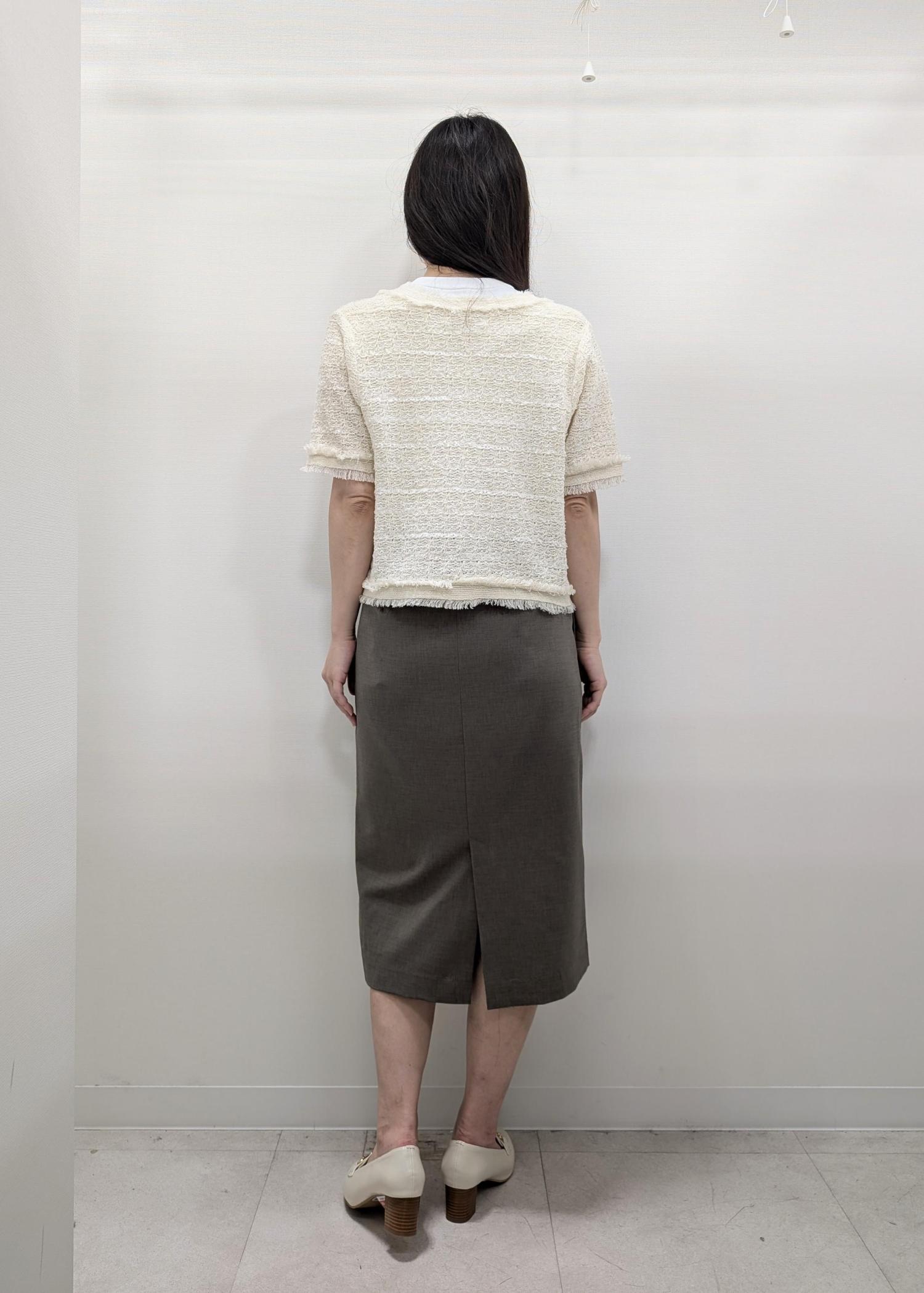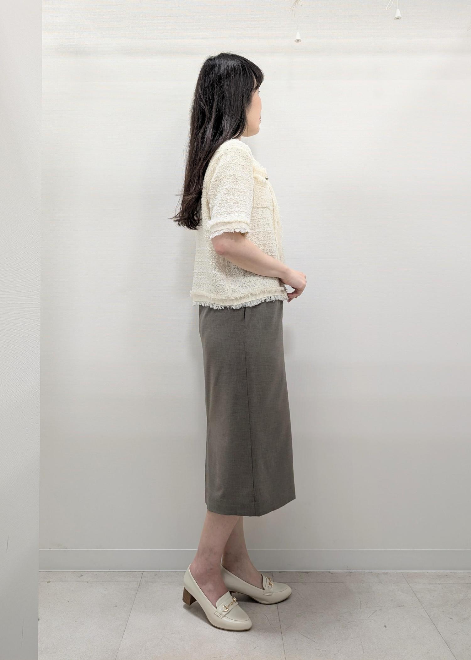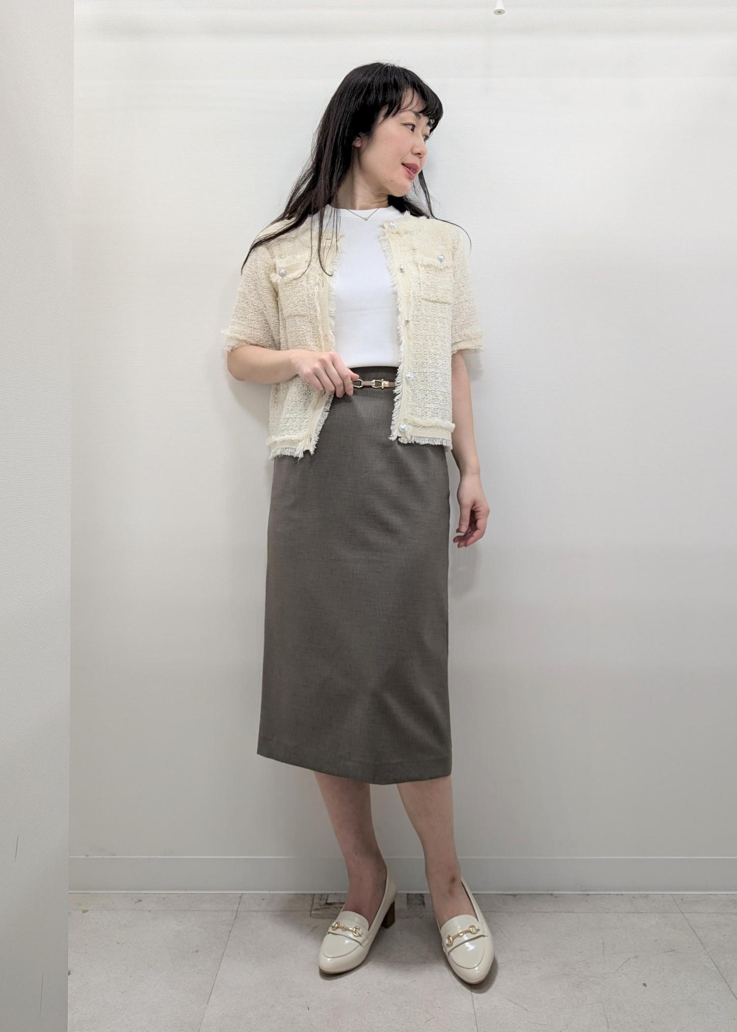ツイードカーディガンにタイトスカートで女性らしく品あるオフィスコーデ。