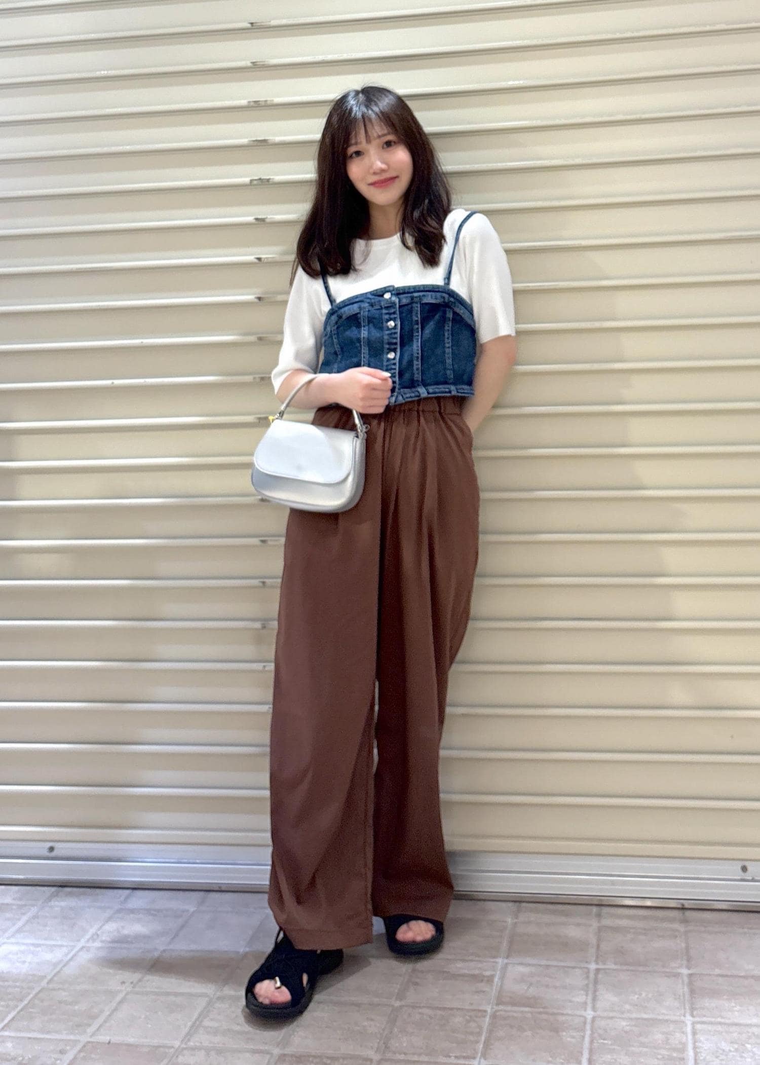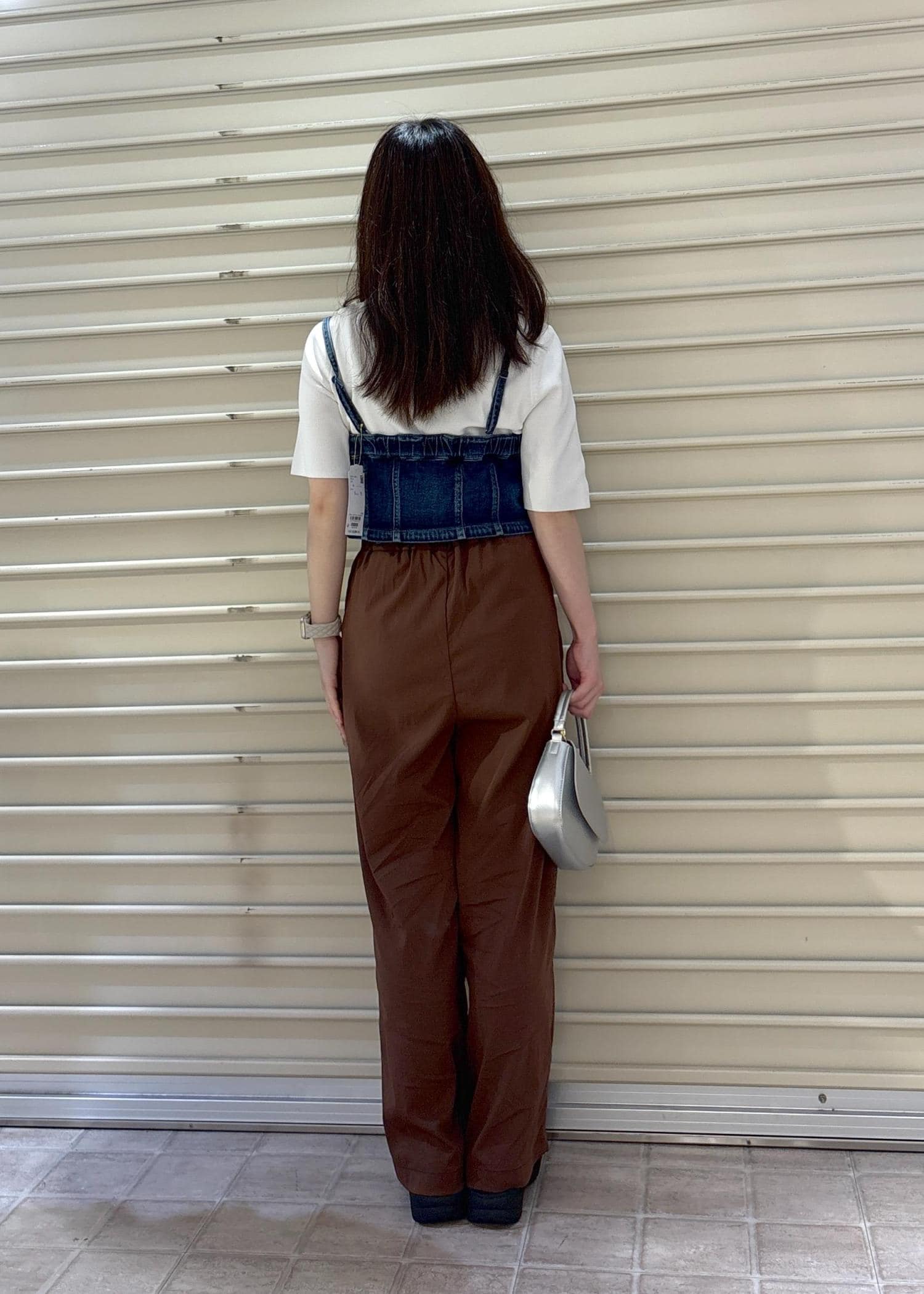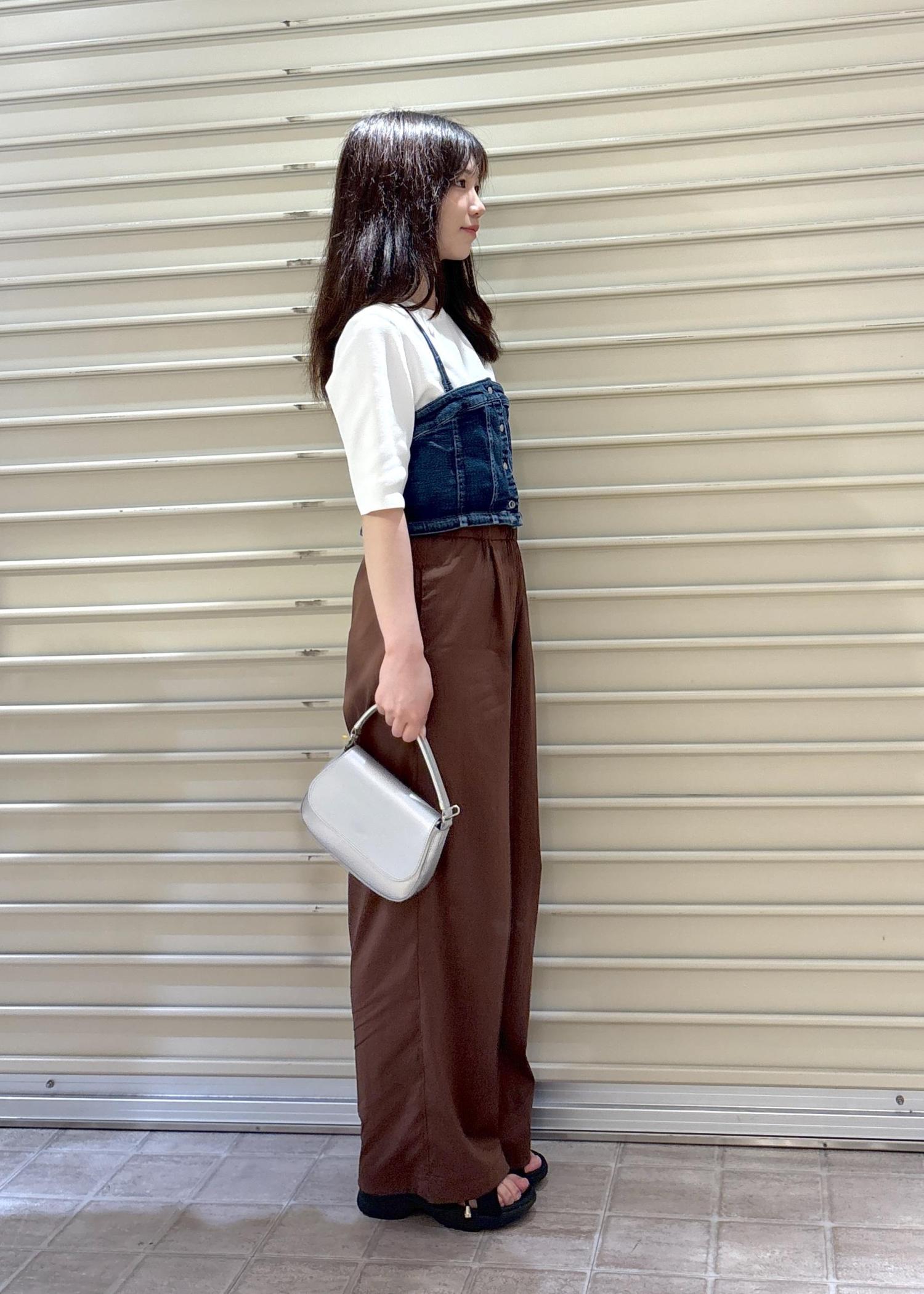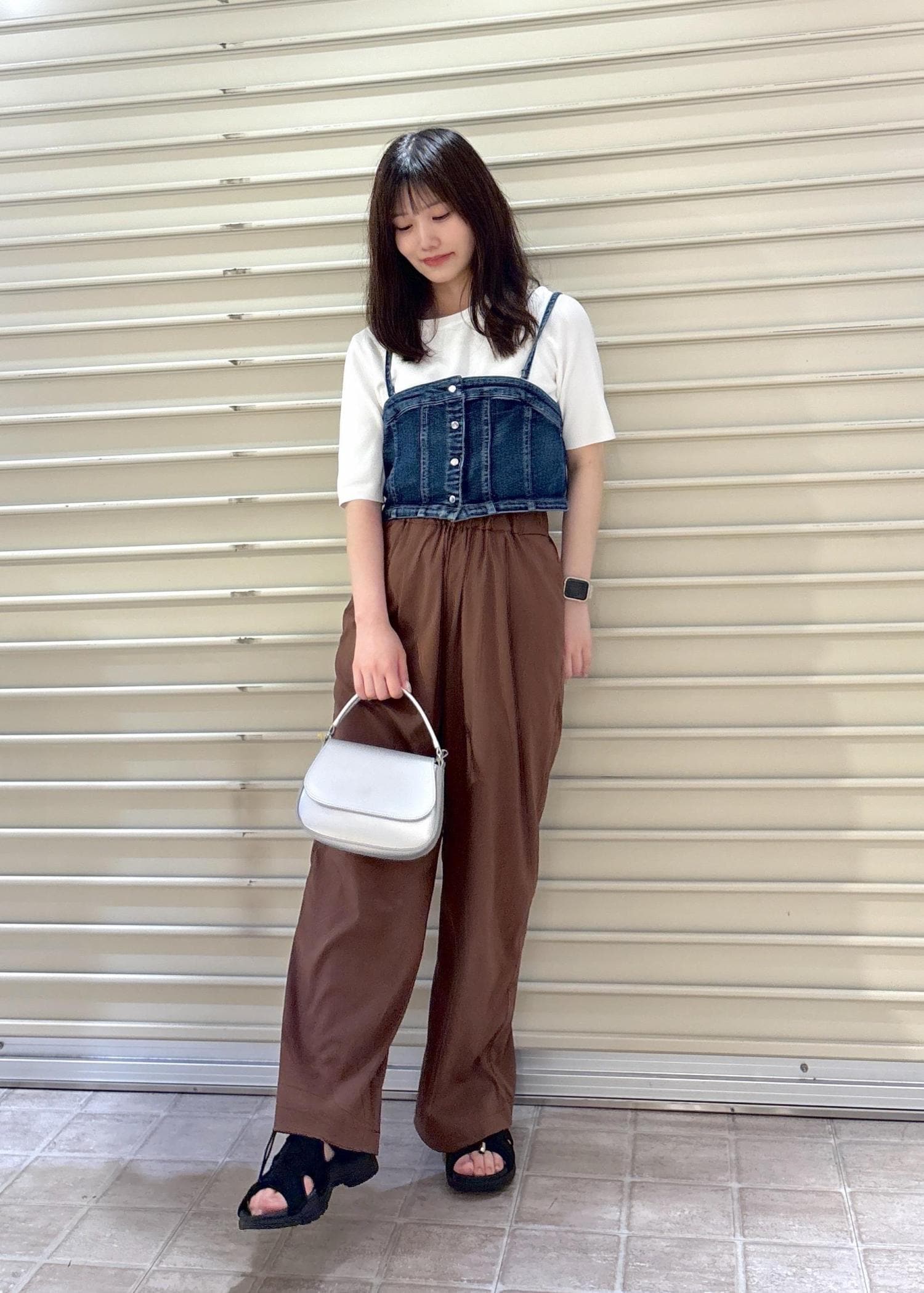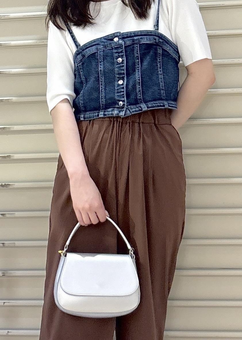 こちらのコーデは、デニムのビスチェがカジュアルスポーティー感を演出できてます!シンプルだけど遊び心もあるコーデになっていて、ブラウンのラフなパンツにシルバーのバッグを合わせることによって程よいバランスが保たれます!デートや友達とのお出かけにも最適です!スニーカーサンダルと合わせてスポーティー感も出すことができます!