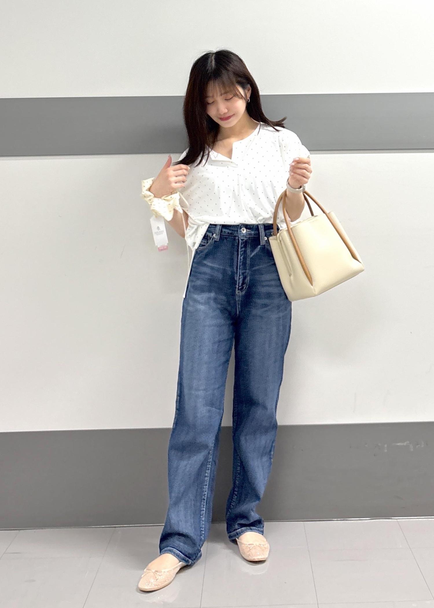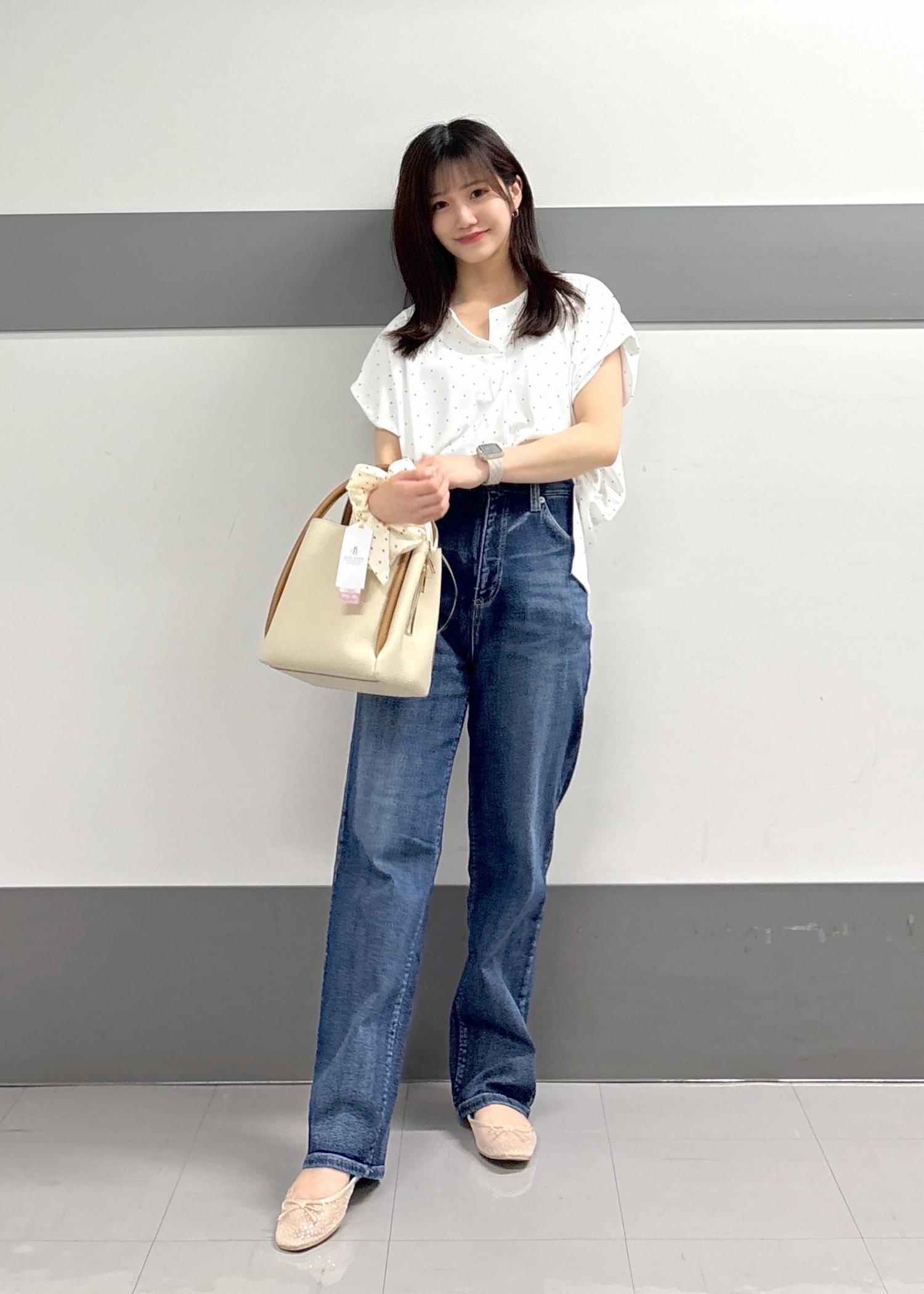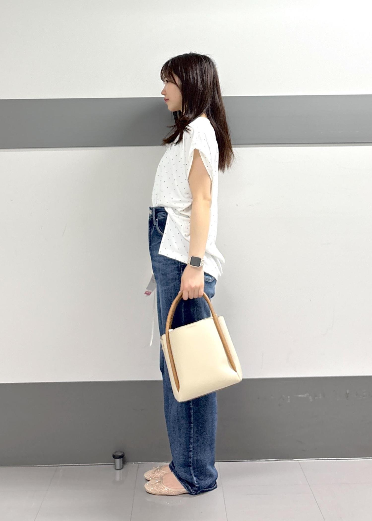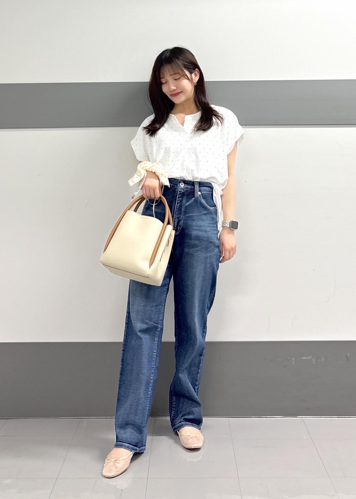 サラッとした素材でヘルシーに着ることができます!動きやすいデニムパンツと合わせて色の組み合わせも涼し気な感じに着こなすことができます!また、ラメのバレエシューズと合わせて足元も甘く演出できます!