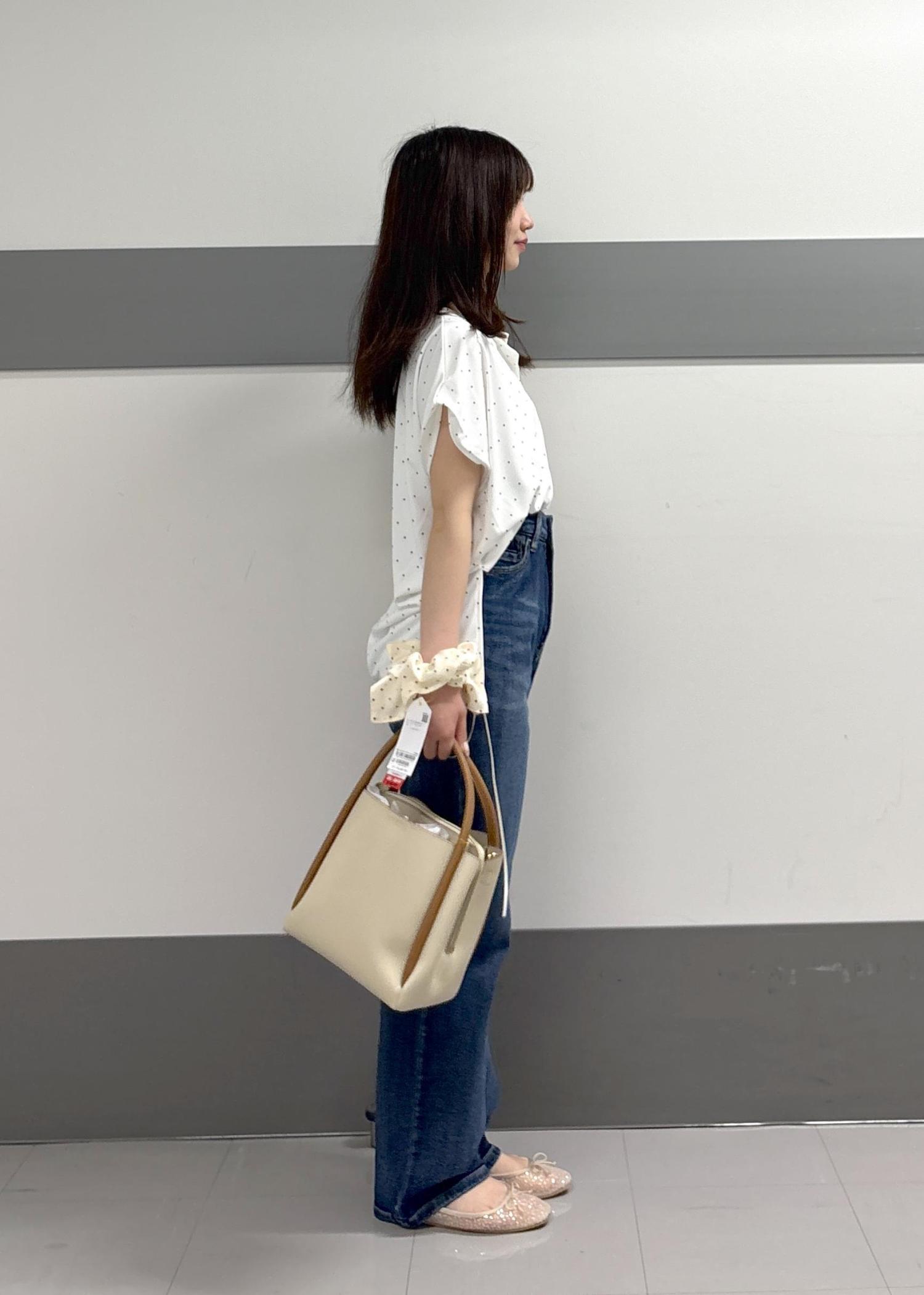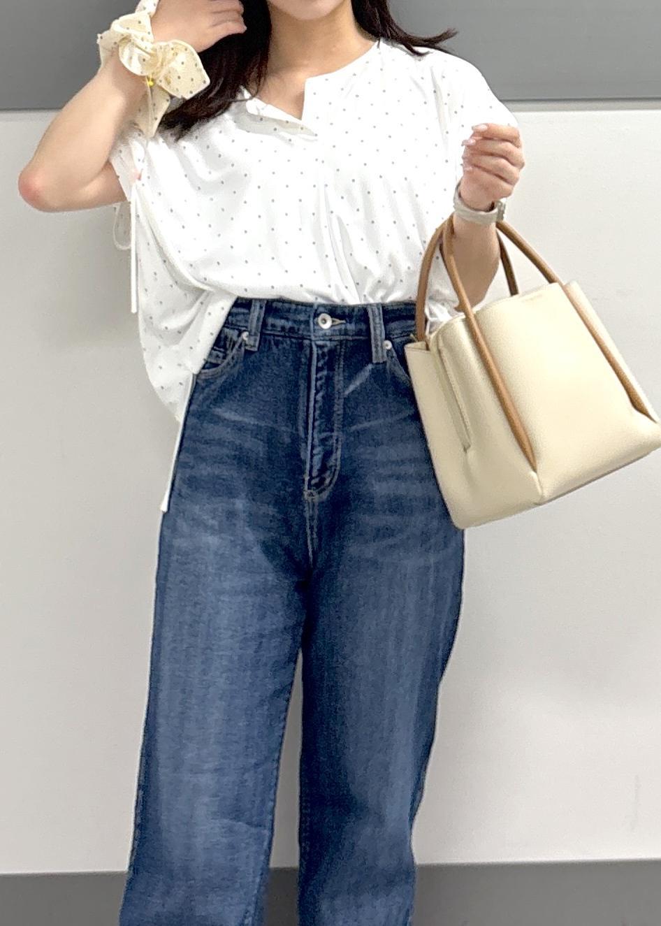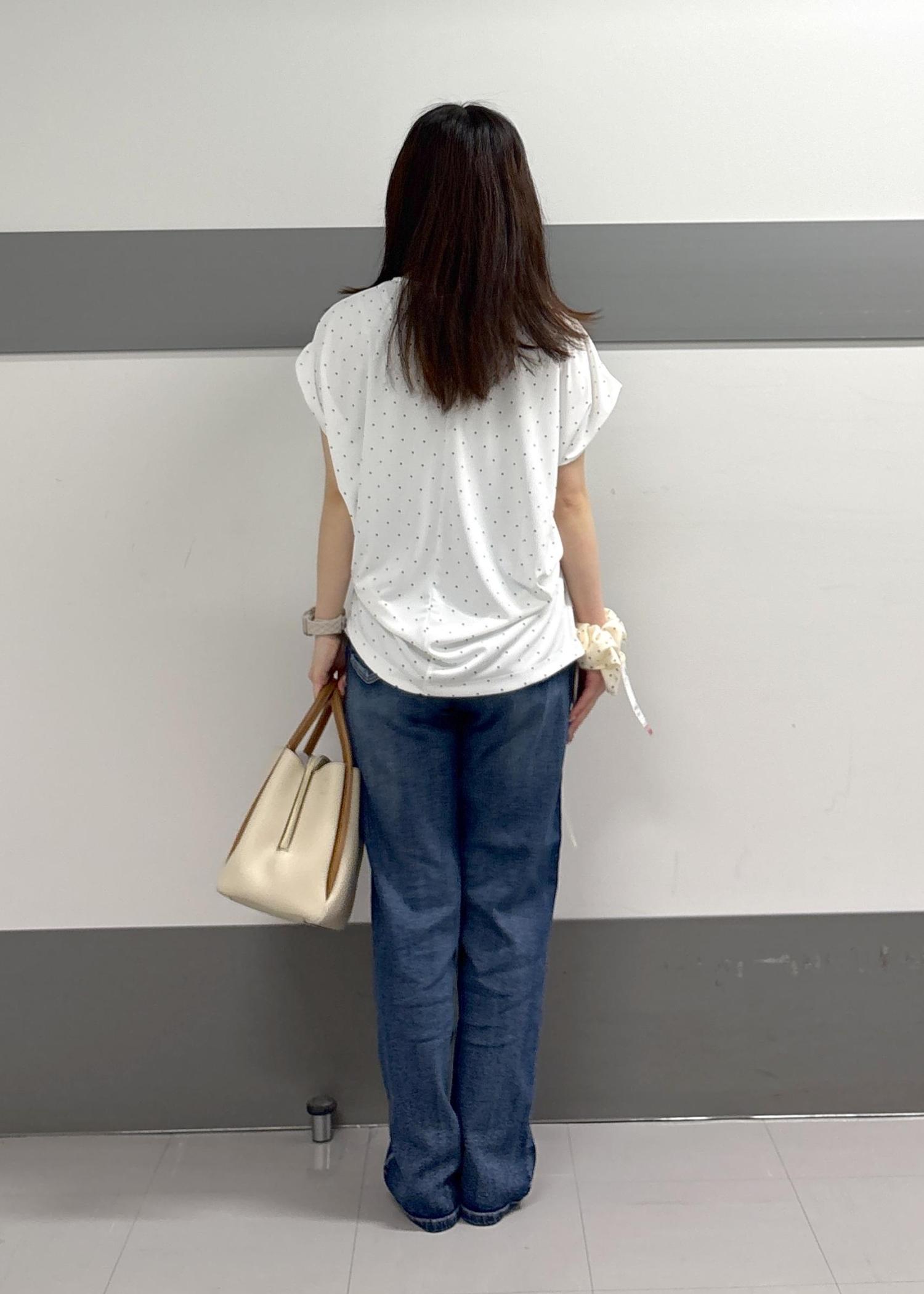 こちらのコーデのポイントは、ドット柄のトップスです!