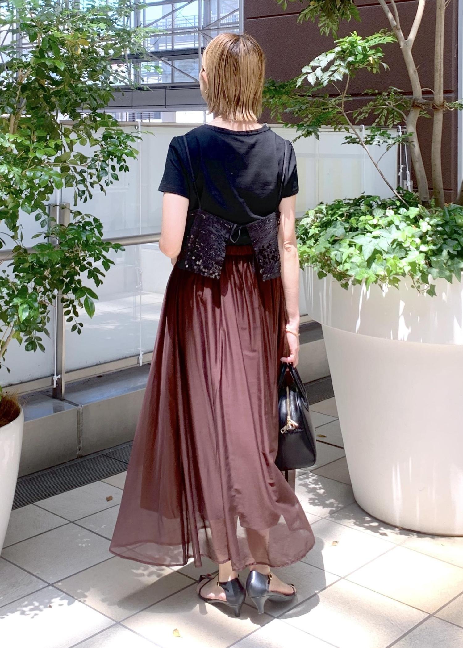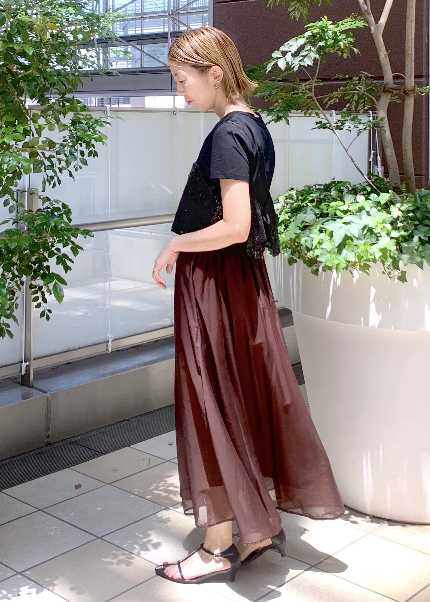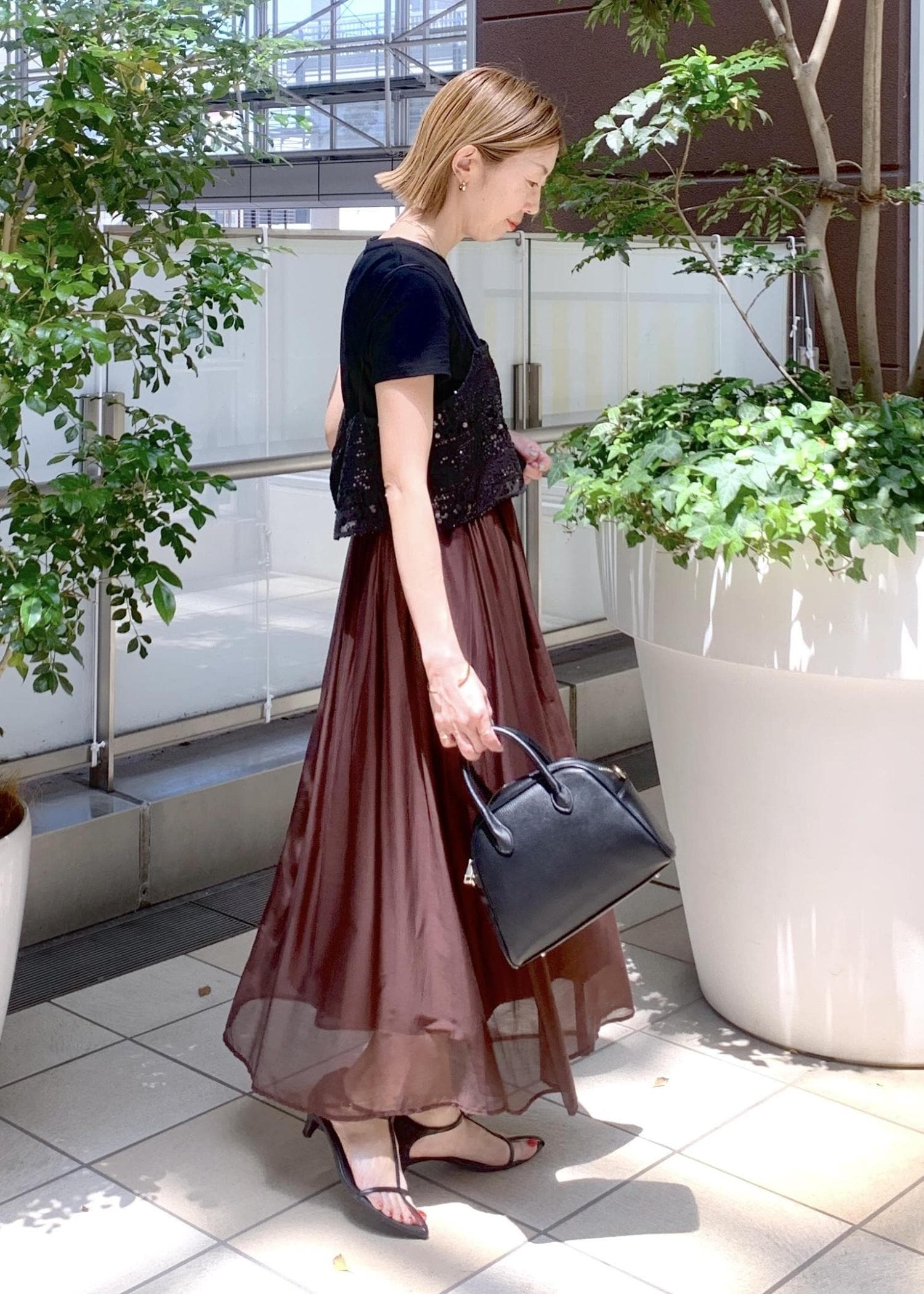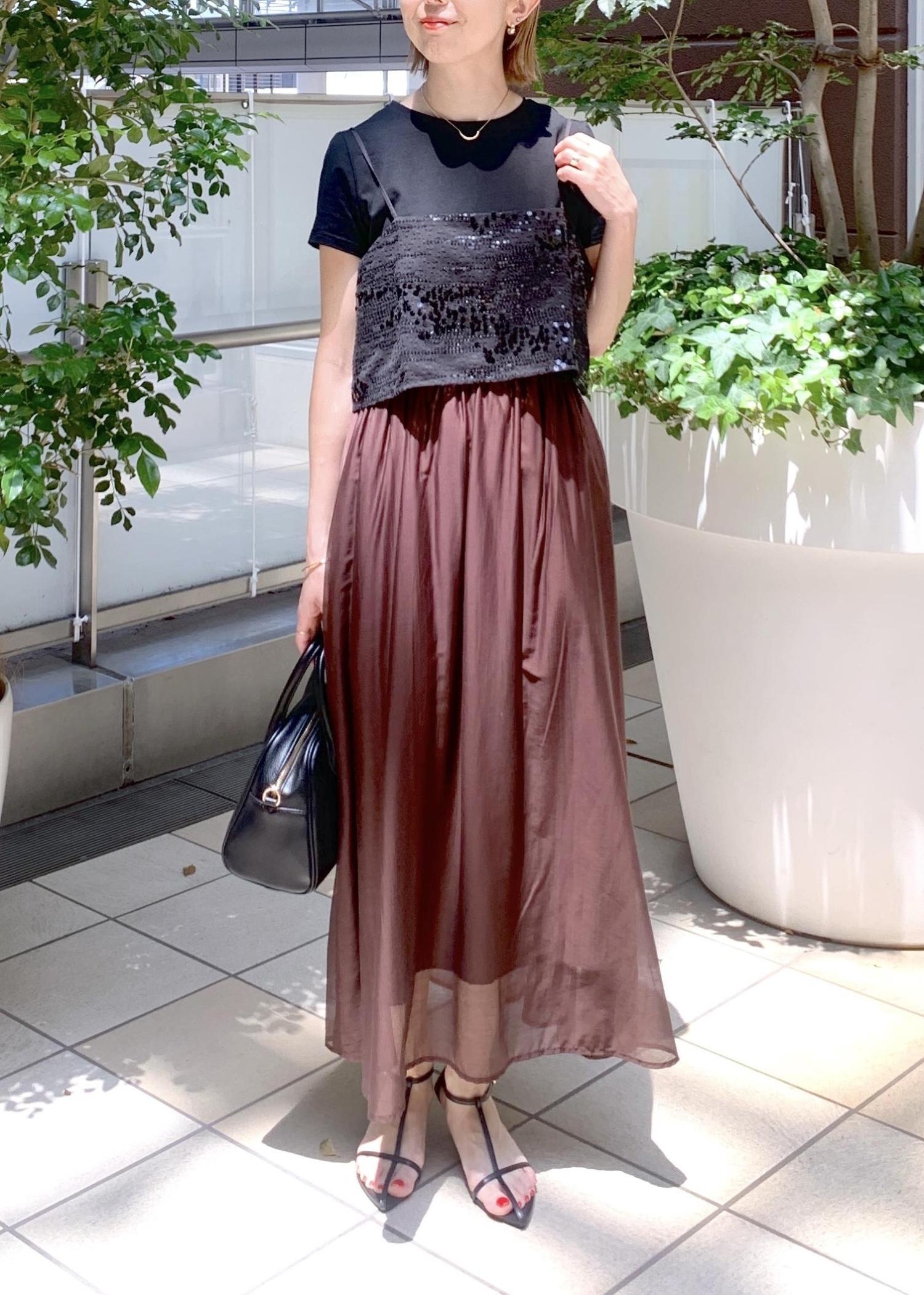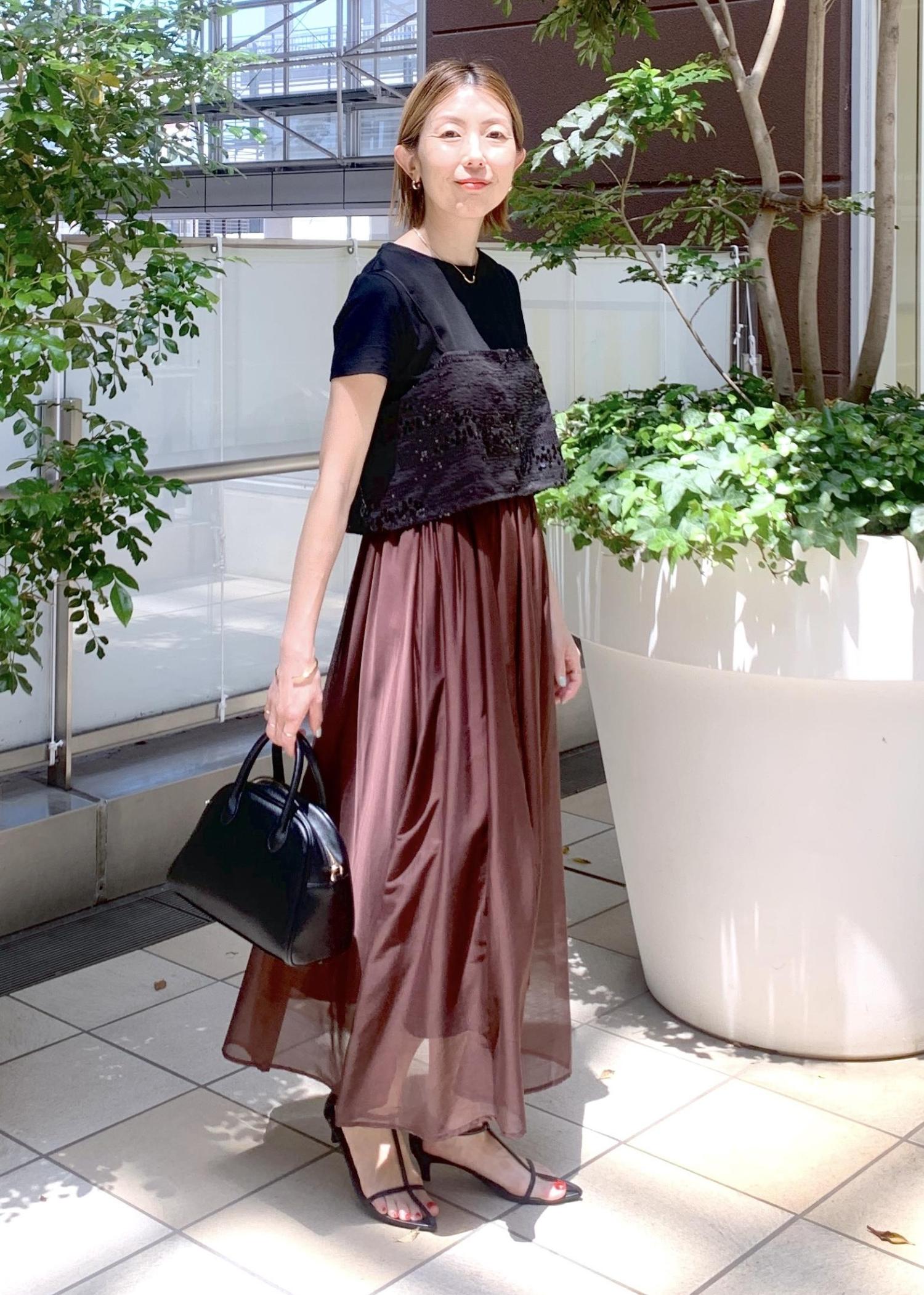 軽やかなシアー素材のブラウンスカートとスパンコールが華やかなビスチェを合わせた大人の夏スタイリング。