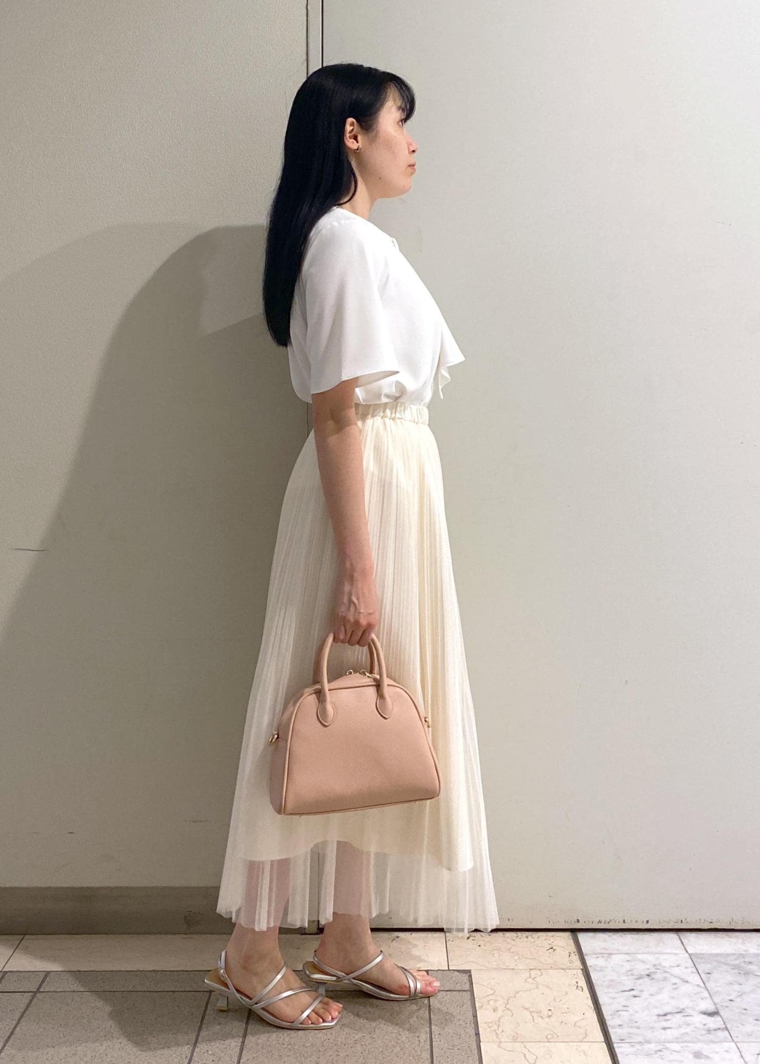 差し色のバッグも馴染むようにパステルカラーのピンクをチョイス。