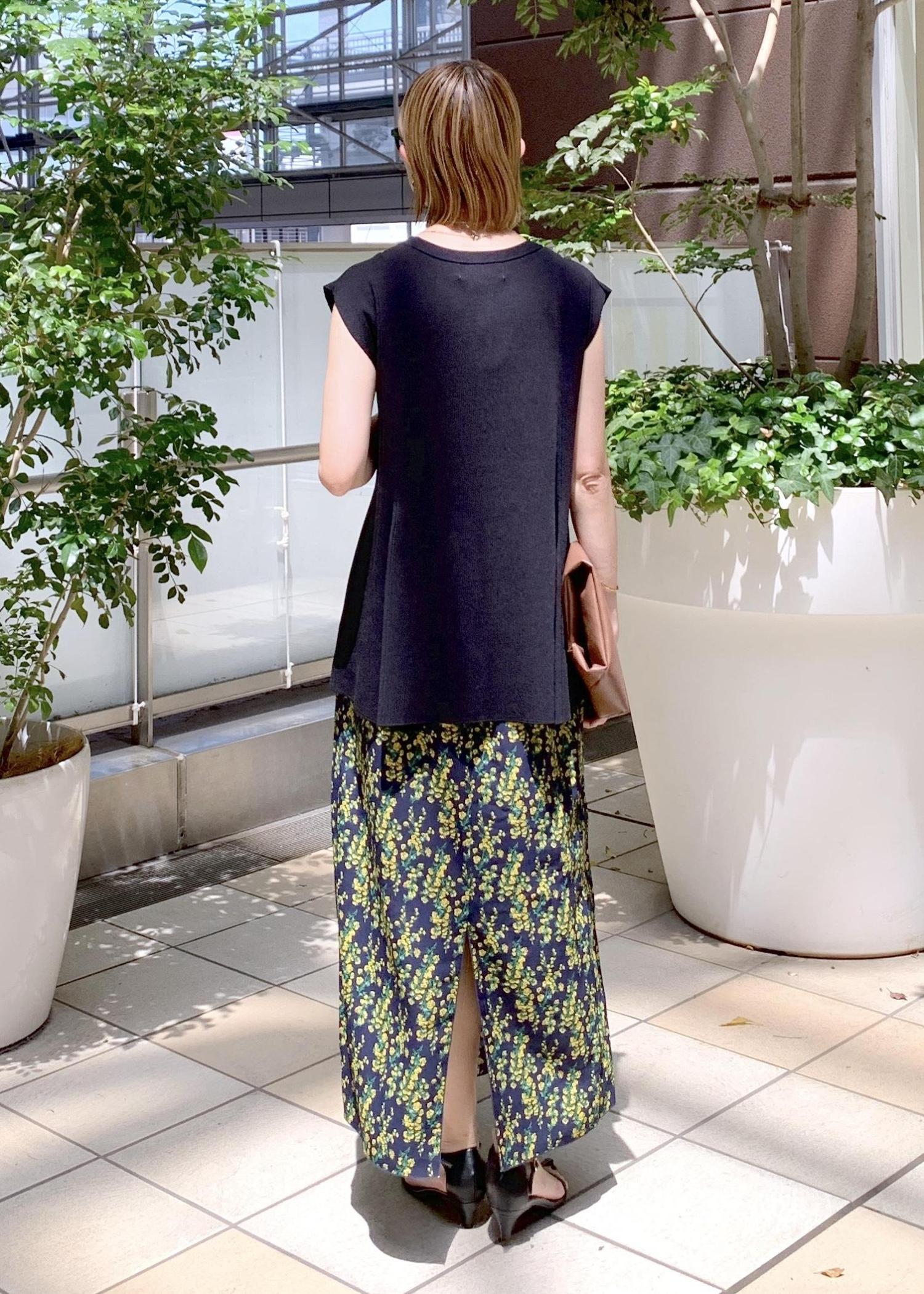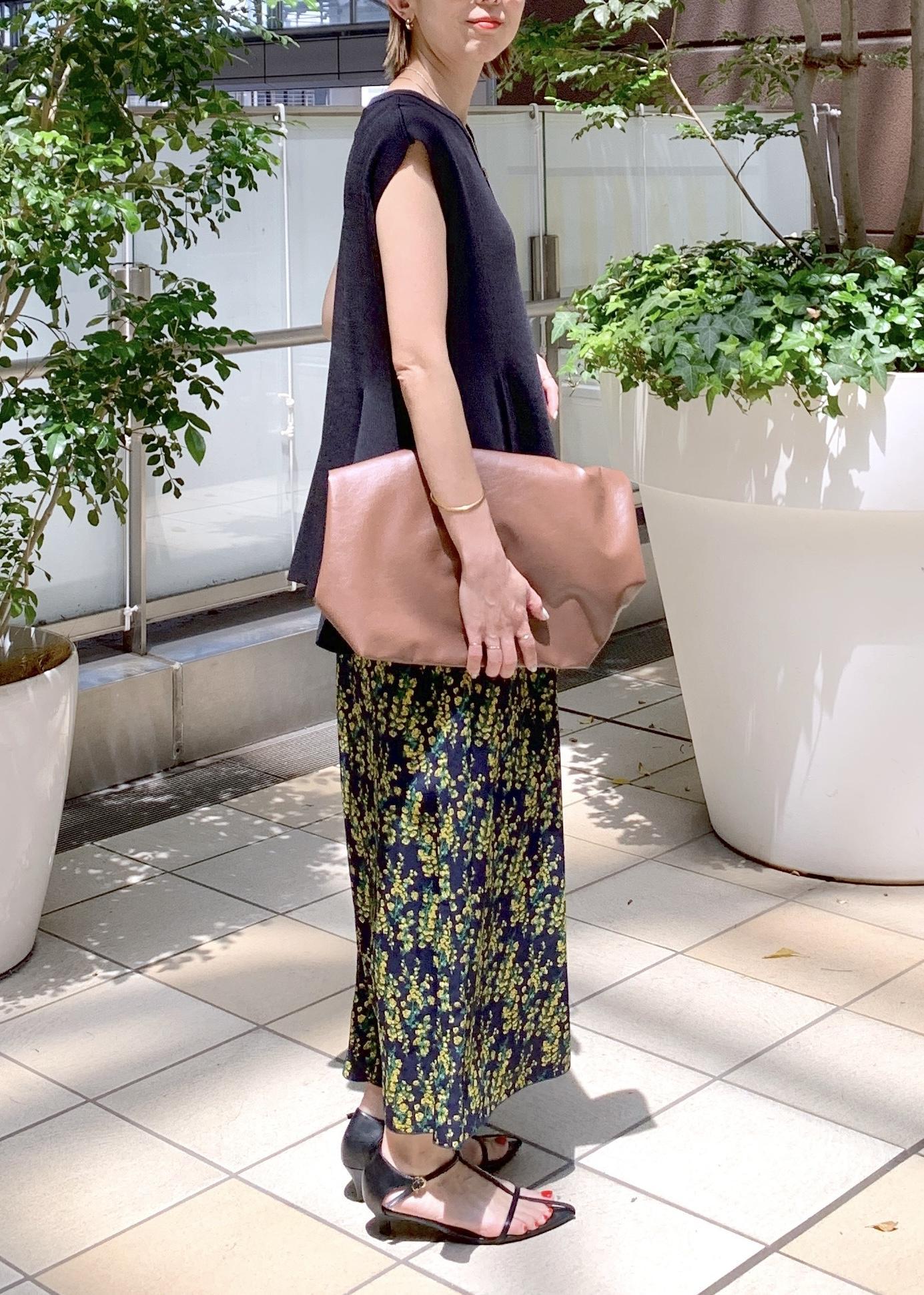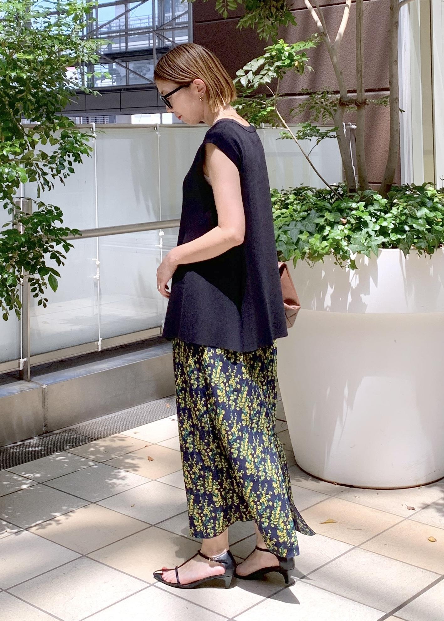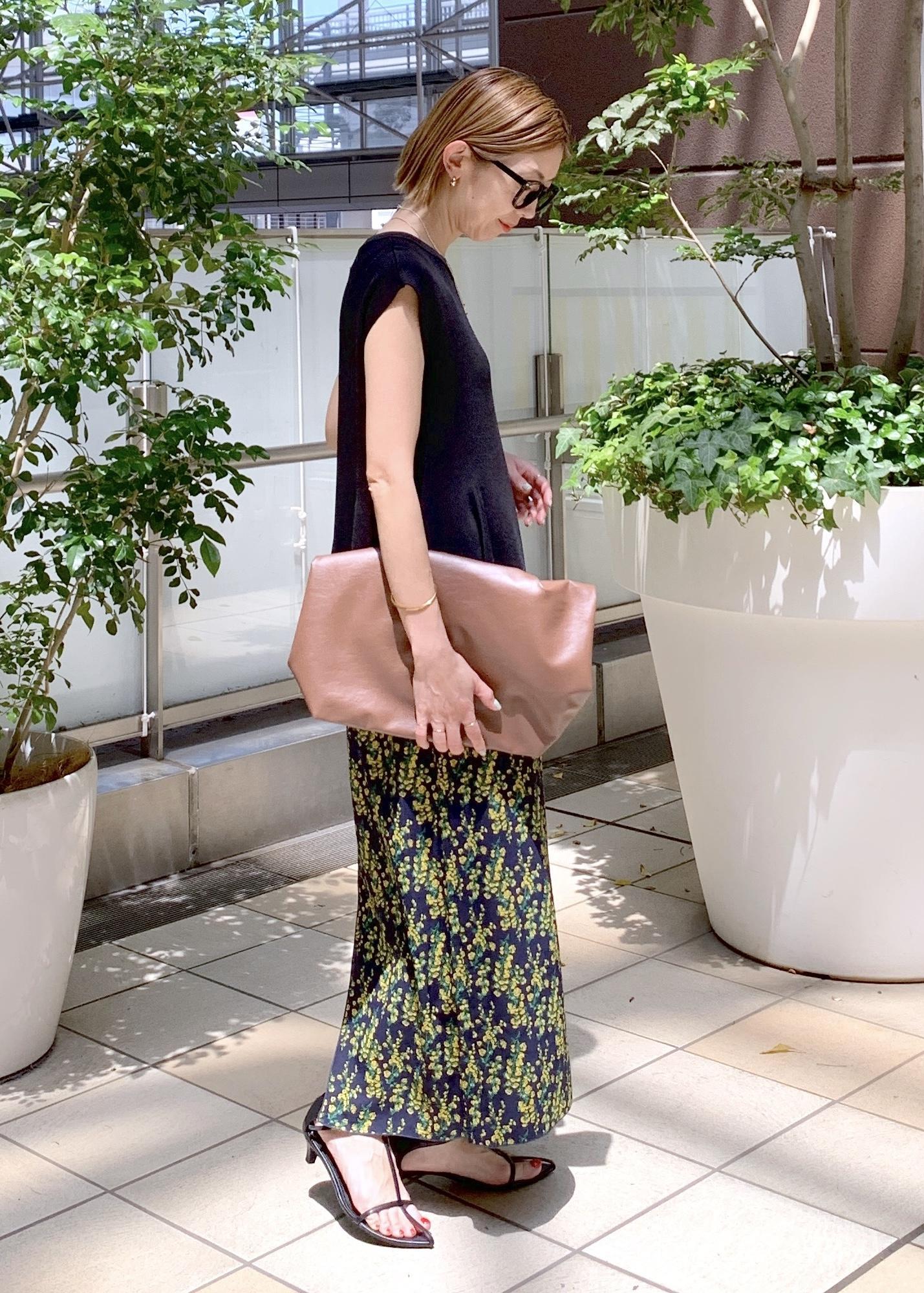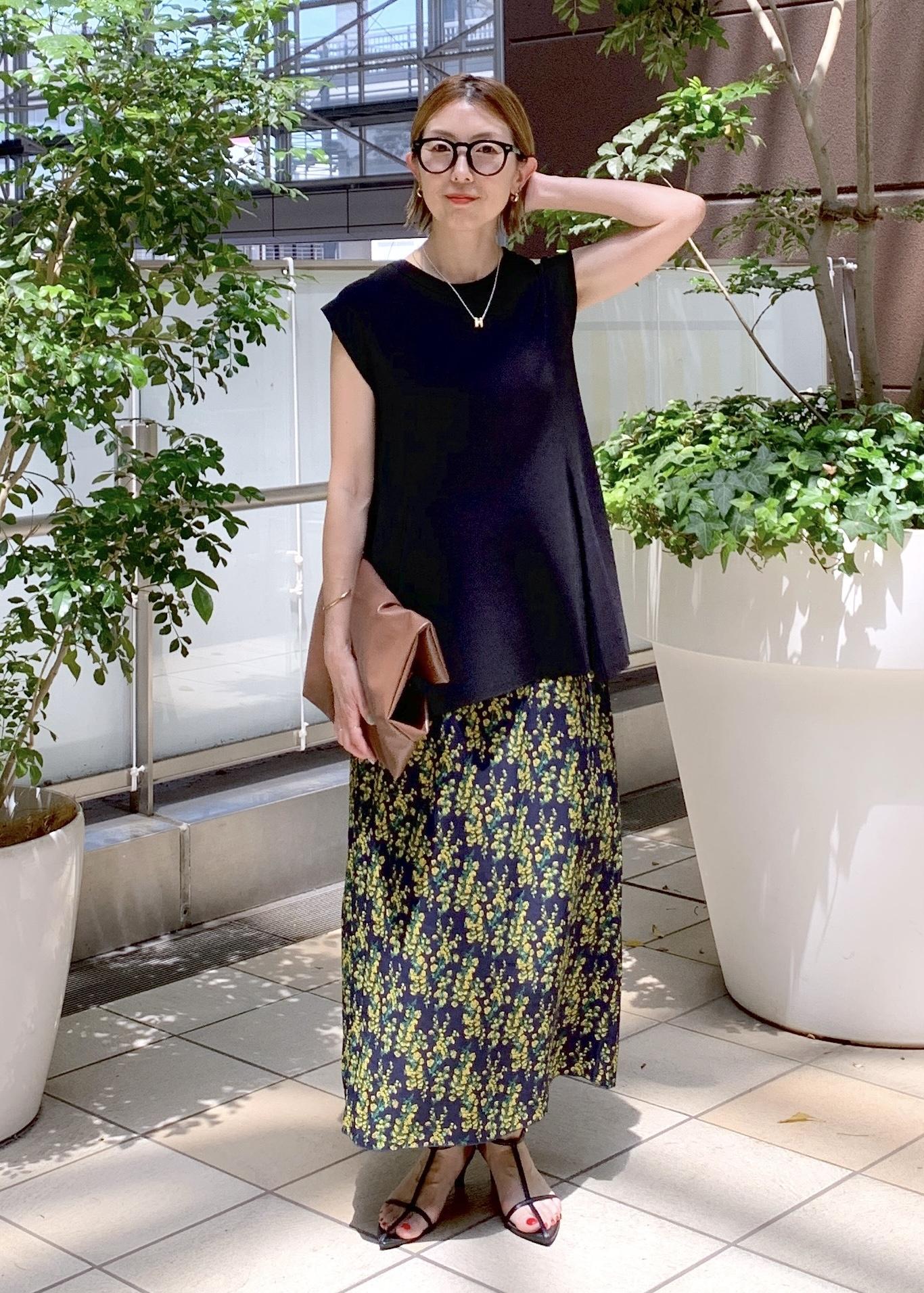 可愛らしいイメージのある花柄ですが、シックな色合わせで大人も着やすいスタイリングに。