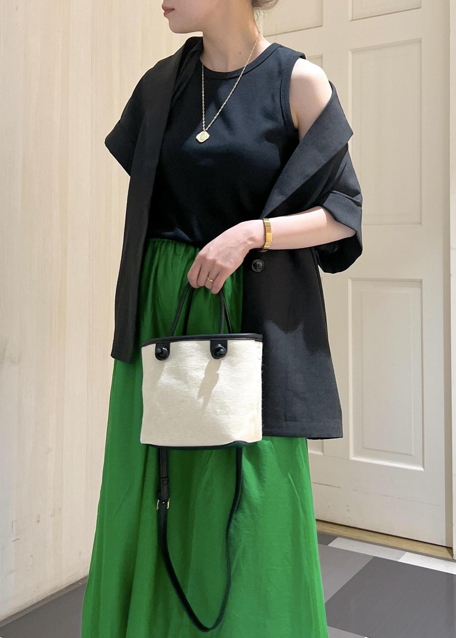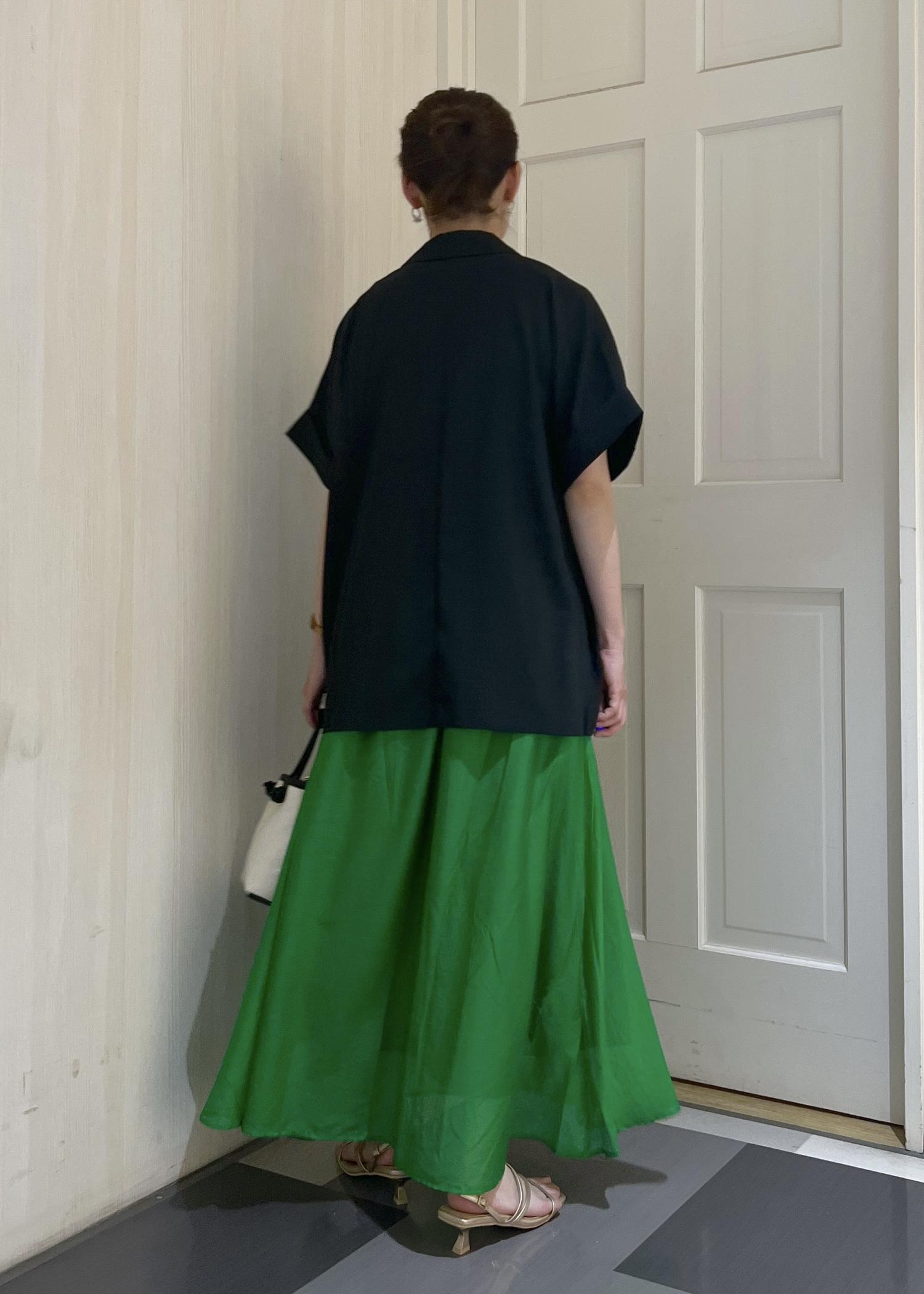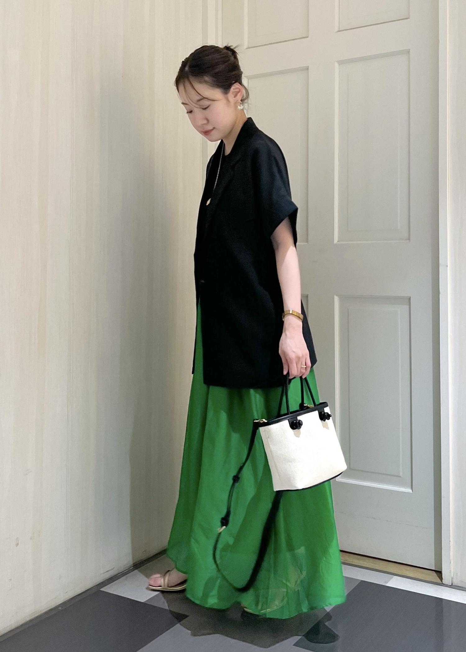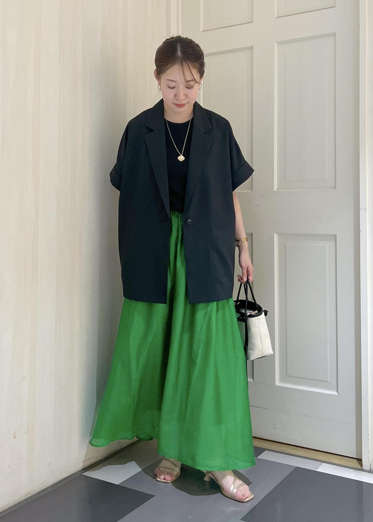 グリーンスカートにジャケットを合わせた大人なコーディネートです。