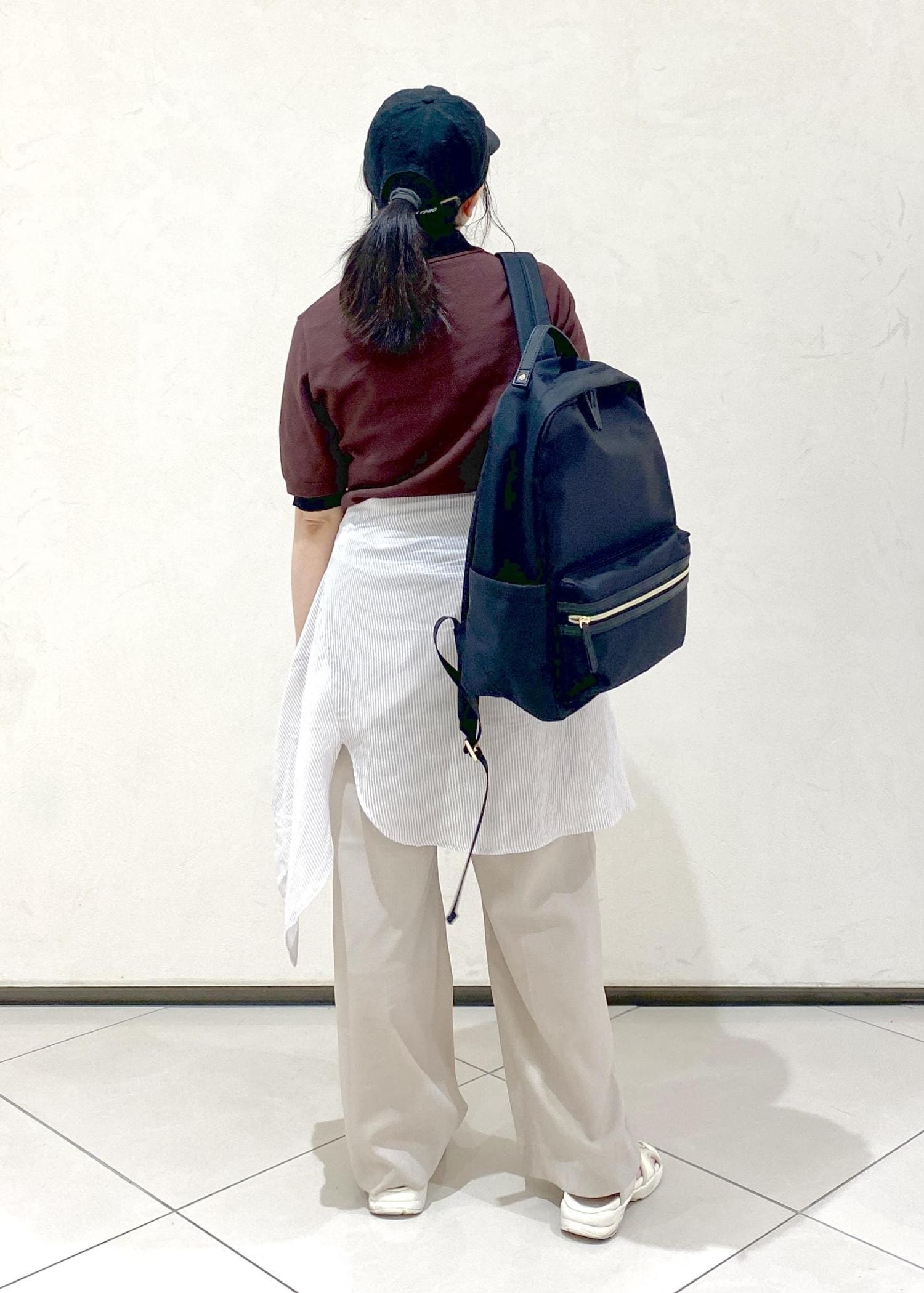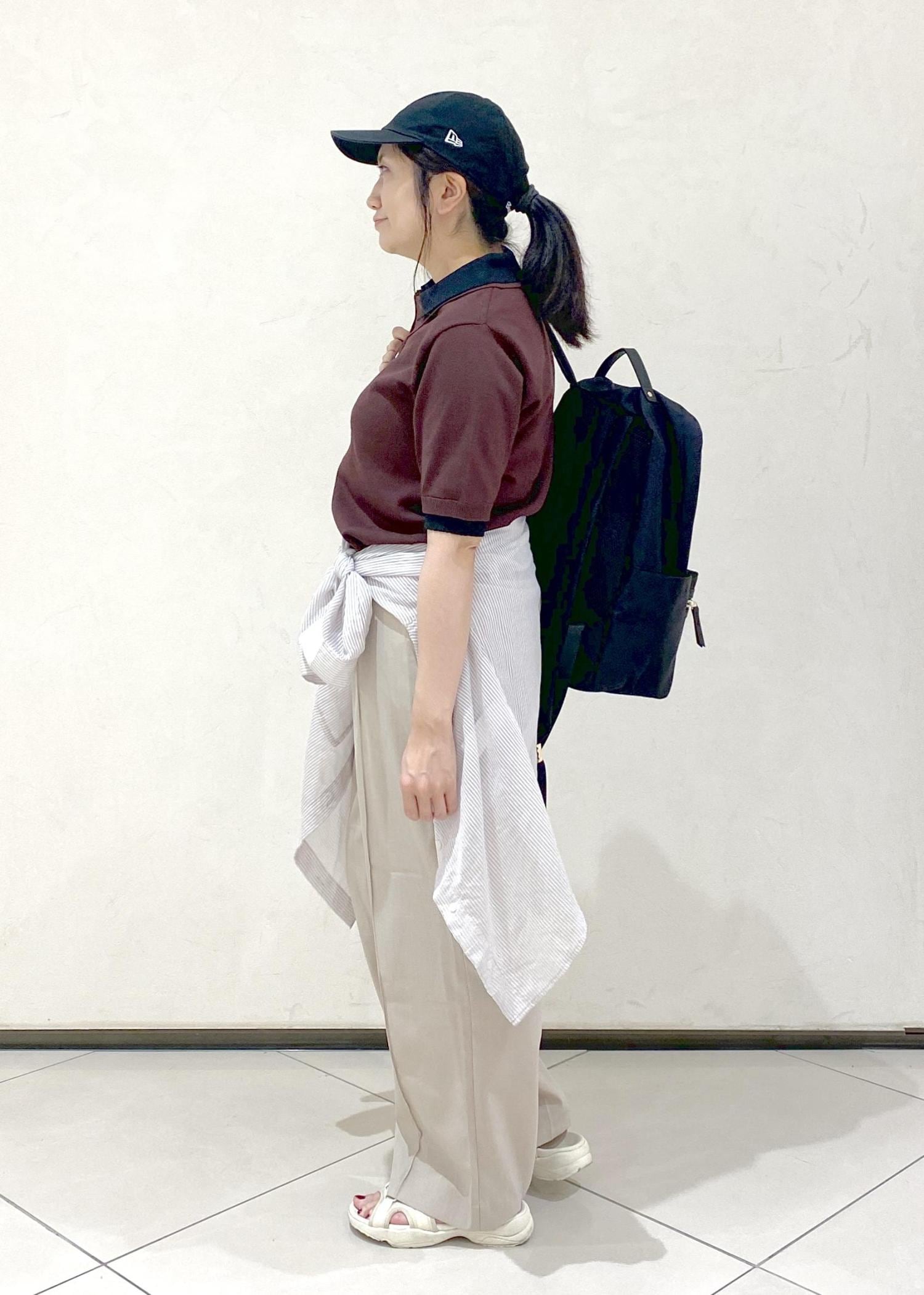 サラサラのニットに涼しく履けるパンツを合わせたカジュアルコーデです。いつもよりラインがスッキリしたので、キャップで頭にポイントを持ってきてシャツを腰巻きすることで安定の体型カバー✨安心できます。アクティブに動けておススメです。