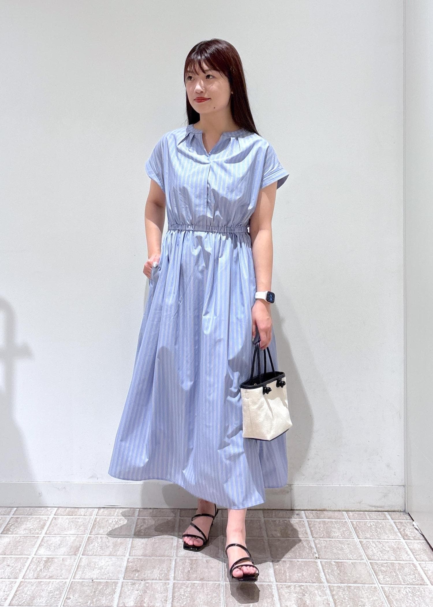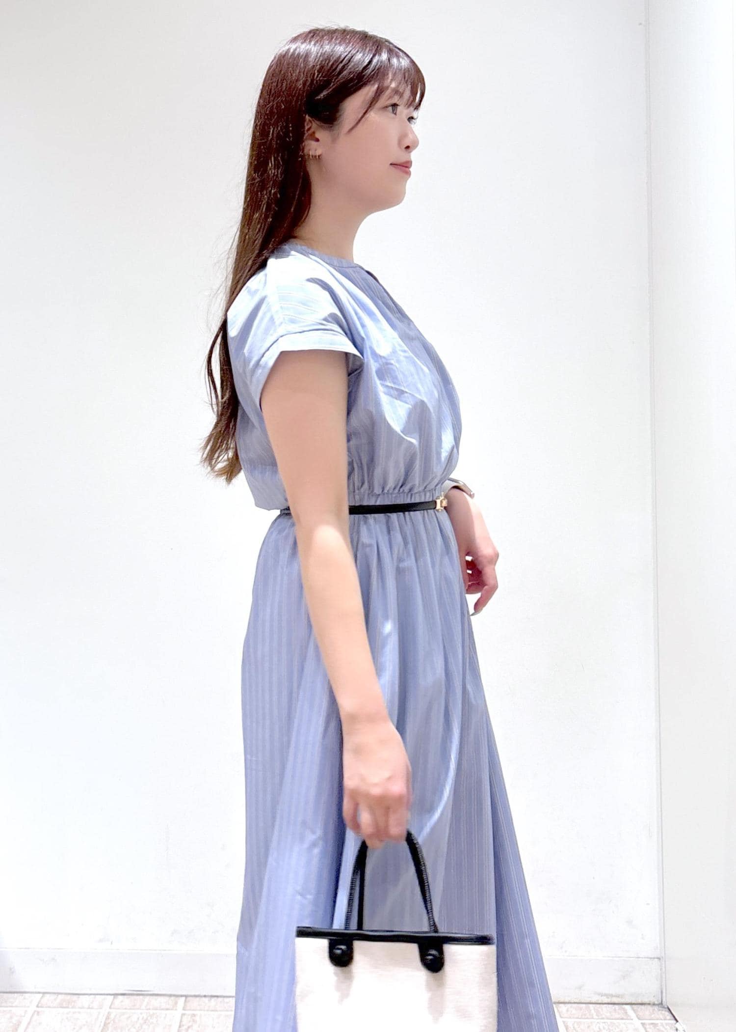ウエストゴムで切り替えが入っており、袖も二の腕にかかるぐらいのフレンチスリーブなので1枚でシルエット綺麗に着ていただけます。
