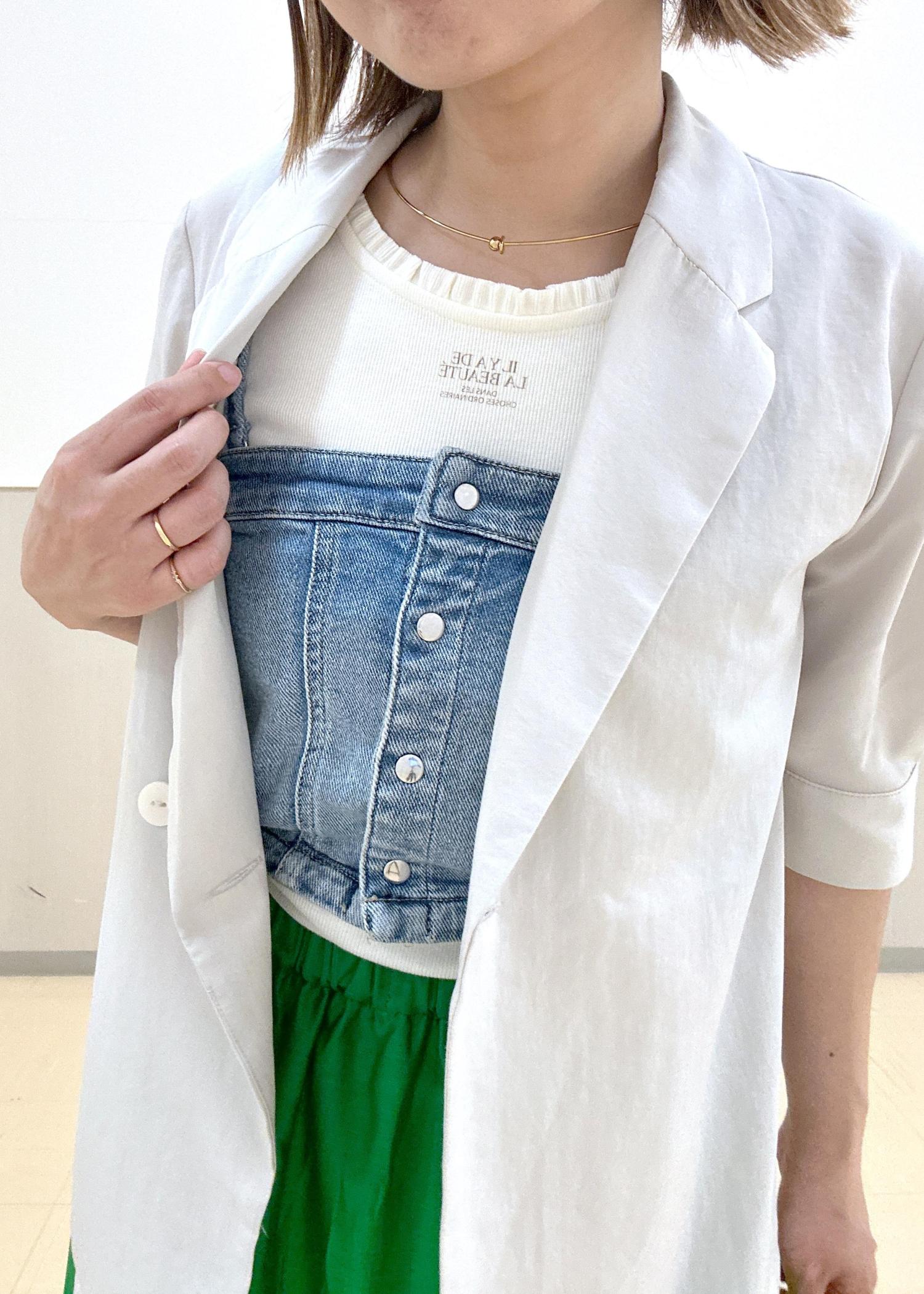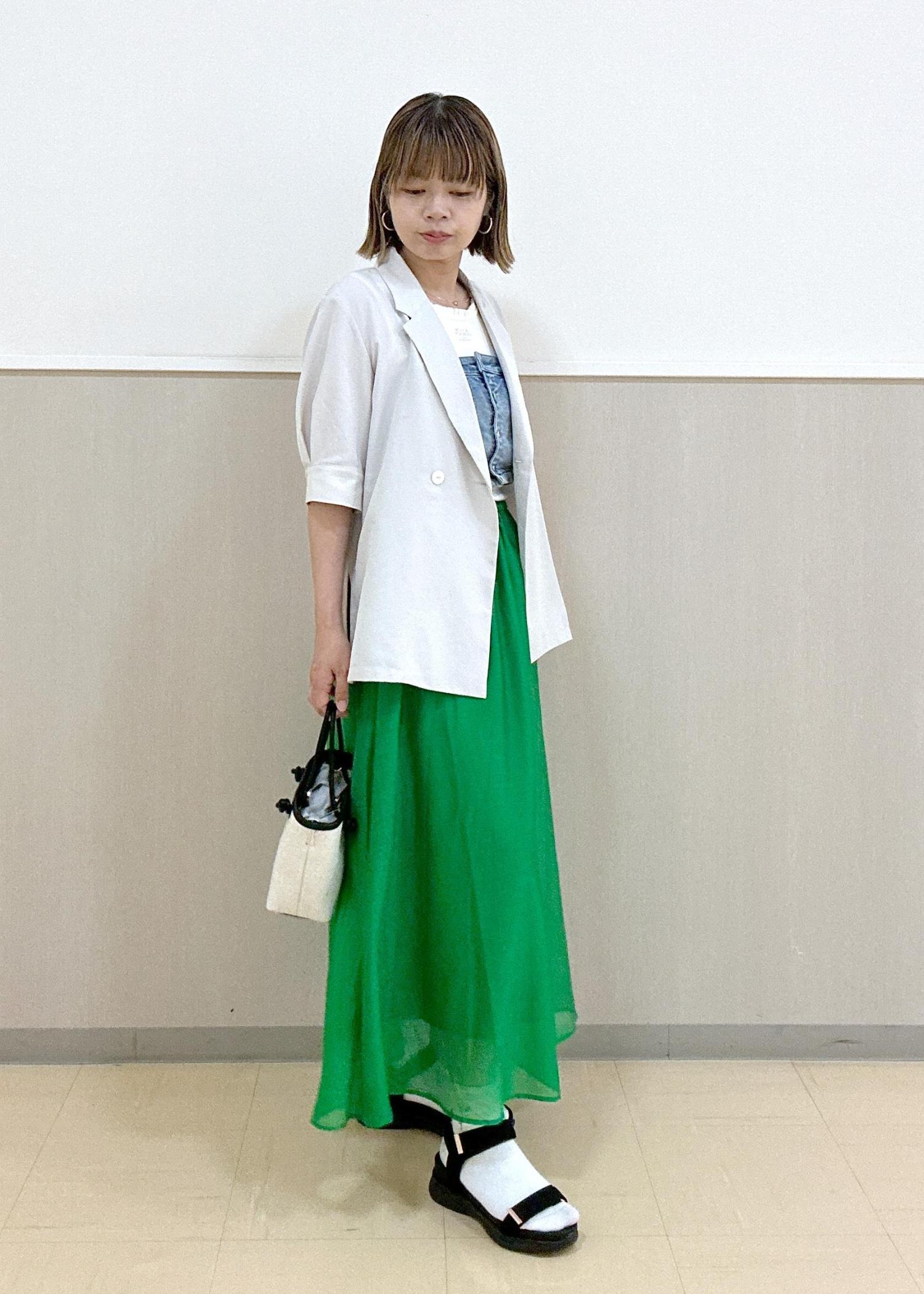 大人なシルエットでキレイ目だけれど、インナーにデニムのビスチェを入れたり、足元にスニーカーサンダルを履いたりと
