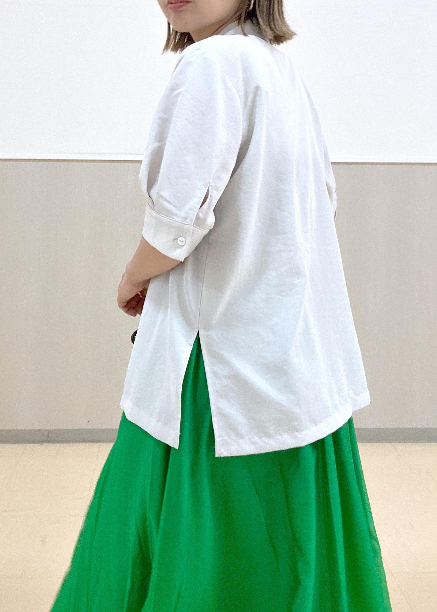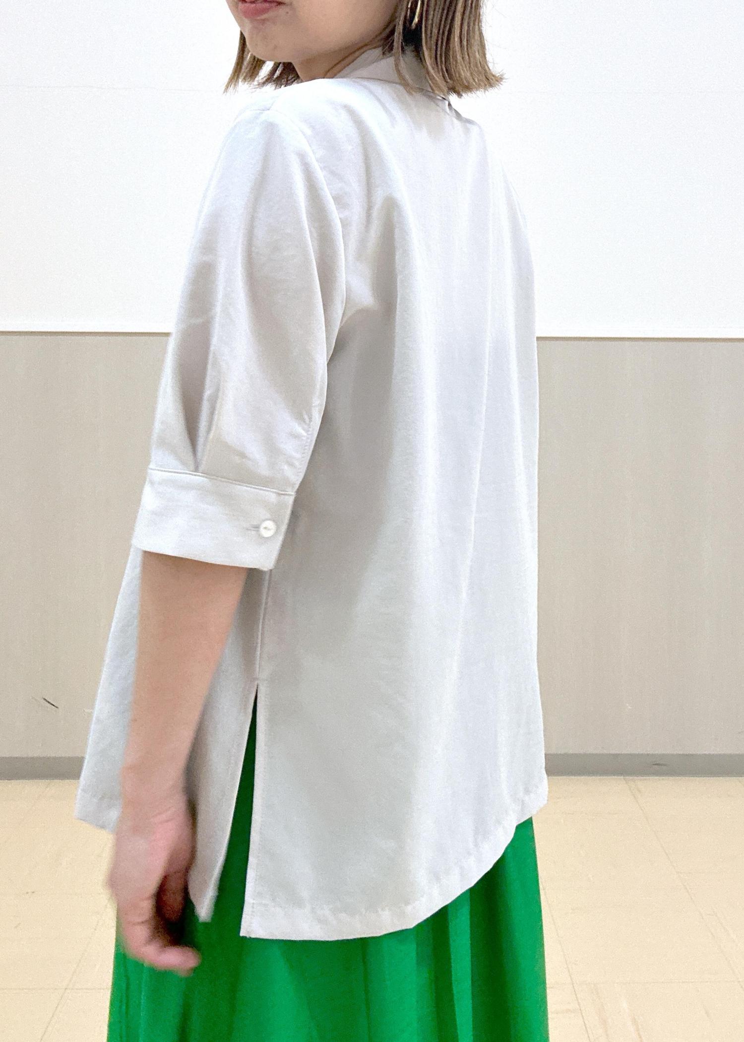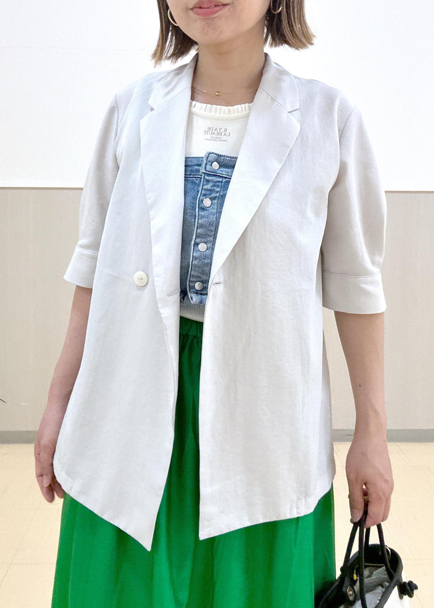 半袖のジャケットブラウスを羽織って大人カジュアルに。