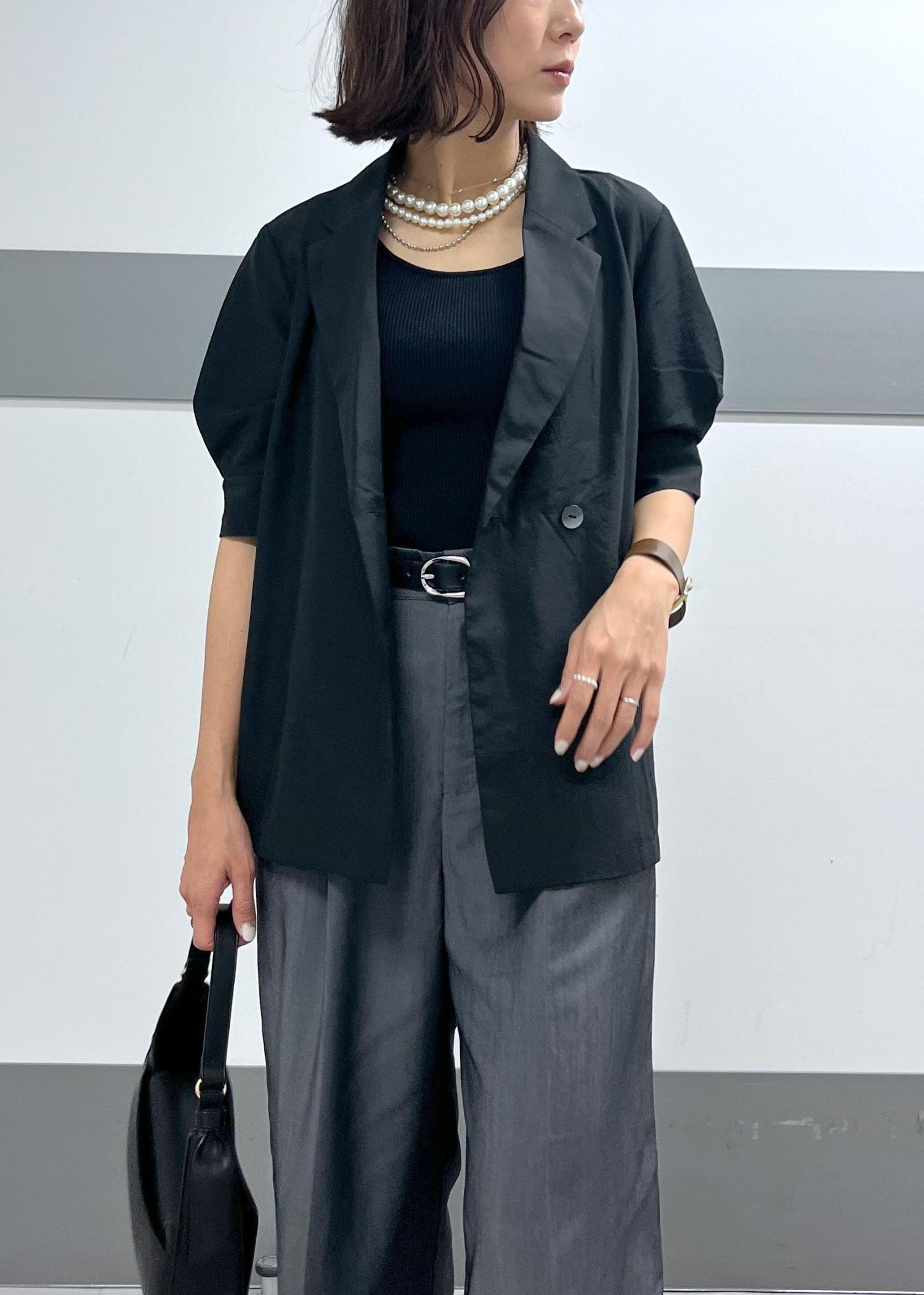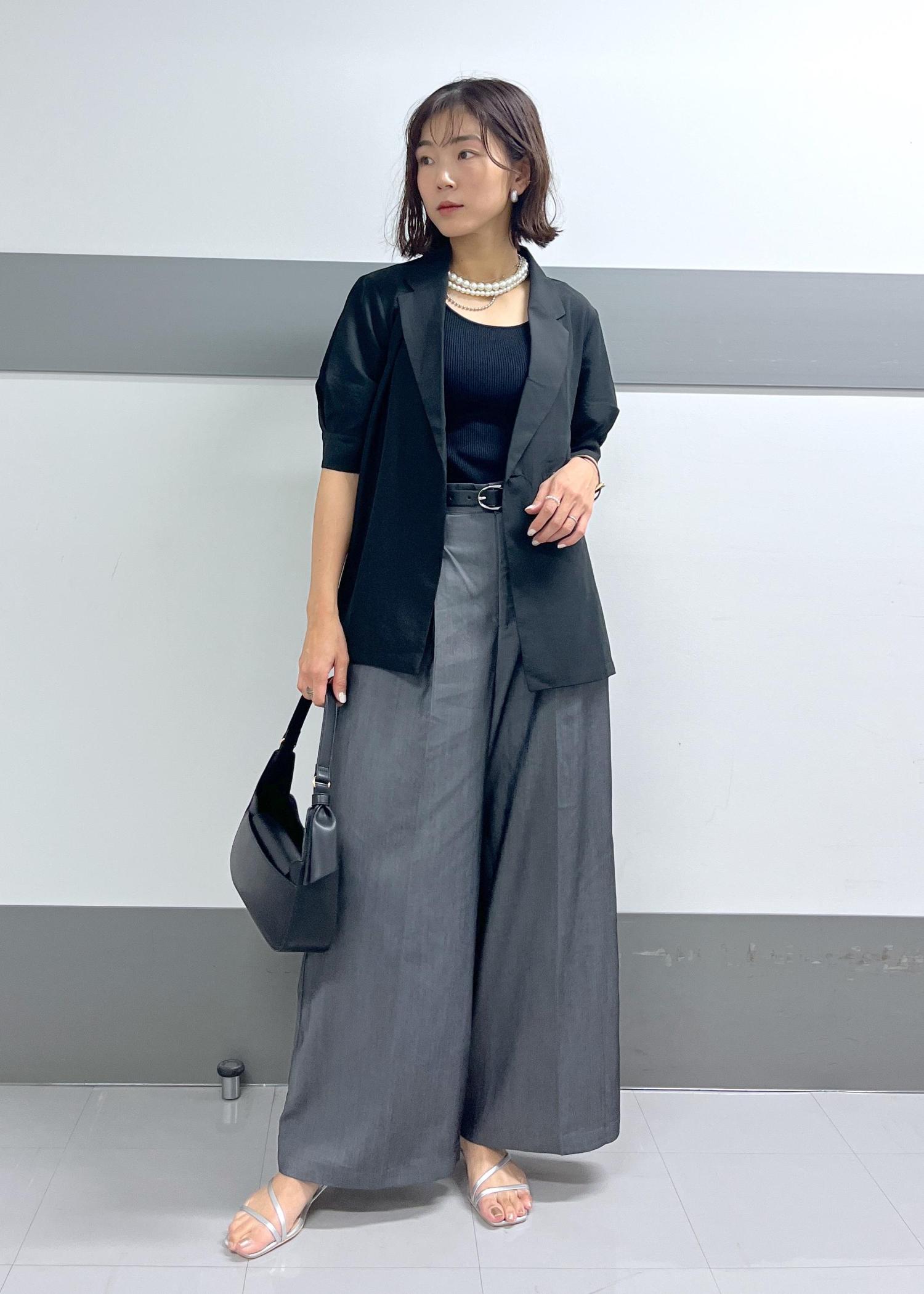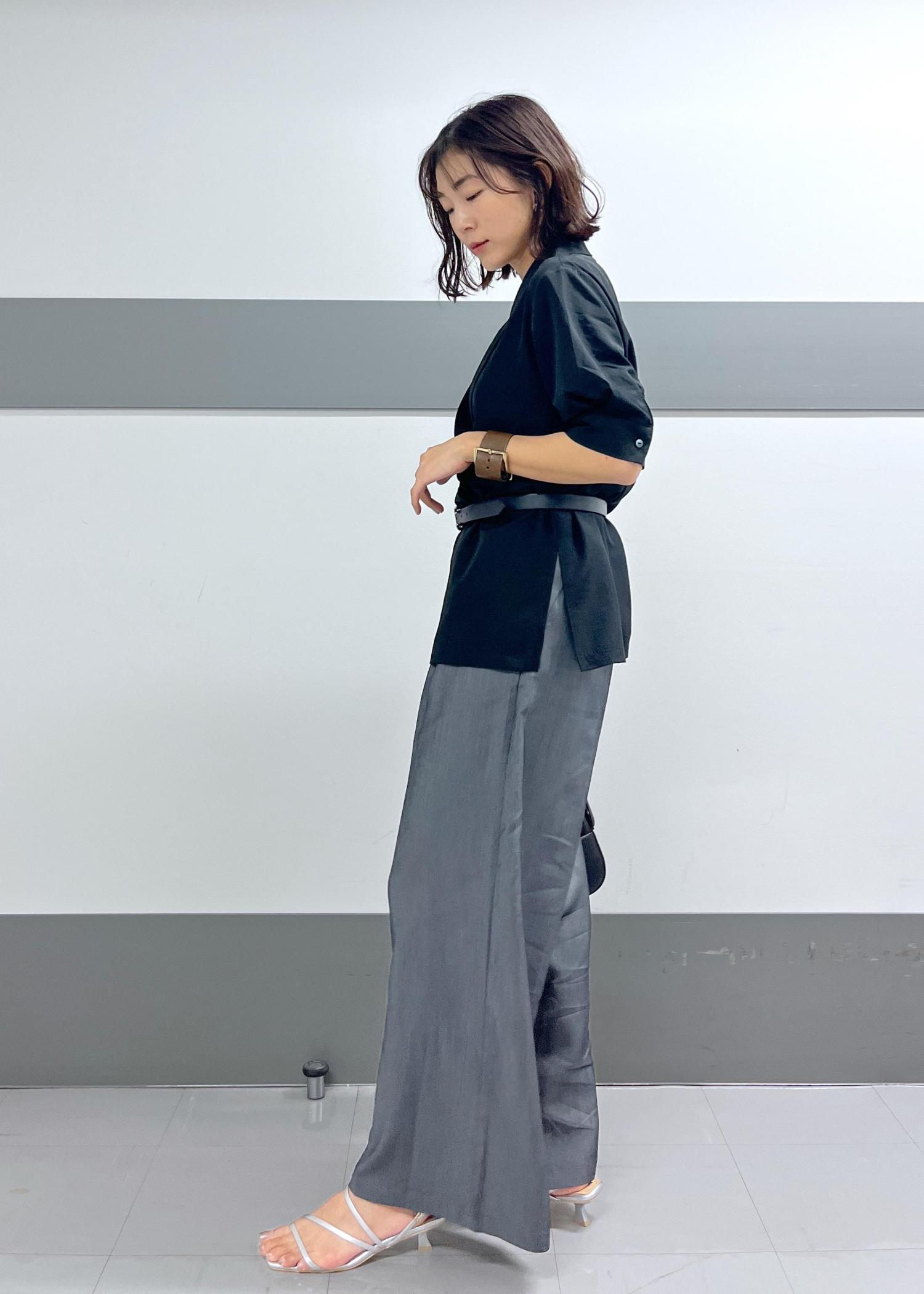 ボトムをチャコール、足元をシルバーのサンダルにすることで軽さのでるブラックコーデになります。