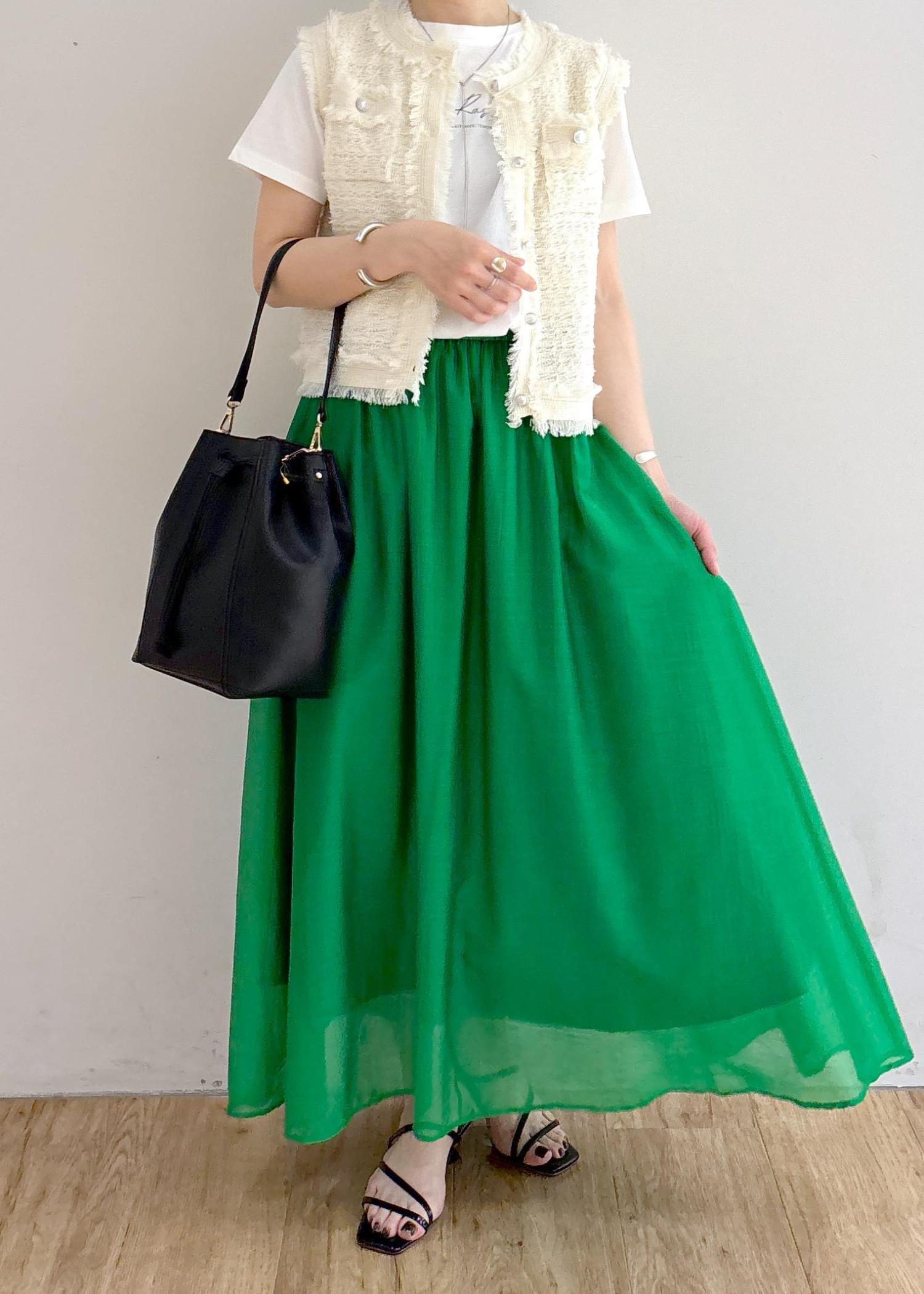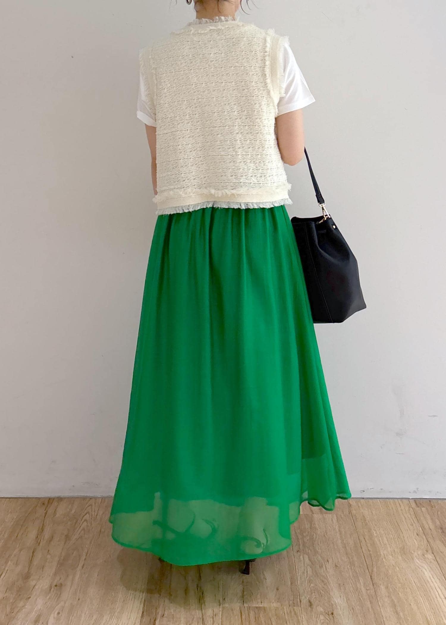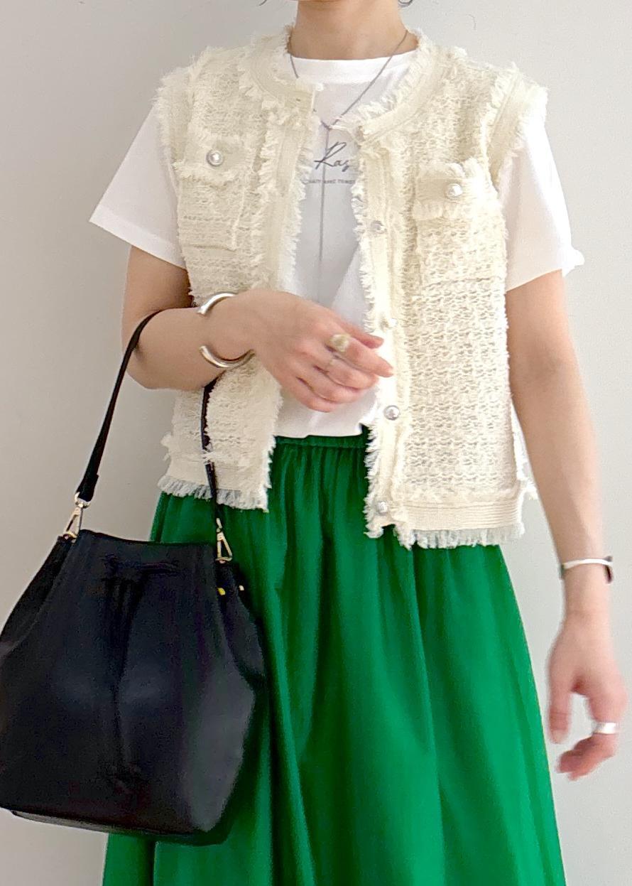 鮮やかなグリーンのスカートにツイードを合わせて、大人の休日スタイルに。バランスのとりやすいツイードベストは長さが2種類。今回は短い丈を着用しています。