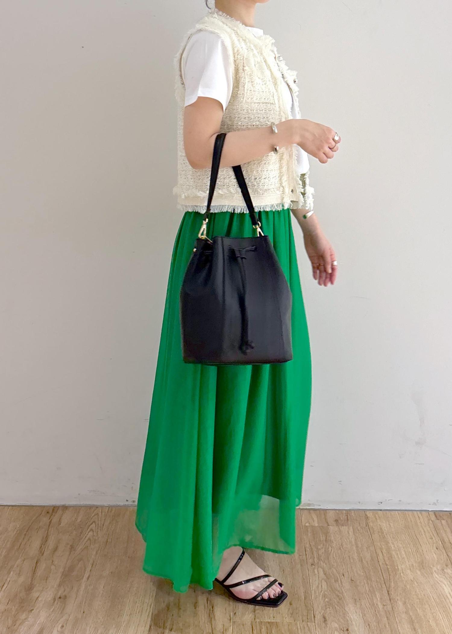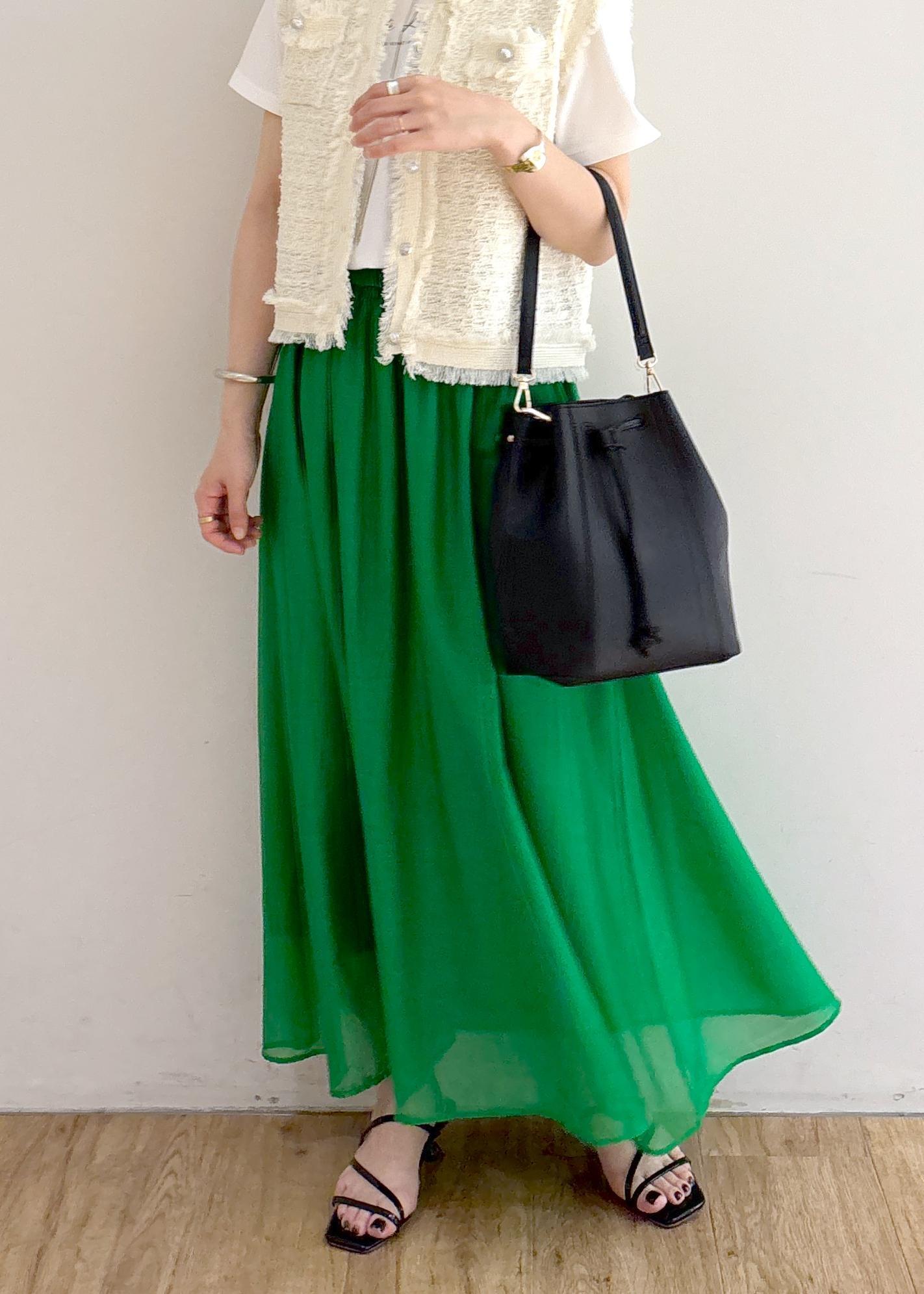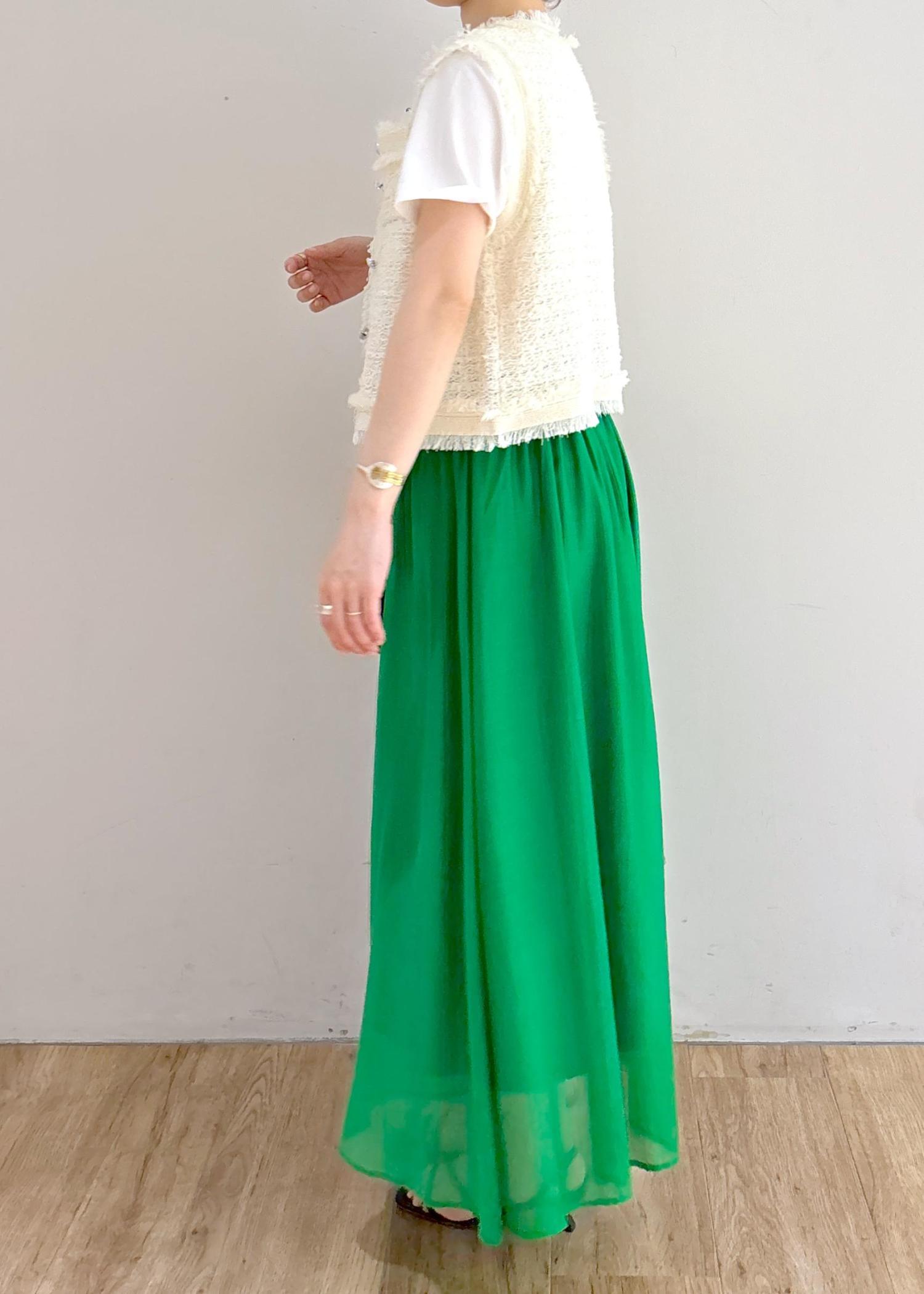 鮮やかなグリーンのスカートにツイードを合わせて、大人の休日スタイルに。バランスのとりやすいツイードベストは長さが2種類。今回は短い丈を着用しています。