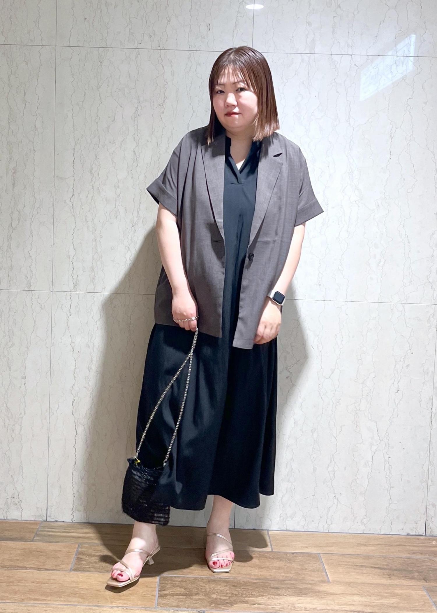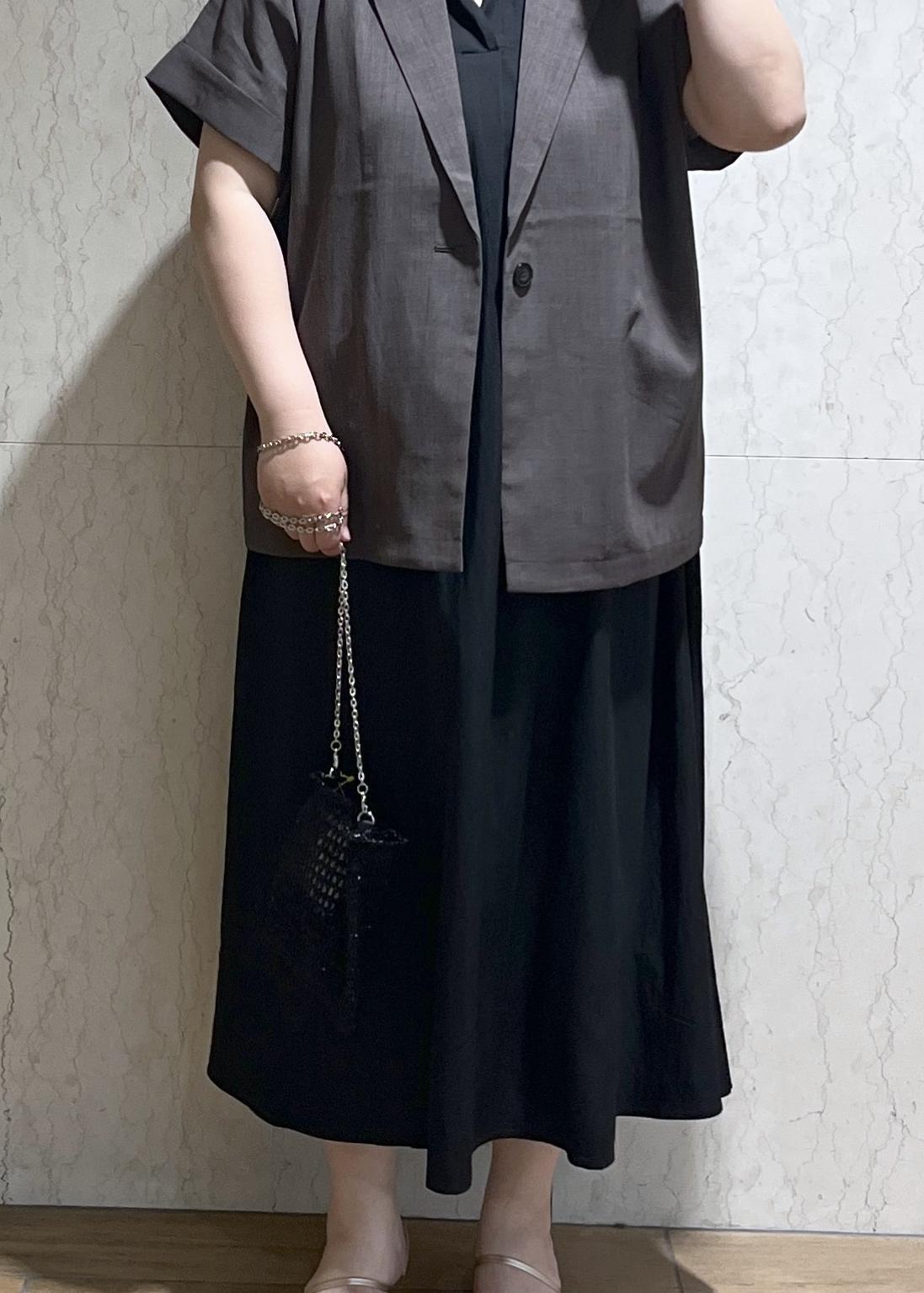 ブラックのワンピースに半袖ジャケットを合わせたお出かけコーデです。