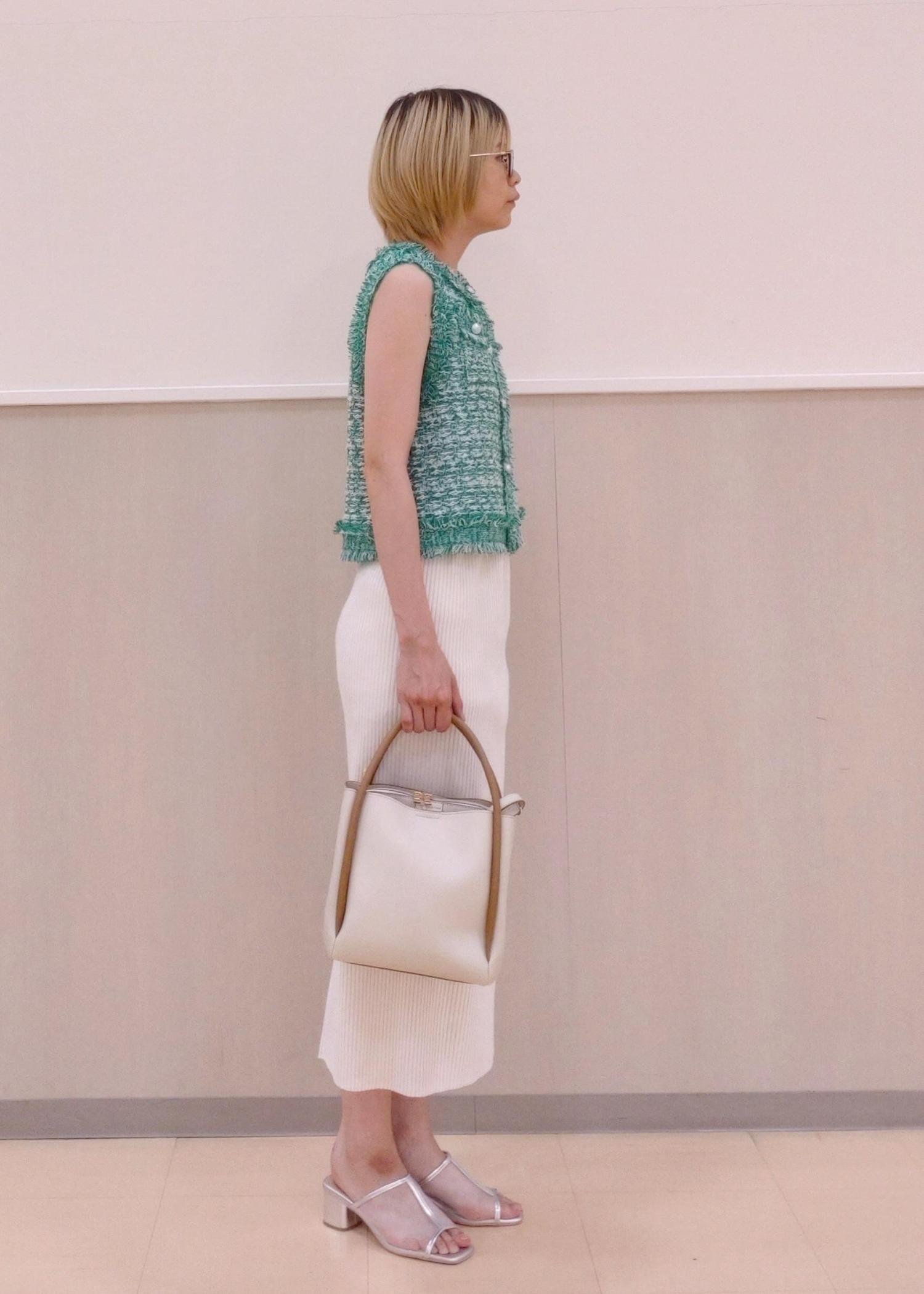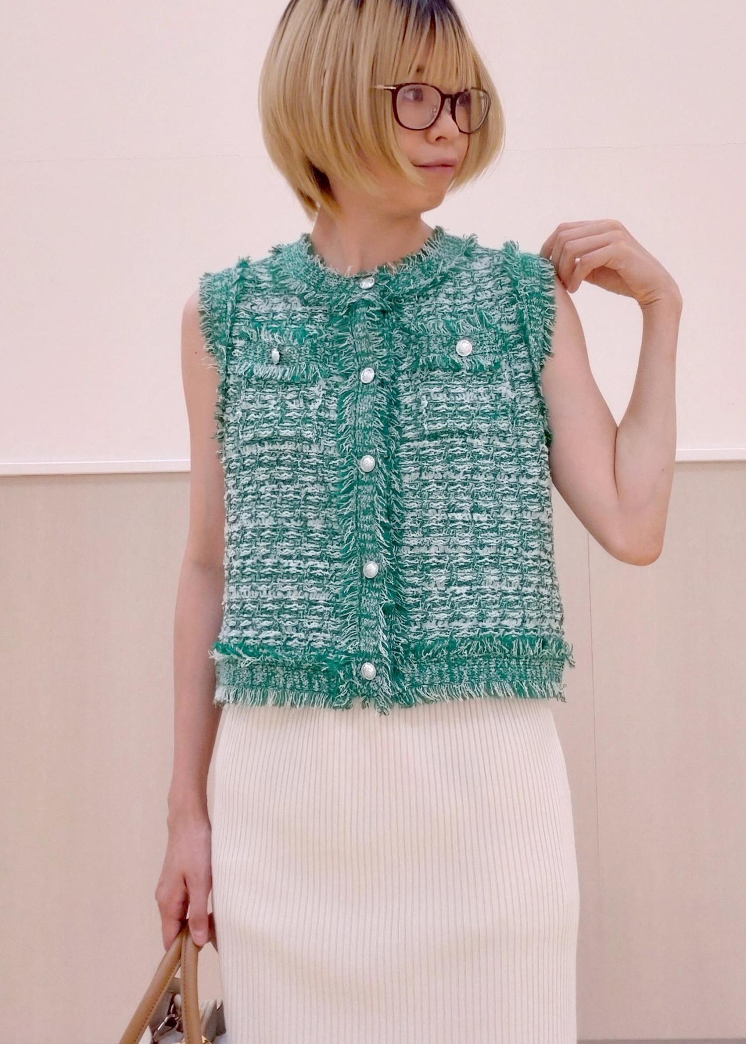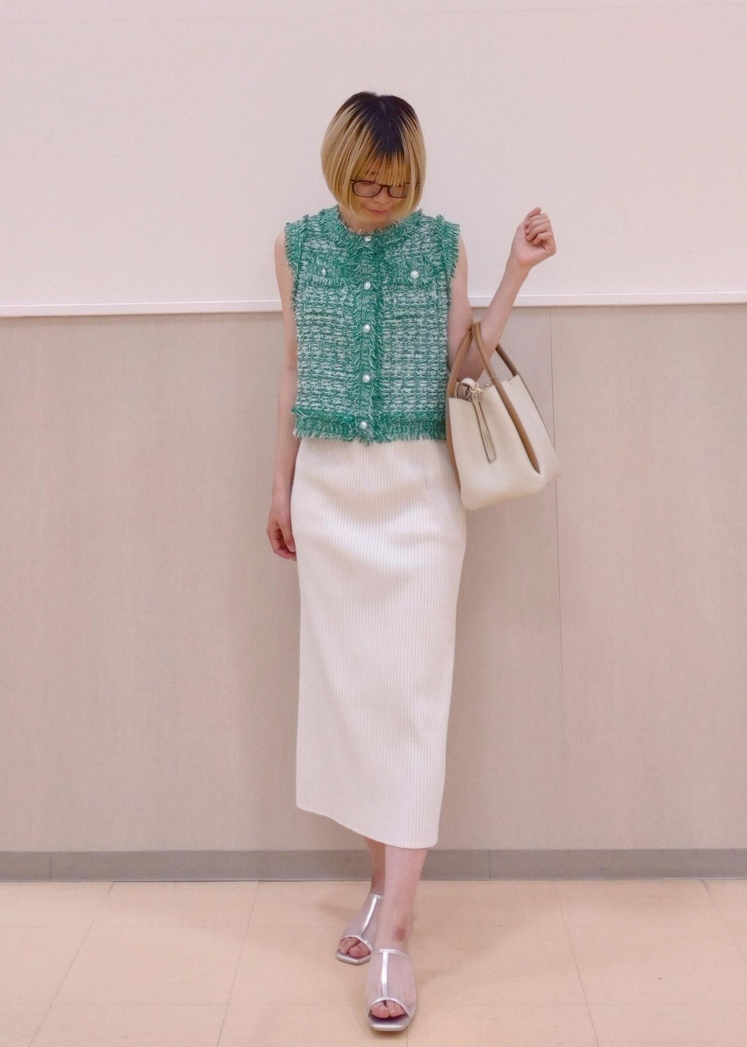 鮮やかなグリーンが映えるサマーツイードのベストに上品なアイラインスカートを合わせたお仕事コーディネートです
