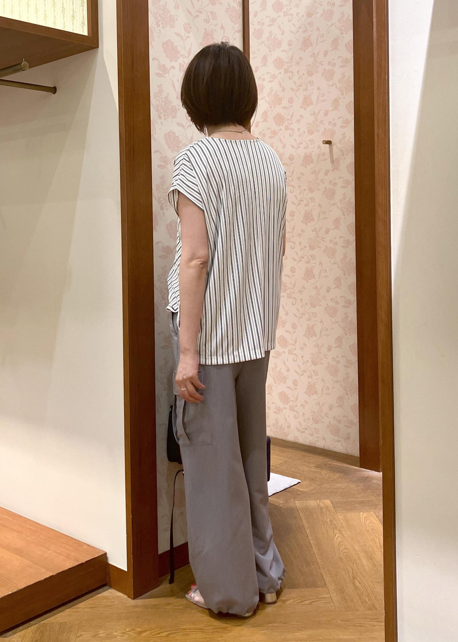 Vネックは深くないので、インナーが見えないくらいの着丈です。