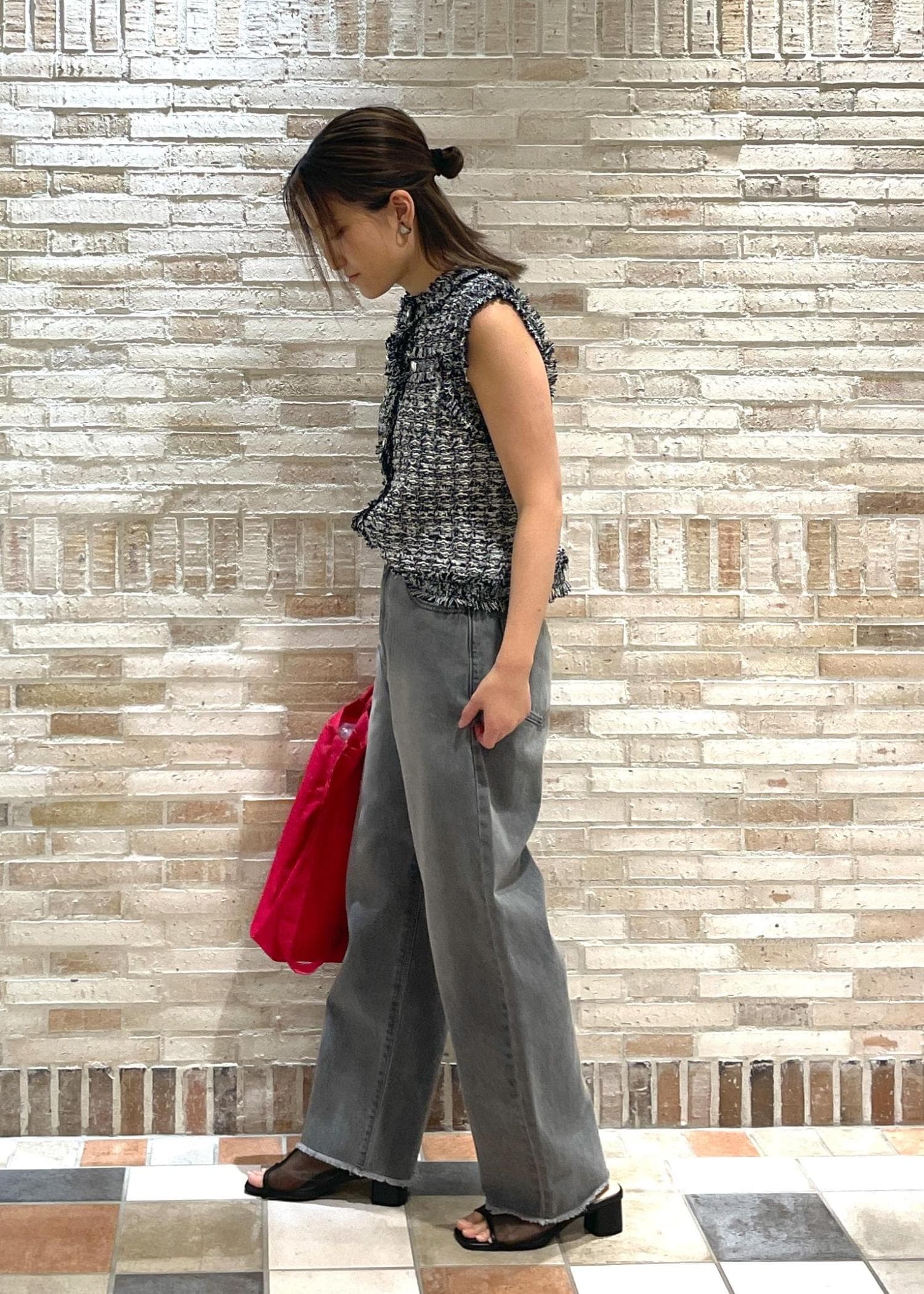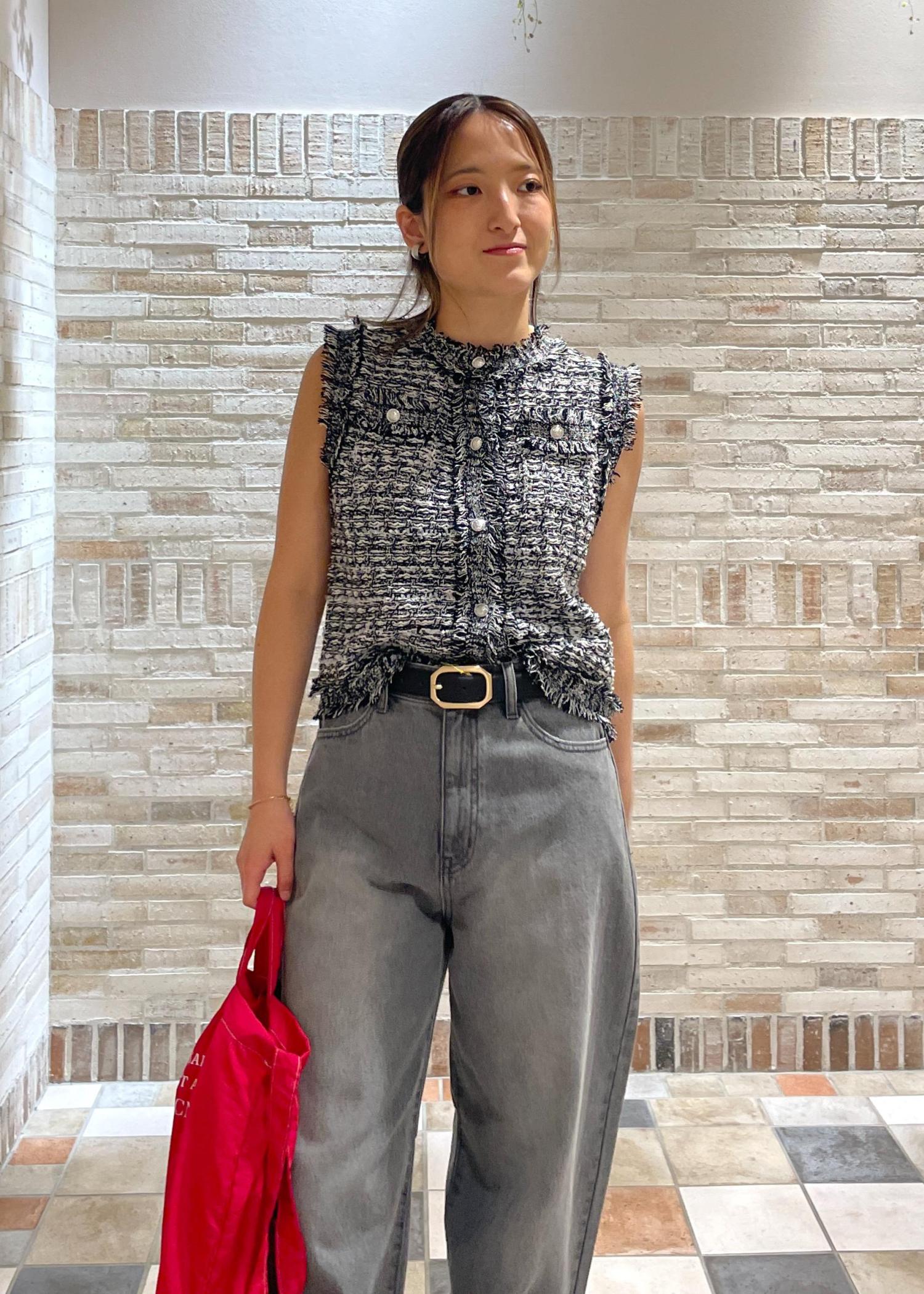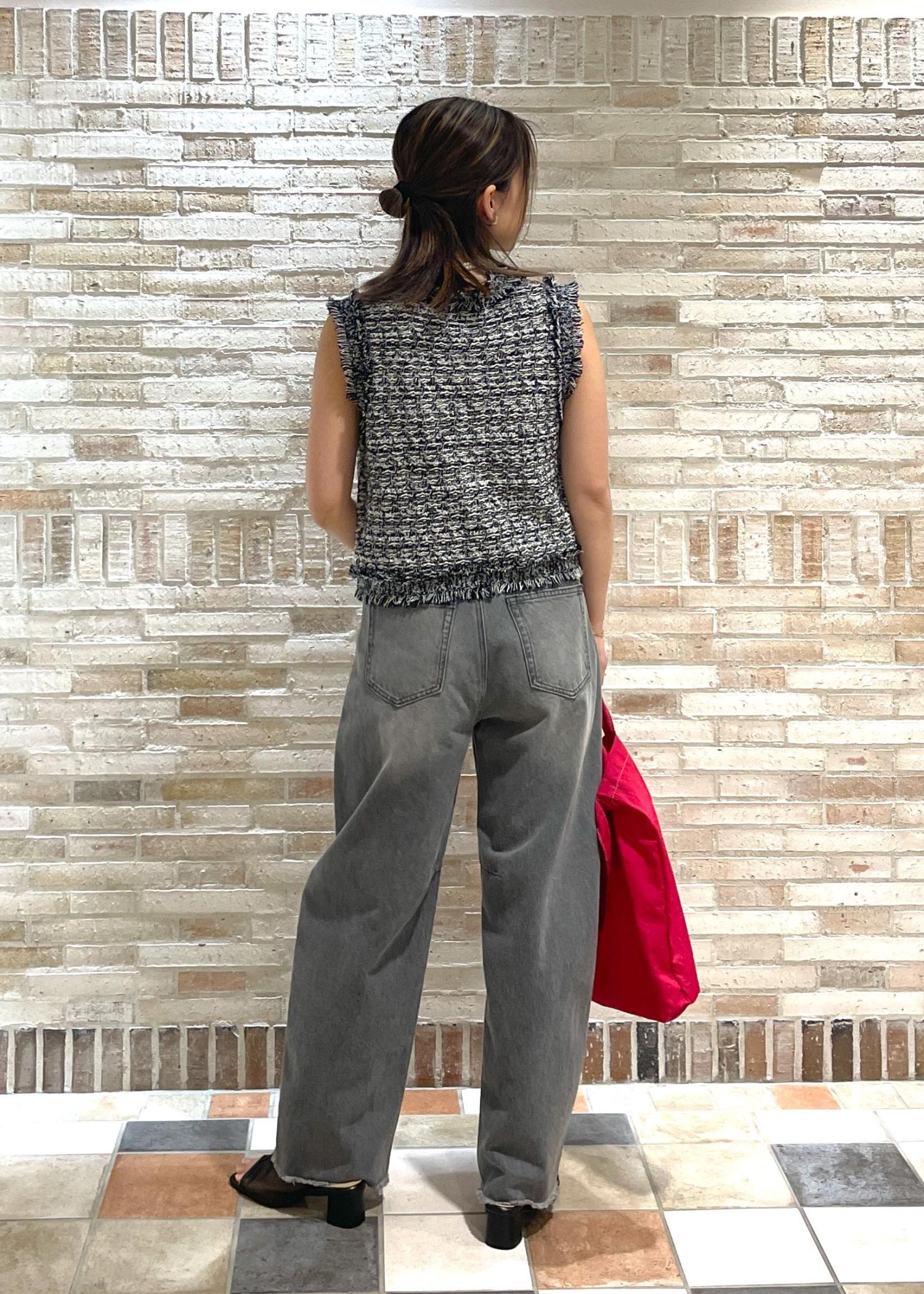 綺麗めな印象のツイードライクなカーディガンですが、ブラックのデニムと合わせてダークなカラーでまとめることで、かっこいいカジュアルなコーディネートに仕上げました!汚れが目立ちにくいカラーのコーディネートなので、梅雨の時期にもおすすめです♪