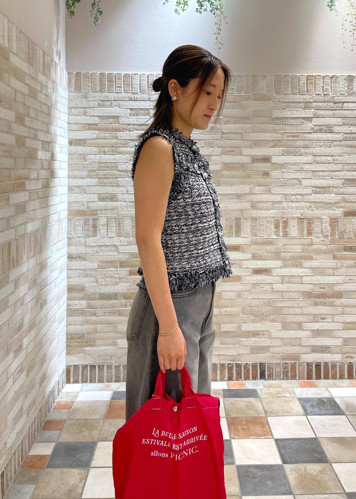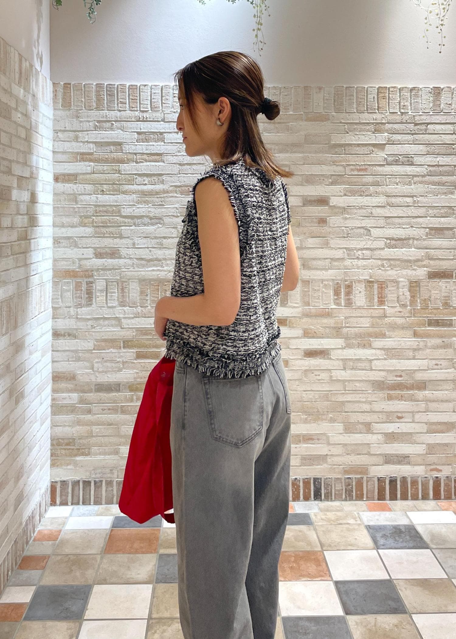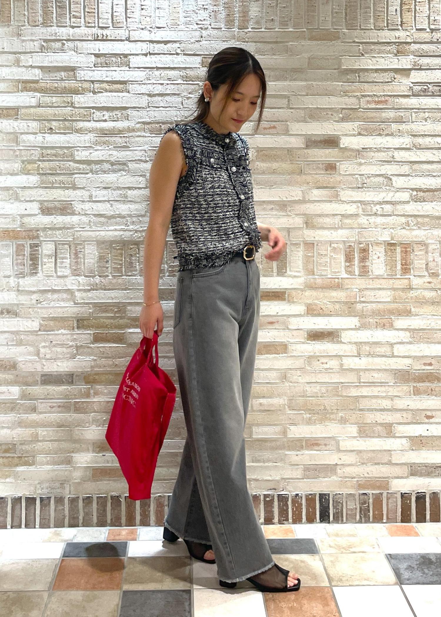 綺麗めな印象のツイードライクなカーディガンですが、ブラックのデニムと合わせてダークなカラーでまとめることで、かっこいいカジュアルなコーディネートに仕上げました!汚れが目立ちにくいカラーのコーディネートなので、梅雨の時期にもおすすめです♪