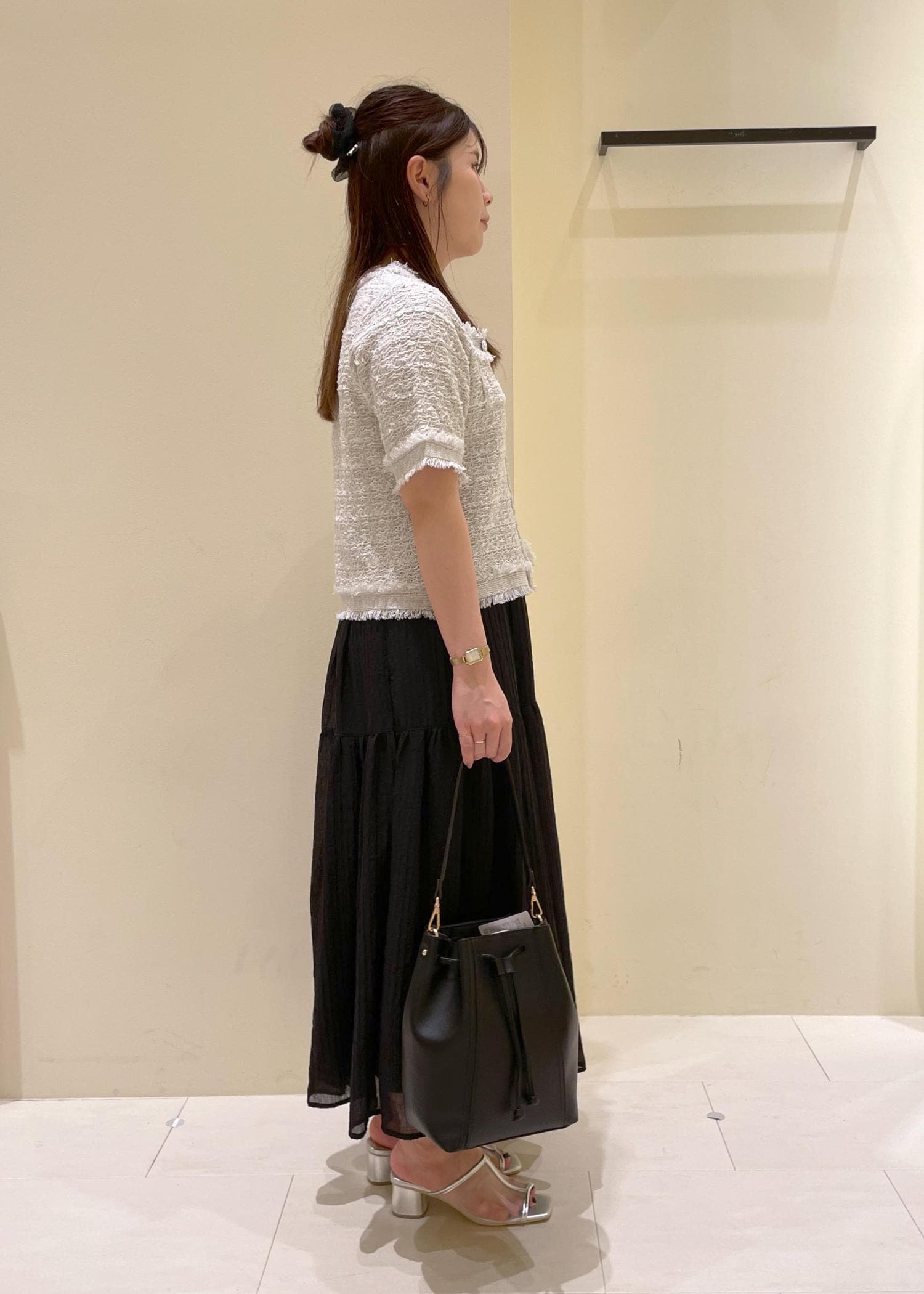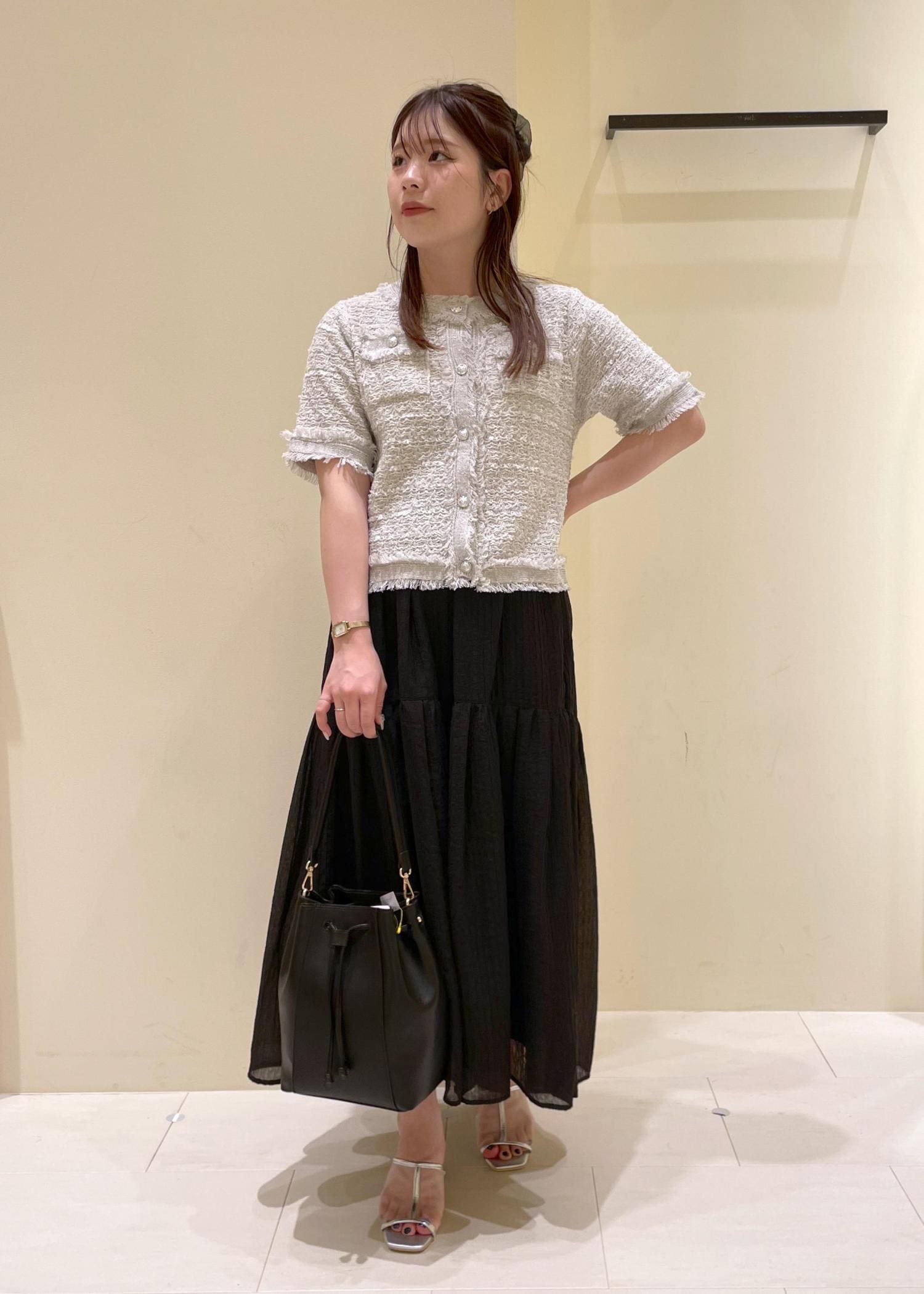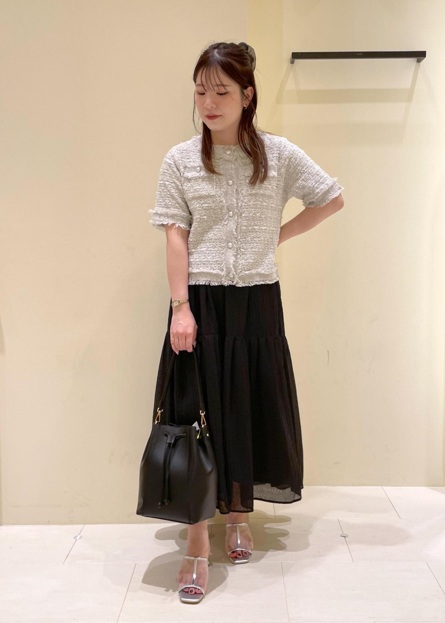 上品なツイードトップスにスカートと合わせてふんわりと。