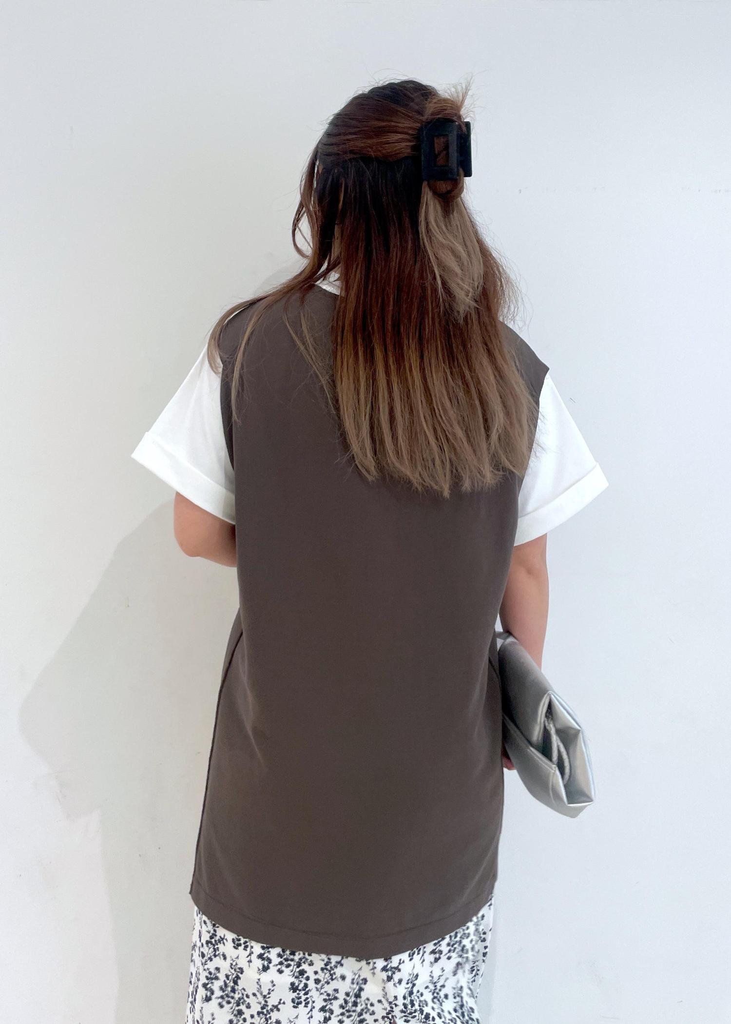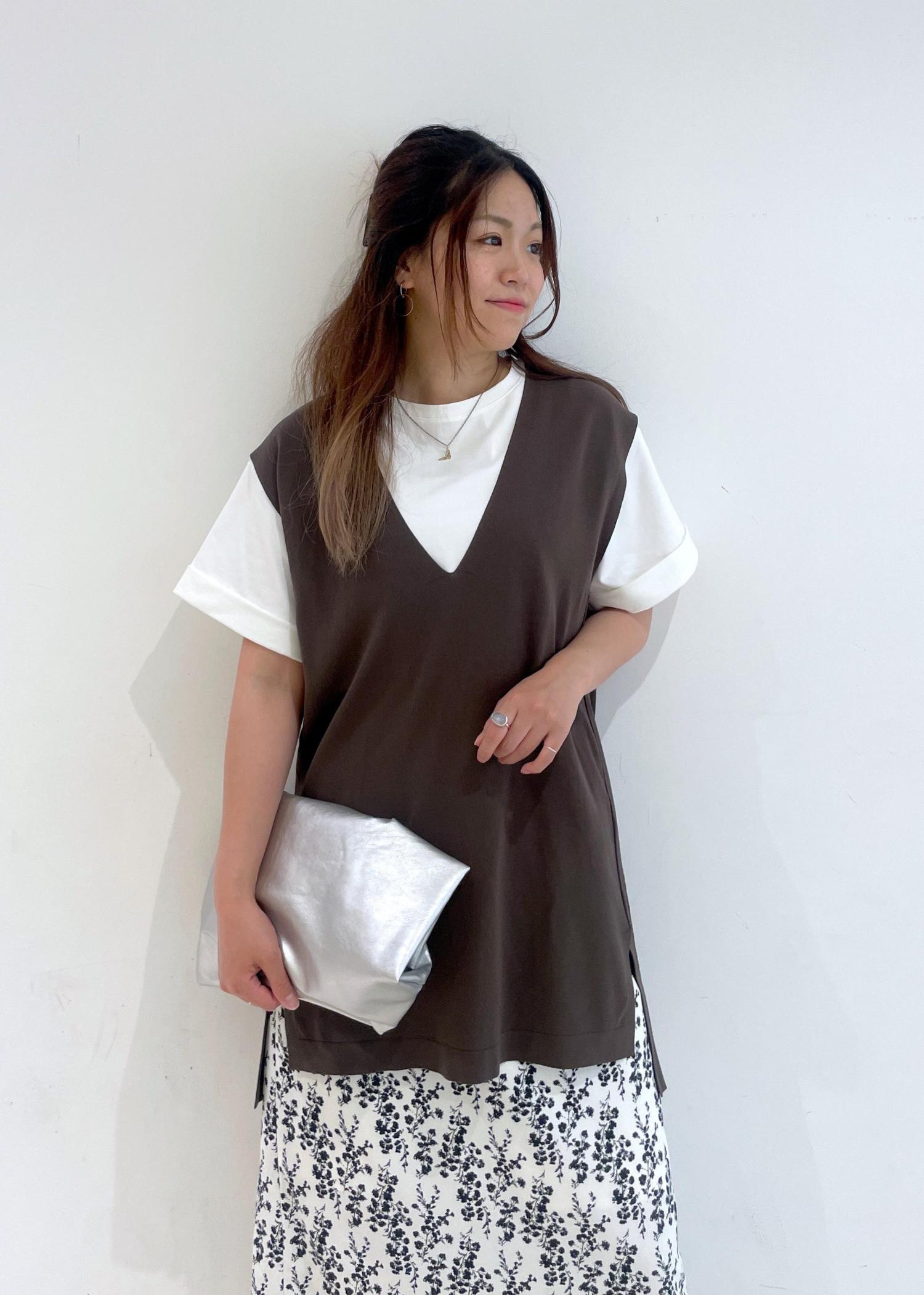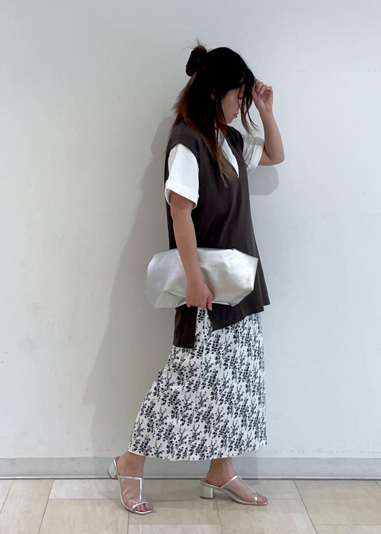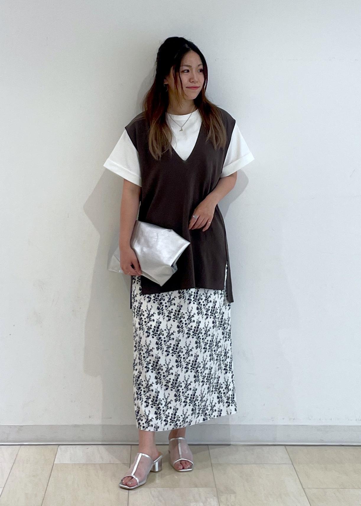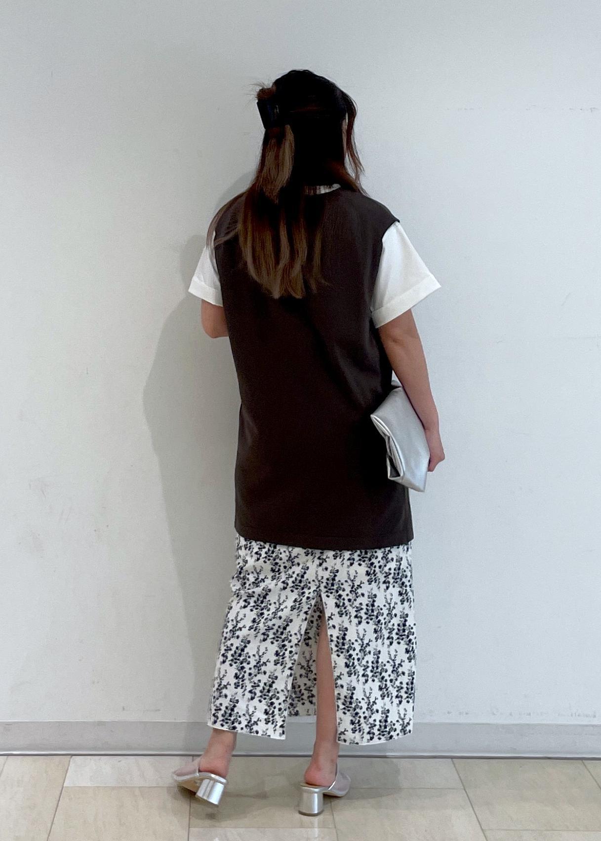 花柄のタイトスカートでスッキリシルエットを取り入れつつ、長めのベストを合わせて、気になるお腹〜腰周りをカバーしました!◎