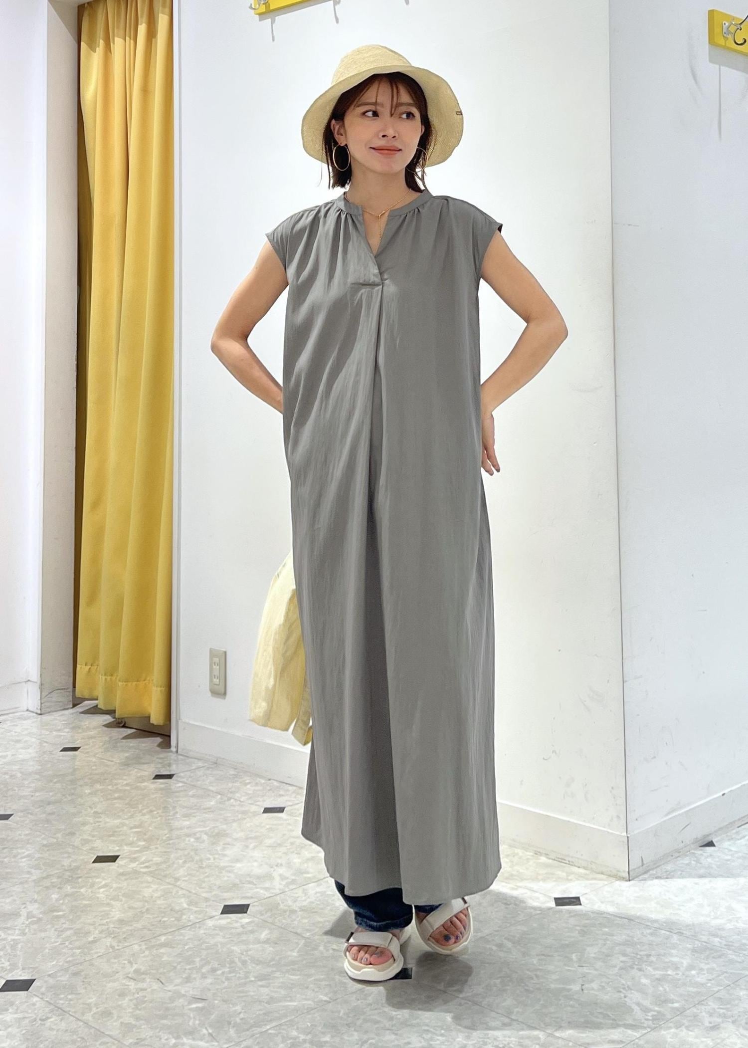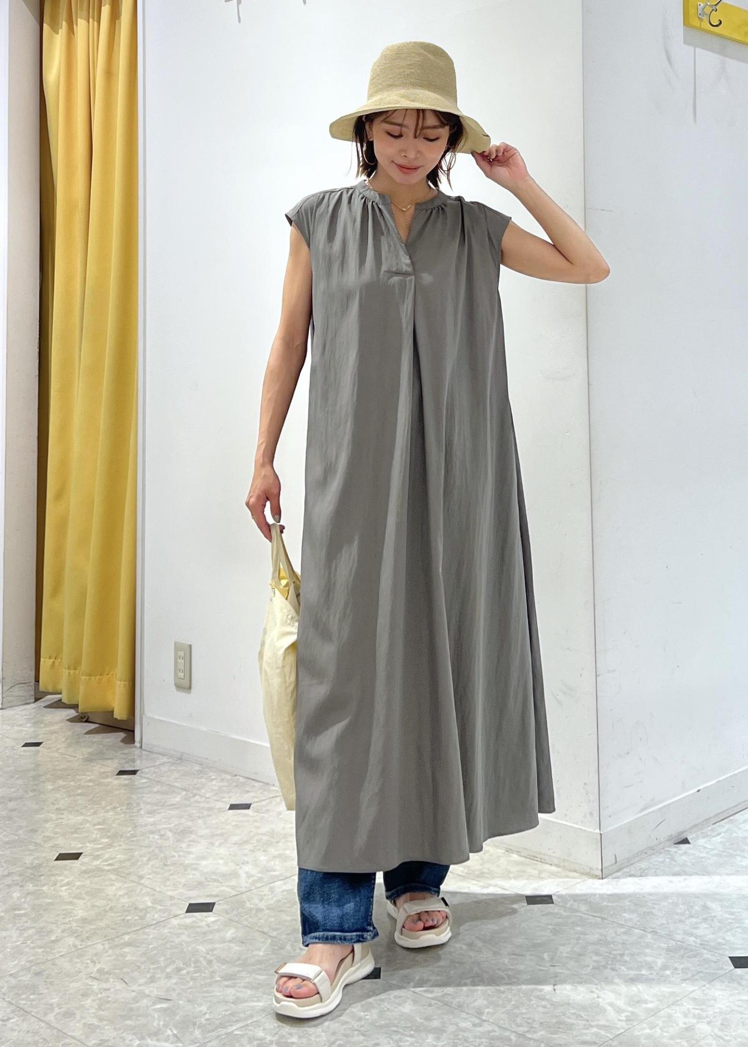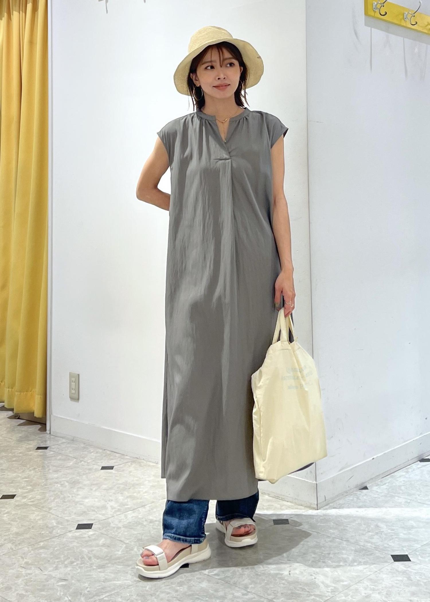 ゆったりシルエットのワンピースは、デニムパンツをレイヤードして夏のお出かけコーデに。