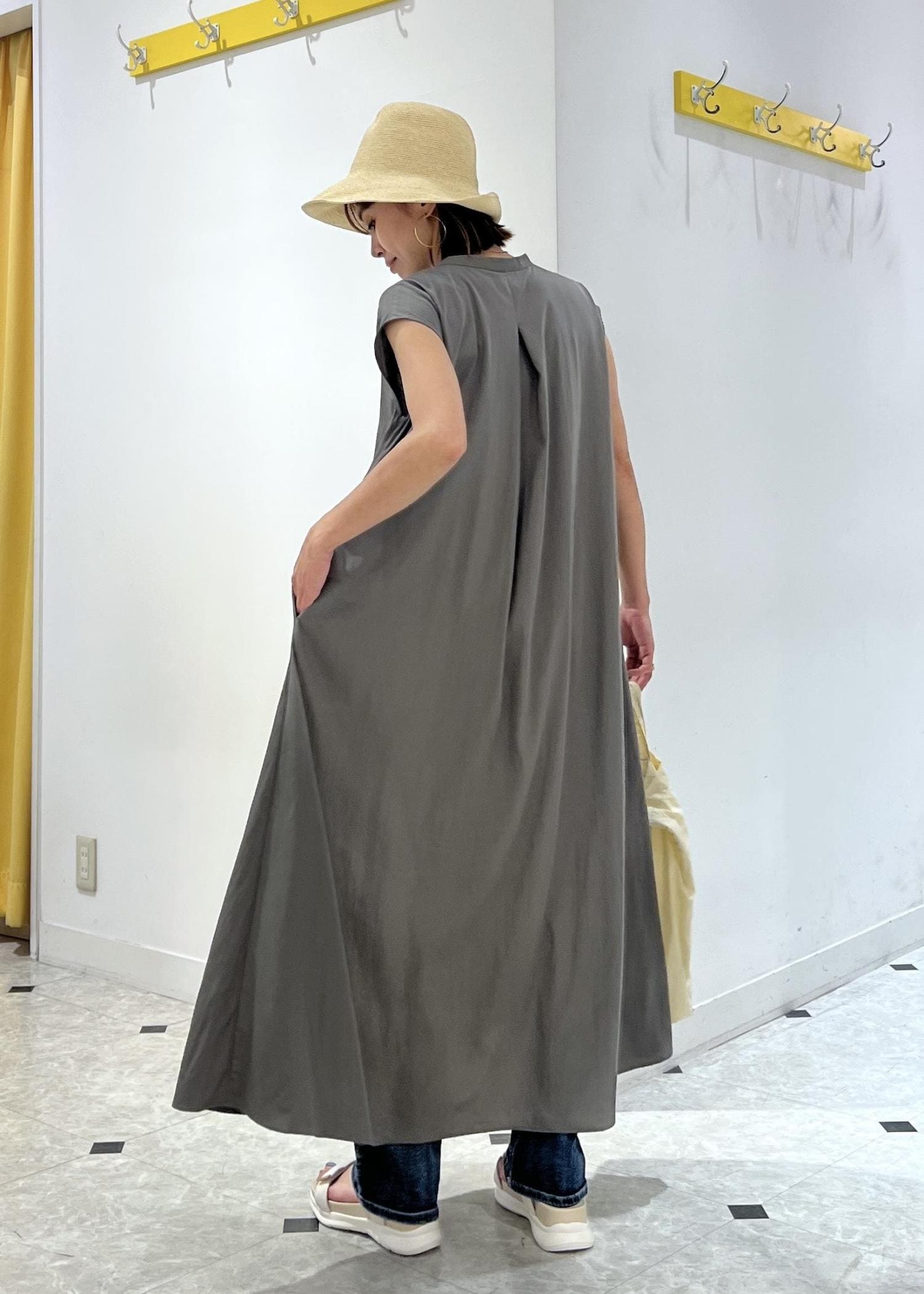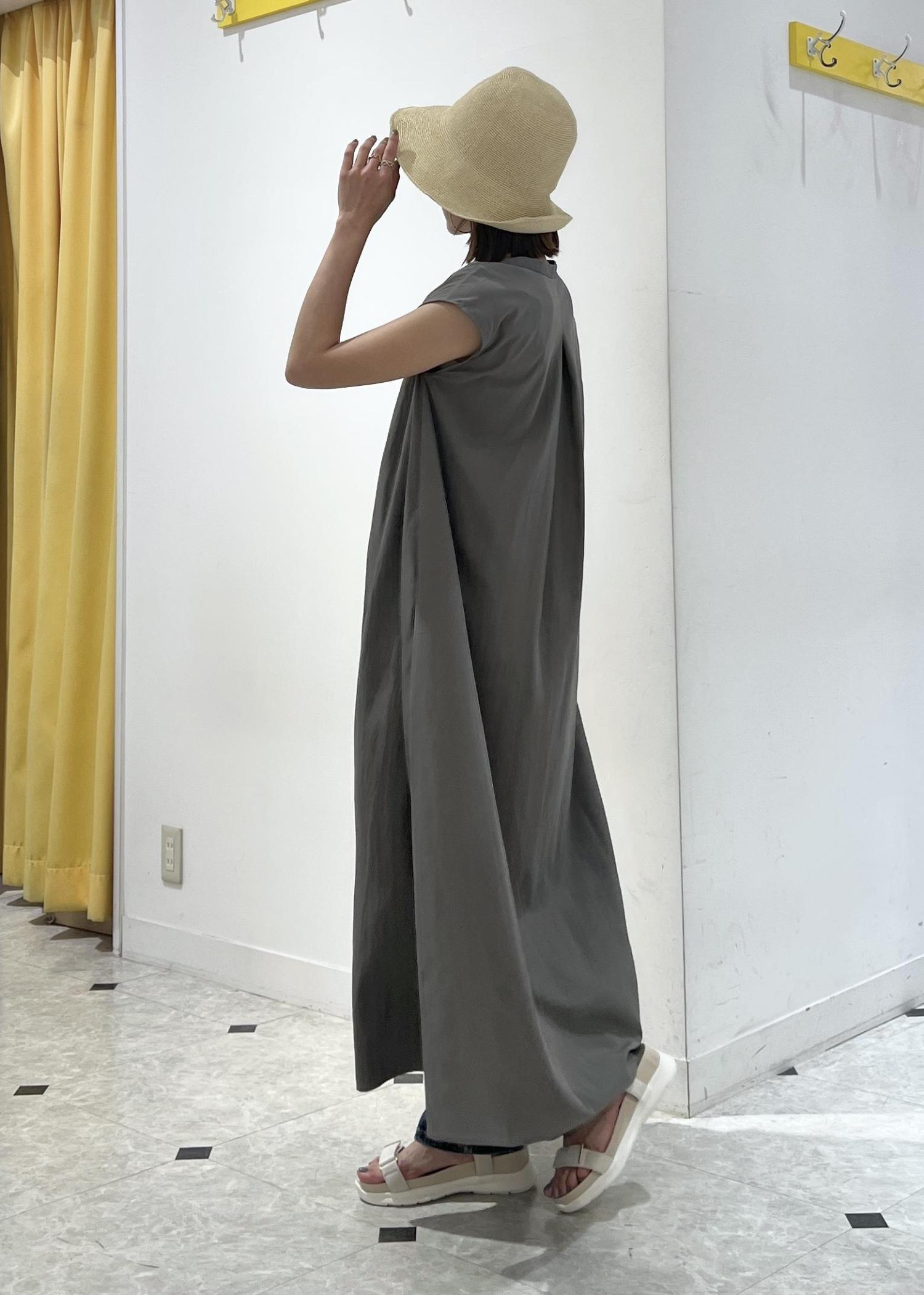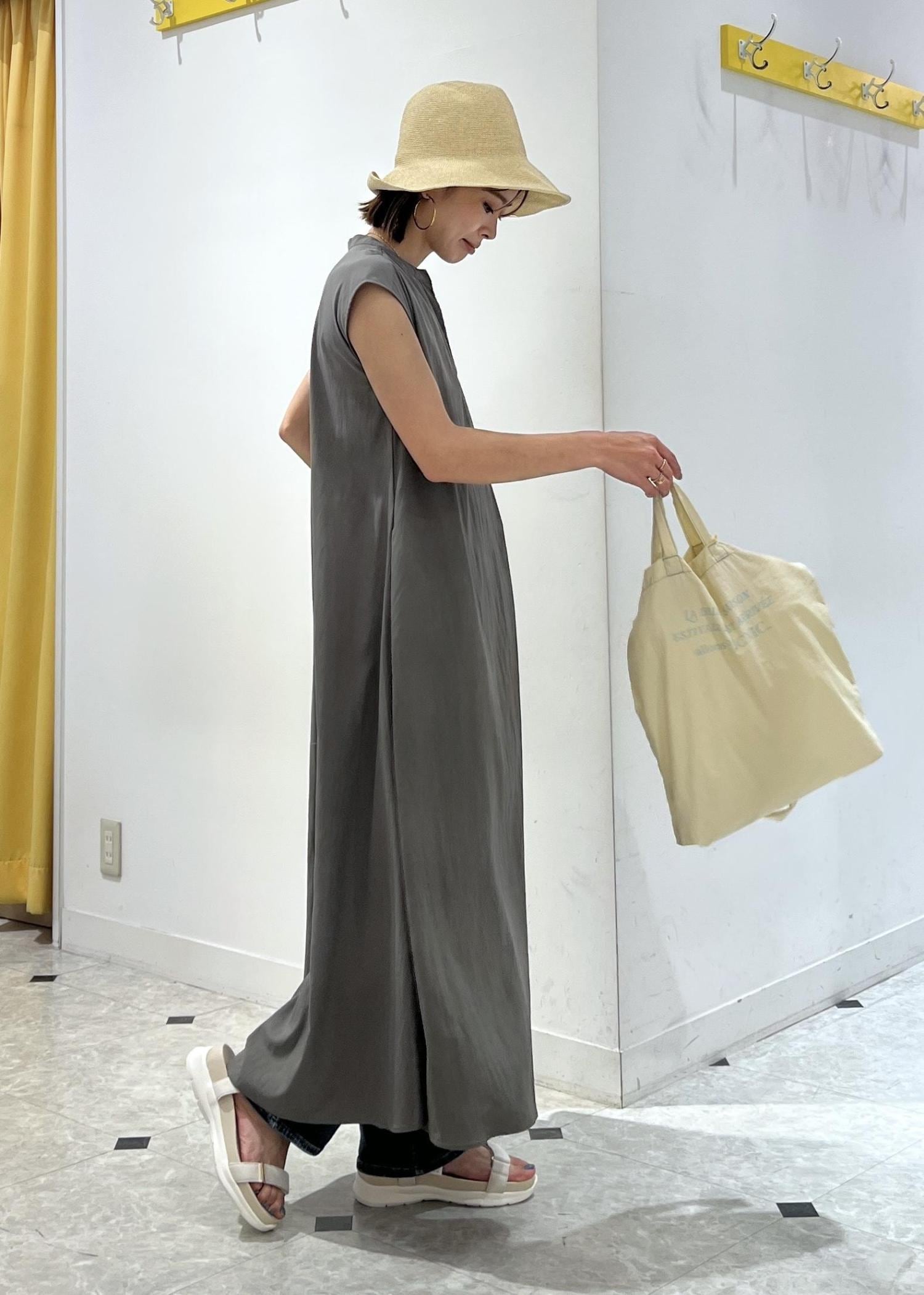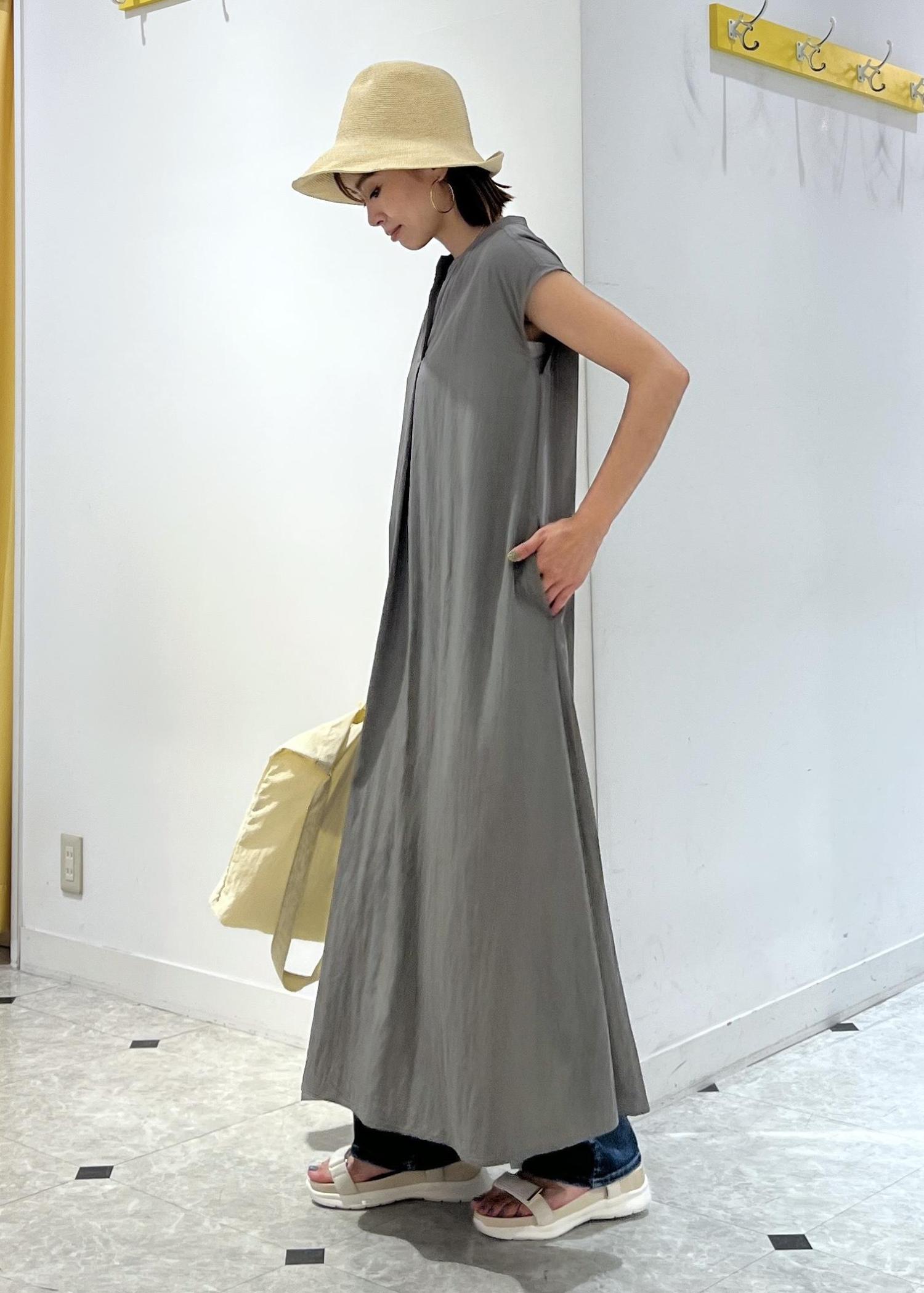 ゆったりシルエットのワンピースは、デニムパンツをレイヤードして夏のお出かけコーデに。