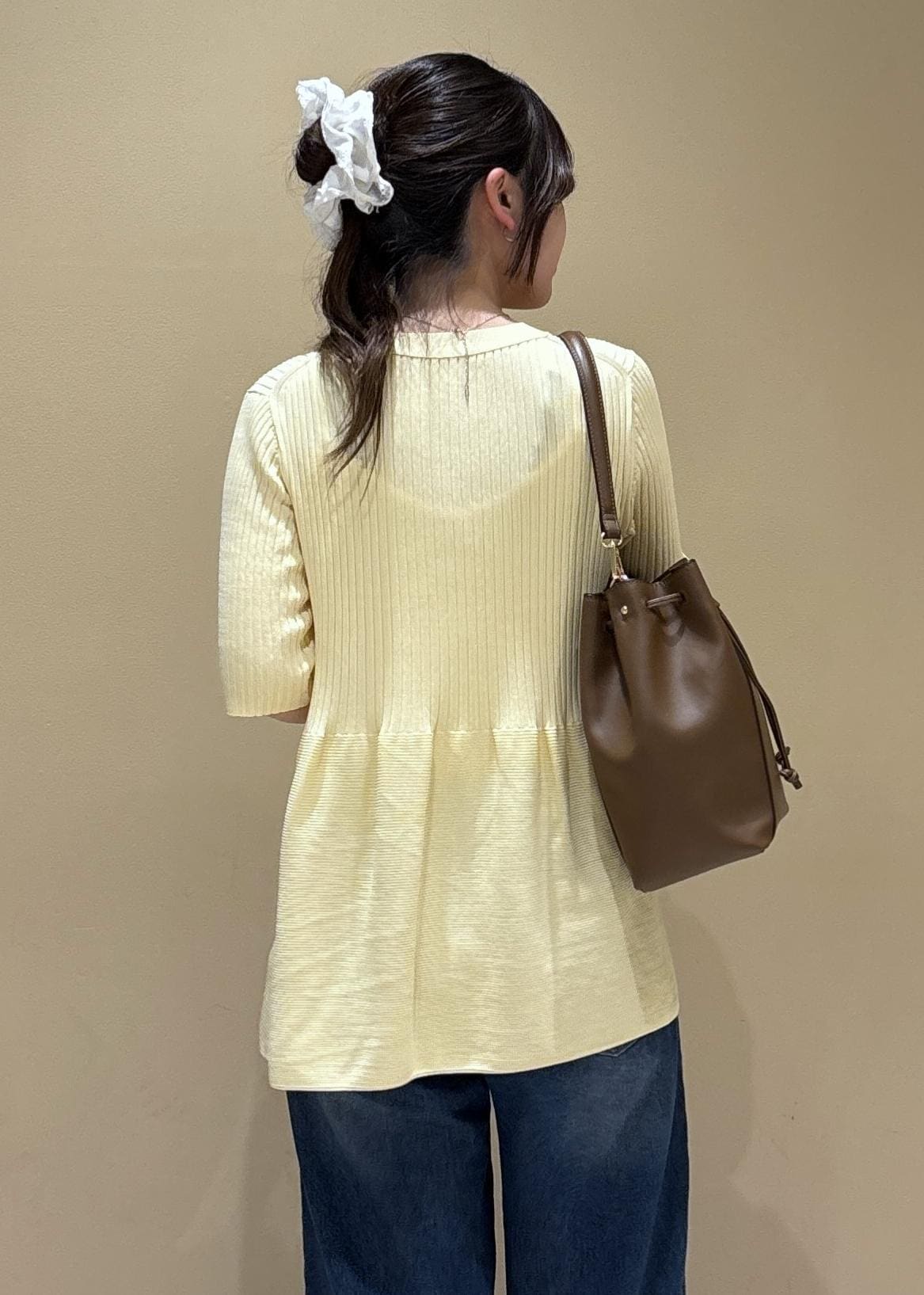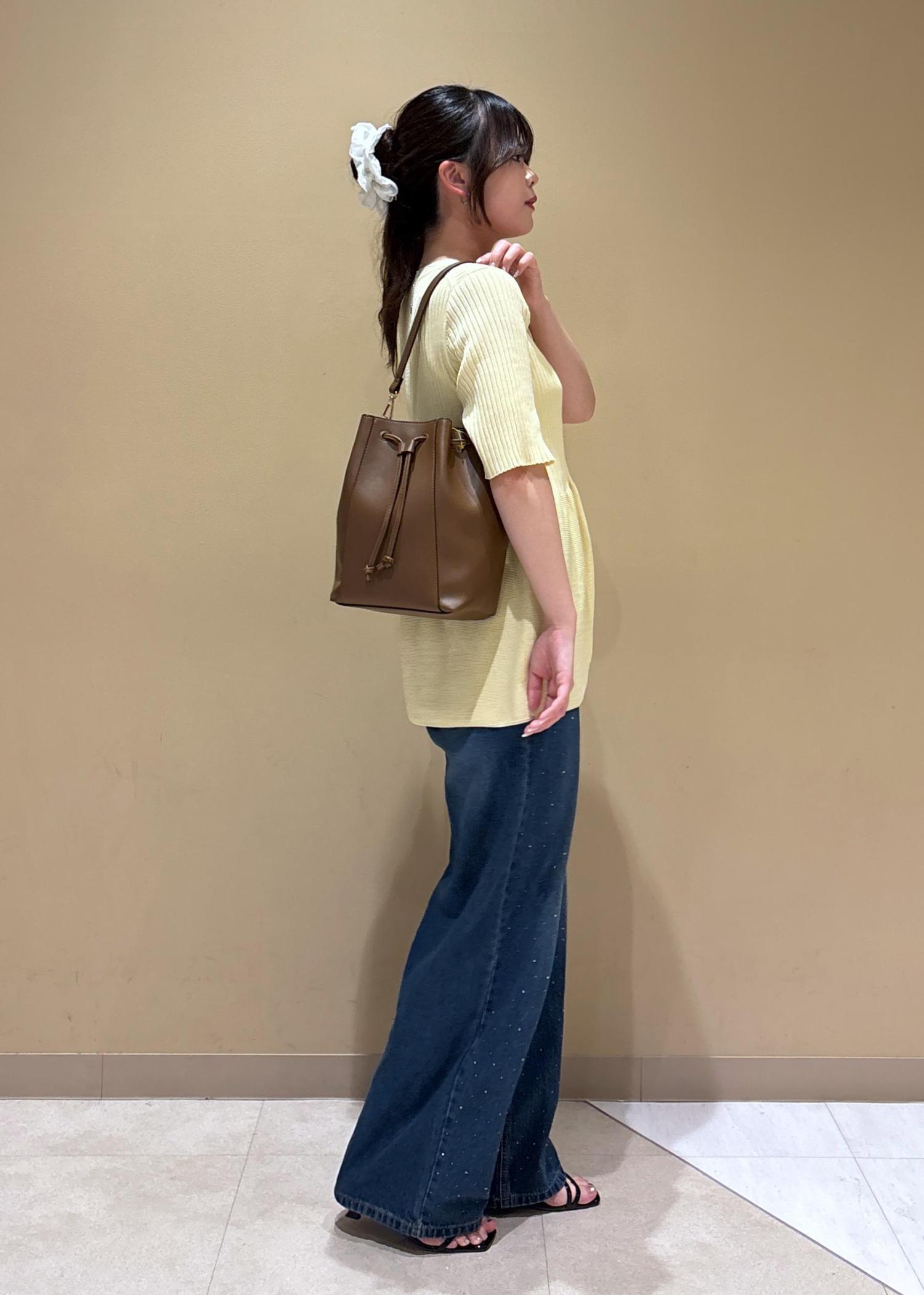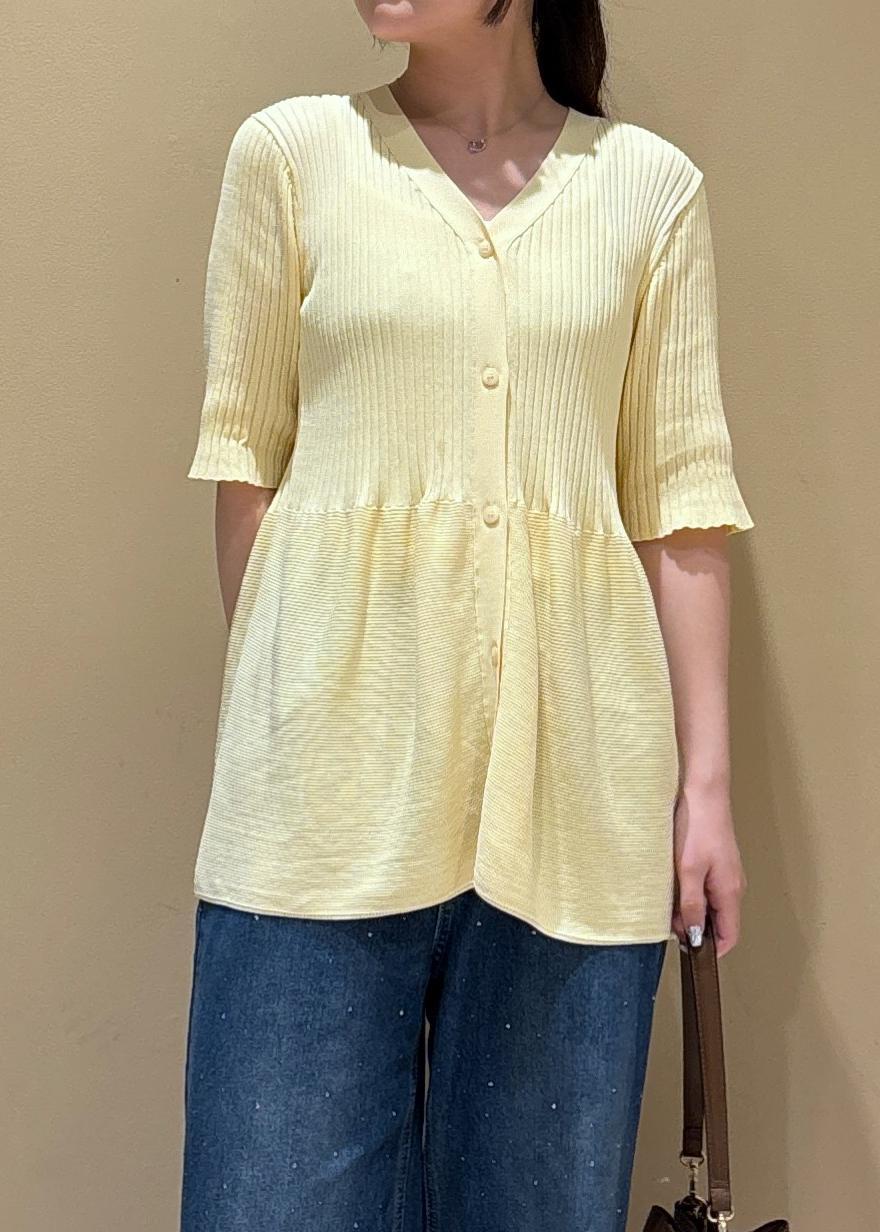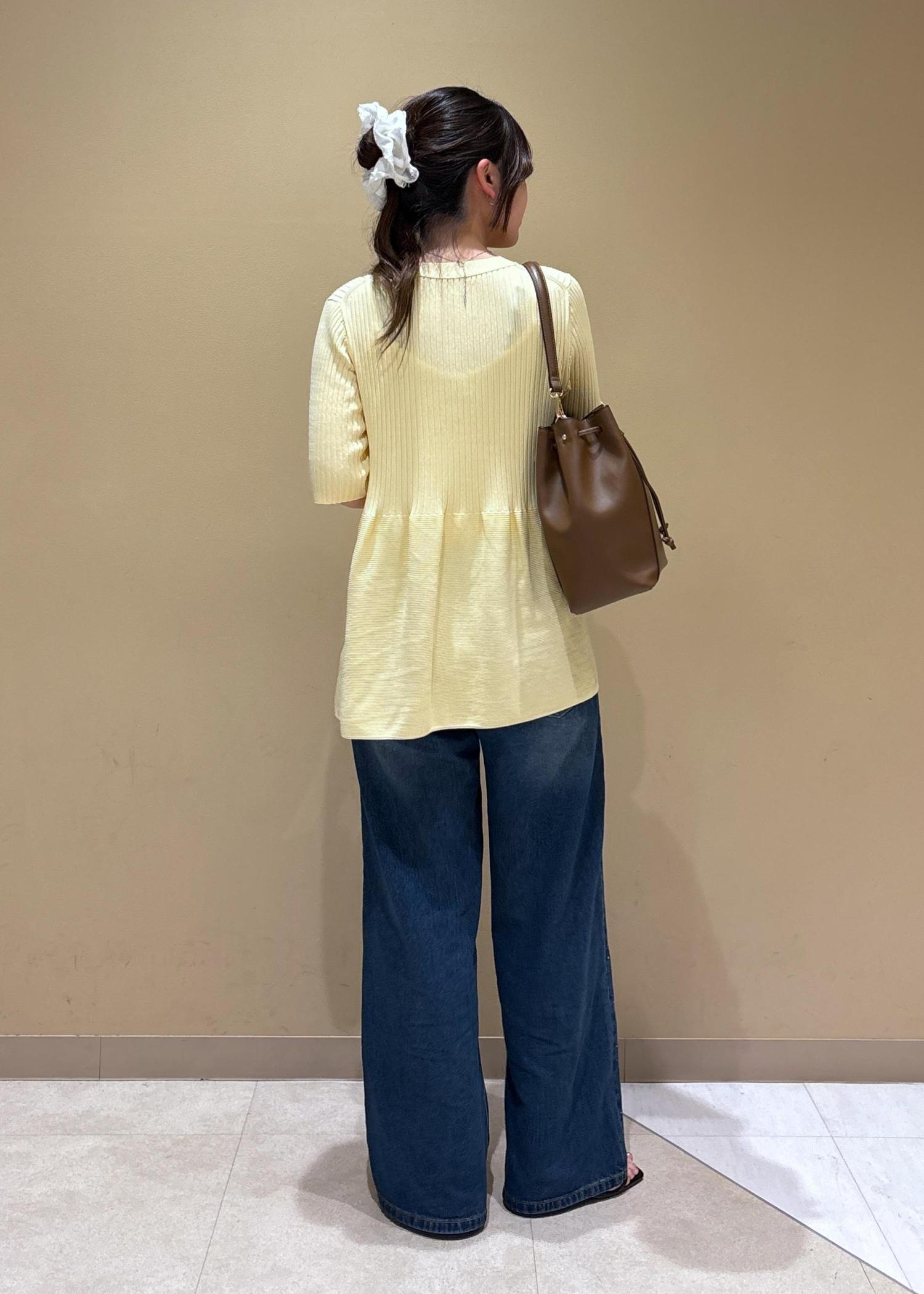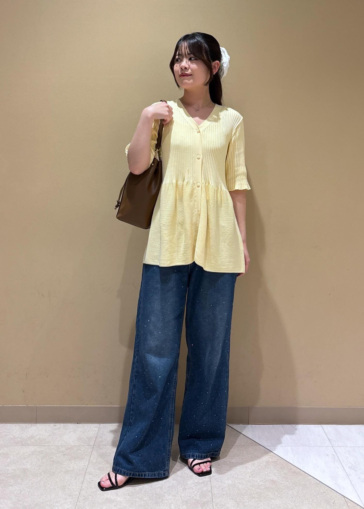 イエローのペプラムカーディガンを主役にした甘めカジュアルコーデ。定番デニムはビジューデザインを選んでトレンド感もプラスしました。