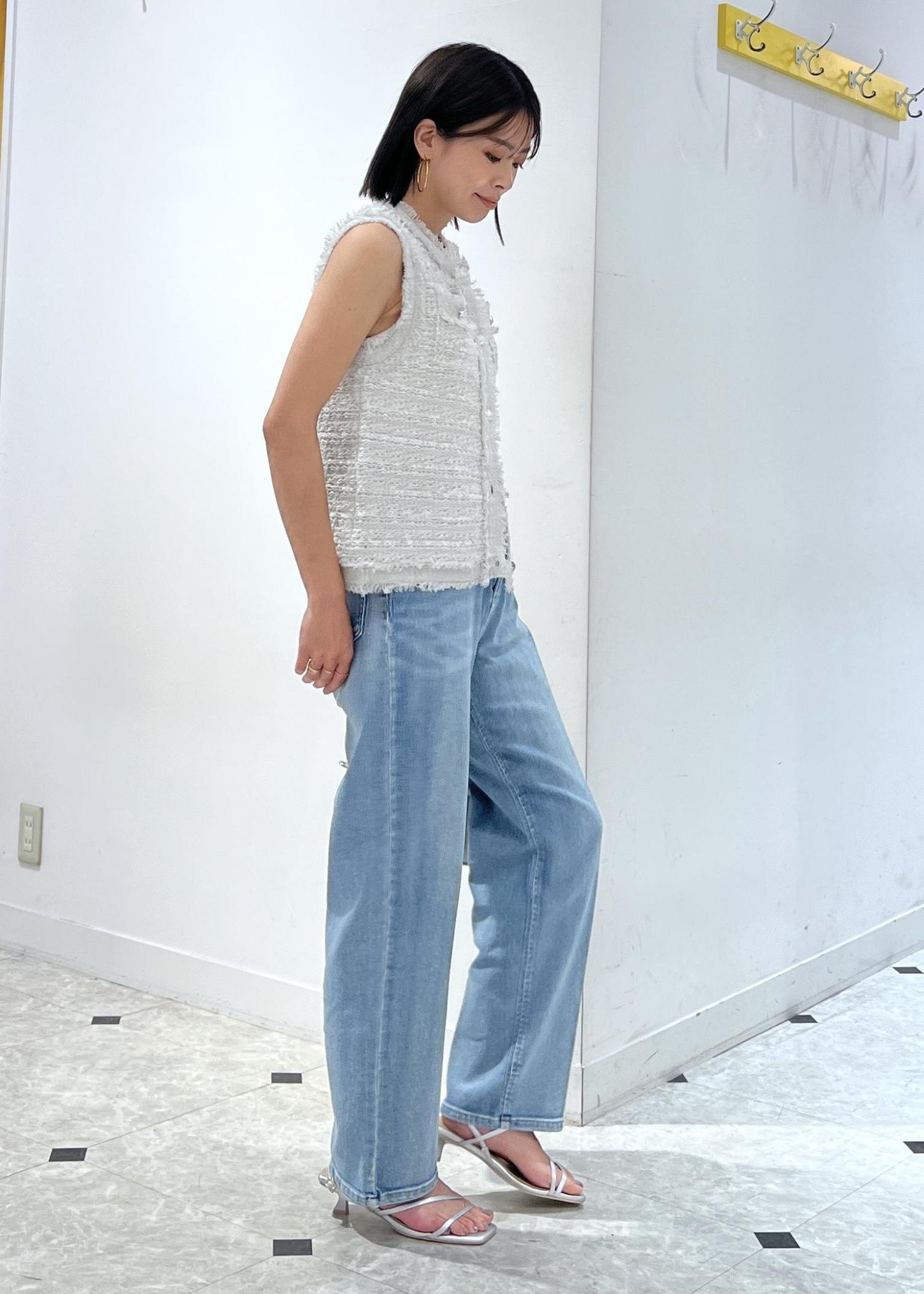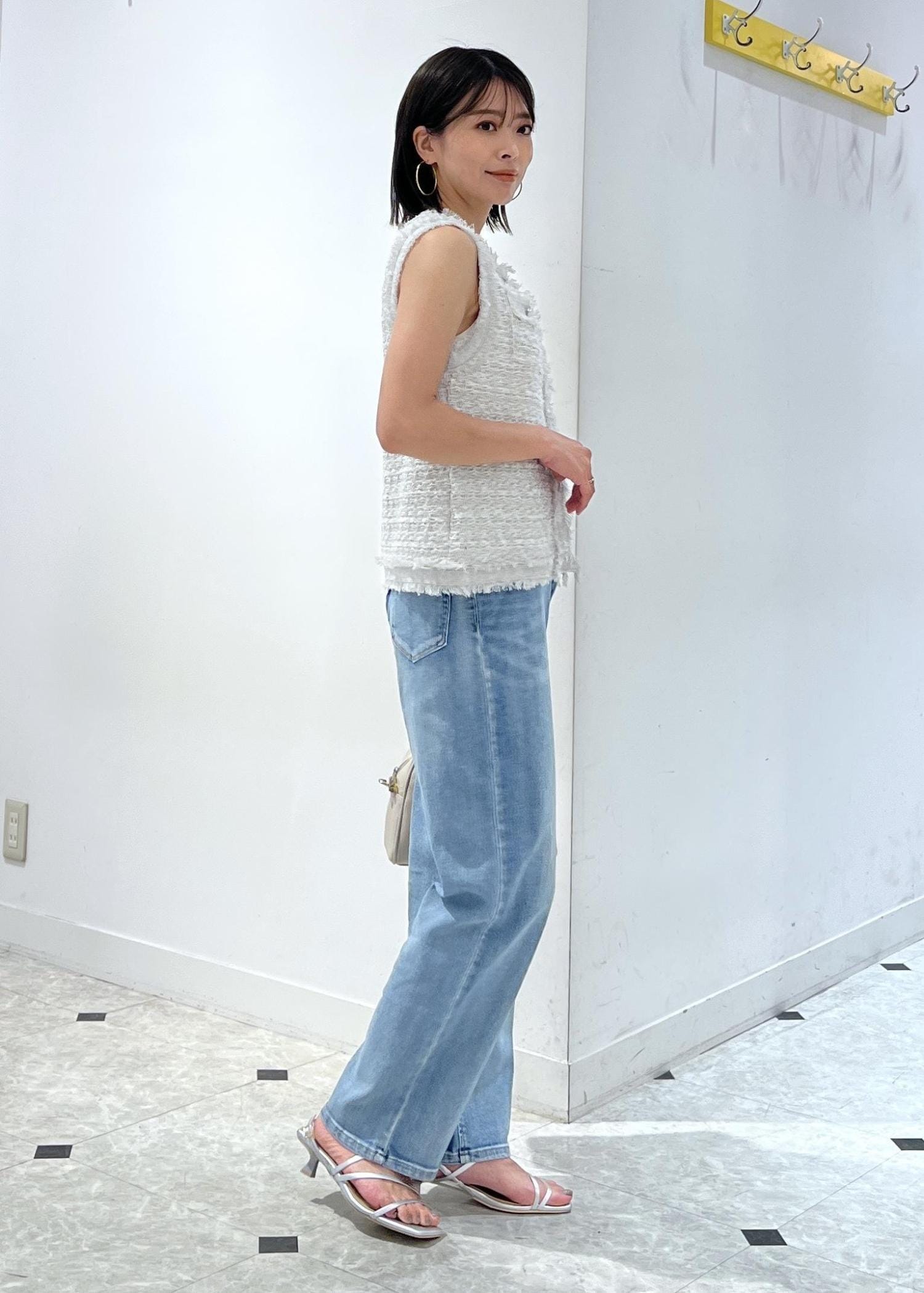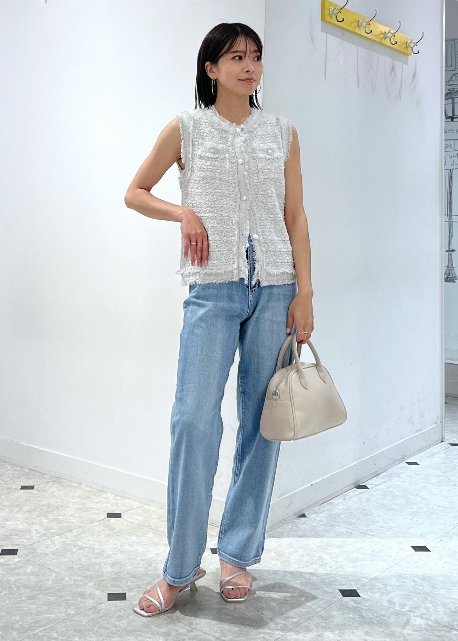 着丈の選べるツイードニットのジレは、デニムで合わせて大人カジュアルなスタイリングに。